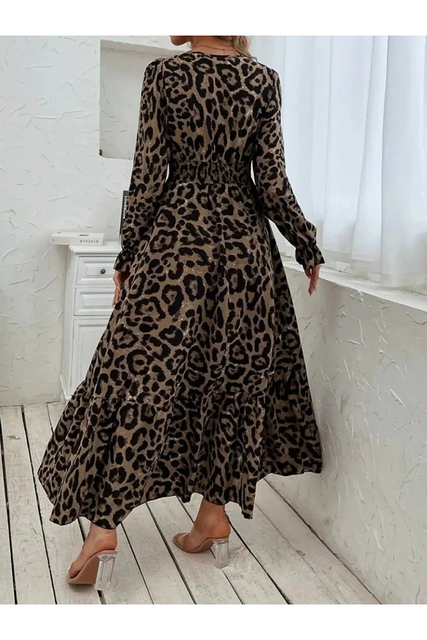 Kadın Uzun Kollu Kruvaze Yaka Leopar Desenli Uzun Süprem Elbise
