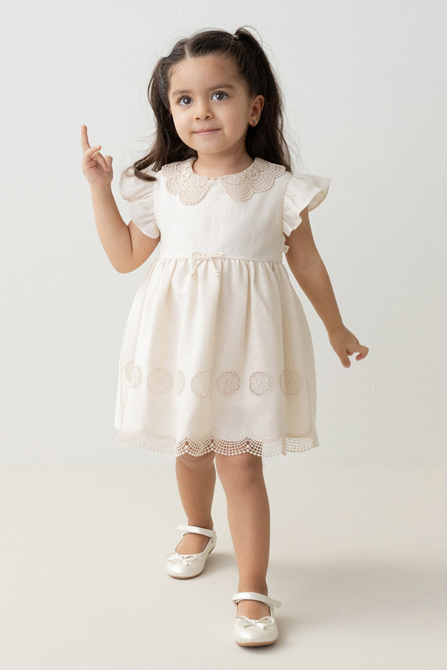 Yazlık Kısa Kollu Kolsuz Askılı Dantel Detaylı Astarlı Kız Çocuk Elbisesi: Küçük prensesinizin yaz mevsiminde özel günlerde zarafetini ve şıklığını ön plana çıkaracak bu elbise, önünde bulunan fiyonk detayı ve dantel işlemeleriyle tasarlanmıştır.; Ayrıca etek kısmında bulunan yırtmaç detayı, hareket özgürlüğü sağlarken bebeğinizin zarif bir görünüm sergilemesini sağlar.; Özellikler: Dantel Detaylar: Elbisenin ön kısmında ve kollarda bulunan dantel detaylar, zarafet ve incelik katarken, küçük prensesinizin görünümünü daha etkileyici hale getirir.; Önünde Fiyonk Detayı: Elbisenin ön kısmında bulunan fiyonk detayı, sevimliliği ve şıklığı artırır.; Küçük prensesinizin görünümüne hoş bir dokunuş ekler.; Yırtmaç Detayı: Etek kısmında bulunan yırtmaç detayı, hareket özgürlüğü sağlarken, elbisenin tasarımına dinamizm katar.; Kısa Kollu Tasarım: Sıcak yaz günlerinde rahatlıkla giyilebilecek kısa kollu tasarım, bebeğinizin serin kalmasını sağlar ve özgürce hareket etmesine olanak tanır.; Yazlık Kullanıma Uygun: Hafif yapısı ve nefes alabilen kumaşıyla yaz aylarında rahatlıkla giyilebilir.; Özel Günler İçin Uygun: Özel günlerde tercih edilebilecek şık tasarımıyla bebeğinizin her anında göz kamaştırmasını sağlar.; Bu yırtmaçlı, önü fiyonklu ve dantel detaylı kısa kollu Kolsuz Askılı kız çocuk elbisesi, küçük prensesinizin yazın serin ve şık kalmasını sağlarken, aynı zamanda özel günlerde de zarafetini tamamlar.; Zarif detaylarıyla bezenmiş bu elbise, bebeğinizin tarzını ve güzelliğini ön plana çıkarır.