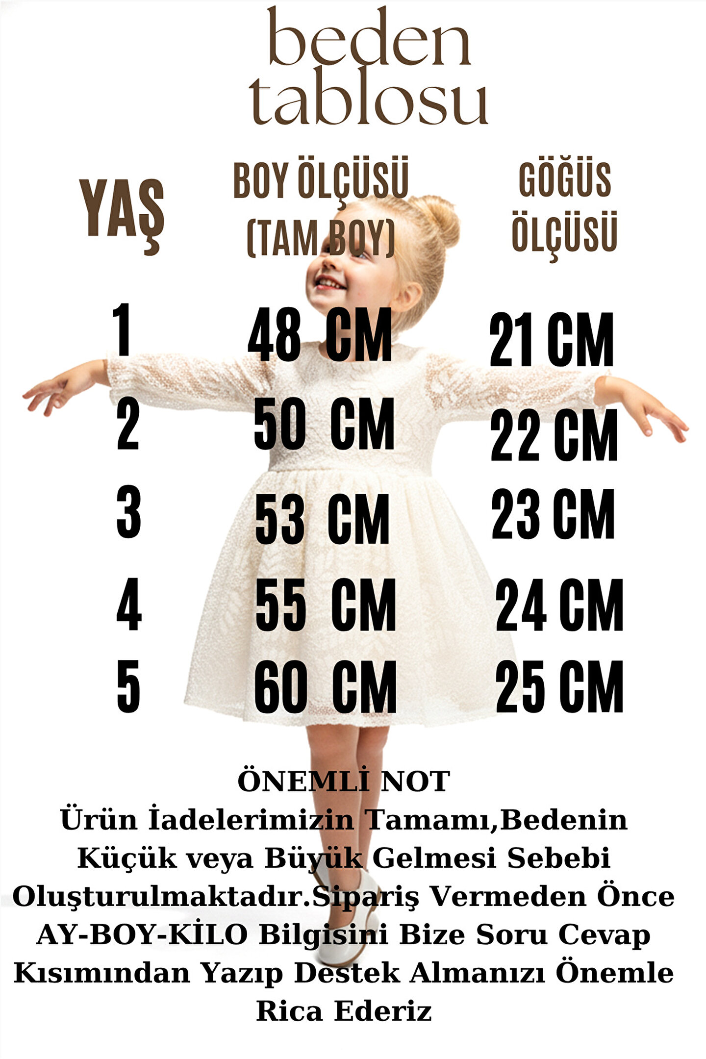 Mevsimlik Uzun Kollu Dantel Detaylı Kız Çocuk Elbisesi: Küçük prensesinizin özel günlerde zarafetini ve şıklığını ön plana çıkaracak bu elbise, önünde bulunan Yakalı fiyonk detayı ve dantel işlemeleriyle tasarlanmıştır.; Özellikler: Dantel Detaylar: Elbisenin ön kısmında ve kollarda bulunan dantel detaylar, zarafet ve incelik katarken, küçük prensesinizin görünümünü daha etkileyici hale getirir.; Önünde Yakalı Fiyonk Detayı: Elbisenin ön kısmında bulunan fiyonk detayı, sevimliliği ve şıklığı artırır.; Küçük prensesinizin görünümüne hoş bir dokunuş ekler.; Uzun Kollu Tasarım:Rahatlıkla giyilebilecek Uzun kollu tasarım, bebeğinizin serin kalmasını sağlar ve özgürce hareket etmesine olanak tanır.; Mevsimlik Kullanıma Uygun: Hafif yapısı ve nefes alabilen kumaşıyla rahatlıkla giyilebilir.; Özel Günler İçin Uygun: Özel günlerde tercih edilebilecek şık tasarımıyla bebeğinizin her anında göz kamaştırmasını sağlar.; Bu önü Yakalı fiyonklu ve dantel detaylı Uzun kollu kız çocuk elbisesi, küçük prensesinizin şık kalmasını sağlarken, aynı zamanda özel günlerde de zarafetini tamamlar.; Zarif detaylarıyla bezenmiş bu elbise, bebeğinizin tarzını ve güzelliğini ön plana çıkarır.