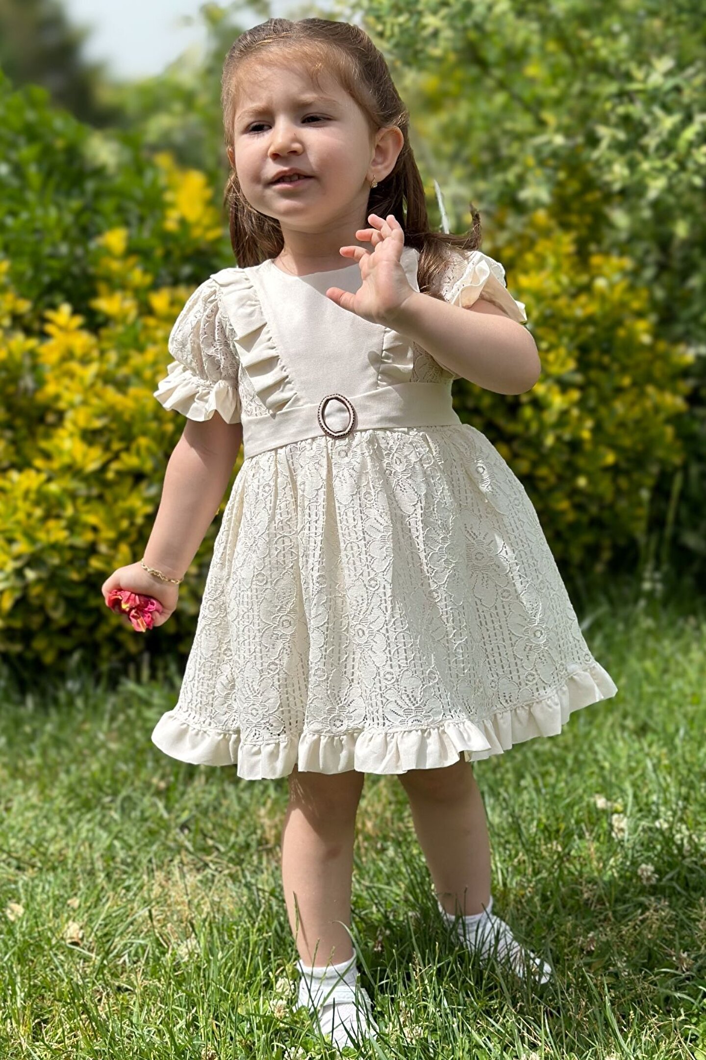 Yazlık Kısa Kollu Dantel Detaylı Kız Çocuk Elbisesi: Küçük prensesinizin yaz mevsiminde özel günlerde zarafetini ve şıklığını ön plana çıkaracak bu elbise, önünde bulunan fiyonk detayı ve dantel işlemeleriyle tasarlanmıştır. ; Ayrıca etek kısmında bulunan yırtmaç detayı, hareket özgürlüğü sağlarken bebeğinizin zarif bir görünüm sergilemesini sağlar. ; Özellikler: Dantel Detaylar: Elbisenin ön kısmında ve kollarda bulunan dantel detaylar, zarafet ve incelik katarken, küçük prensesinizin görünümünü daha etkileyici hale getirir. ; Önünde Fiyonk Detayı: Elbisenin ön kısmında bulunan fiyonk detayı, sevimliliği ve şıklığı artırır. ; Küçük prensesinizin görünümüne hoş bir dokunuş ekler. ; Yırtmaç Detayı: Etek kısmında bulunan yırtmaç detayı, hareket özgürlüğü sağlarken, elbisenin tasarımına dinamizm katar. ; Kısa Kollu Tasarım: Sıcak yaz günlerinde rahatlıkla giyilebilecek kısa kollu tasarım, bebeğinizin serin kalmasını sağlar ve özgürce hareket etmesine olanak tanır. ; Yazlık Kullanıma Uygun: Hafif yapısı ve nefes alabilen kumaşıyla yaz aylarında rahatlıkla giyilebilir. ; Özel Günler İçin Uygun: Özel günlerde tercih edilebilecek şık tasarımıyla bebeğinizin her anında göz kamaştırmasını sağlar. ; Bu yırtmaçlı, önü fiyonklu ve dantel detaylı kısa kollu kız çocuk elbisesi, küçük prensesinizin yazın serin ve şık kalmasını sağlarken, aynı zamanda özel günlerde de zarafetini tamamlar. ; Zarif detaylarıyla bezenmiş bu elbise, bebeğinizin tarzını ve güzelliğini ön plana çıkarır.;