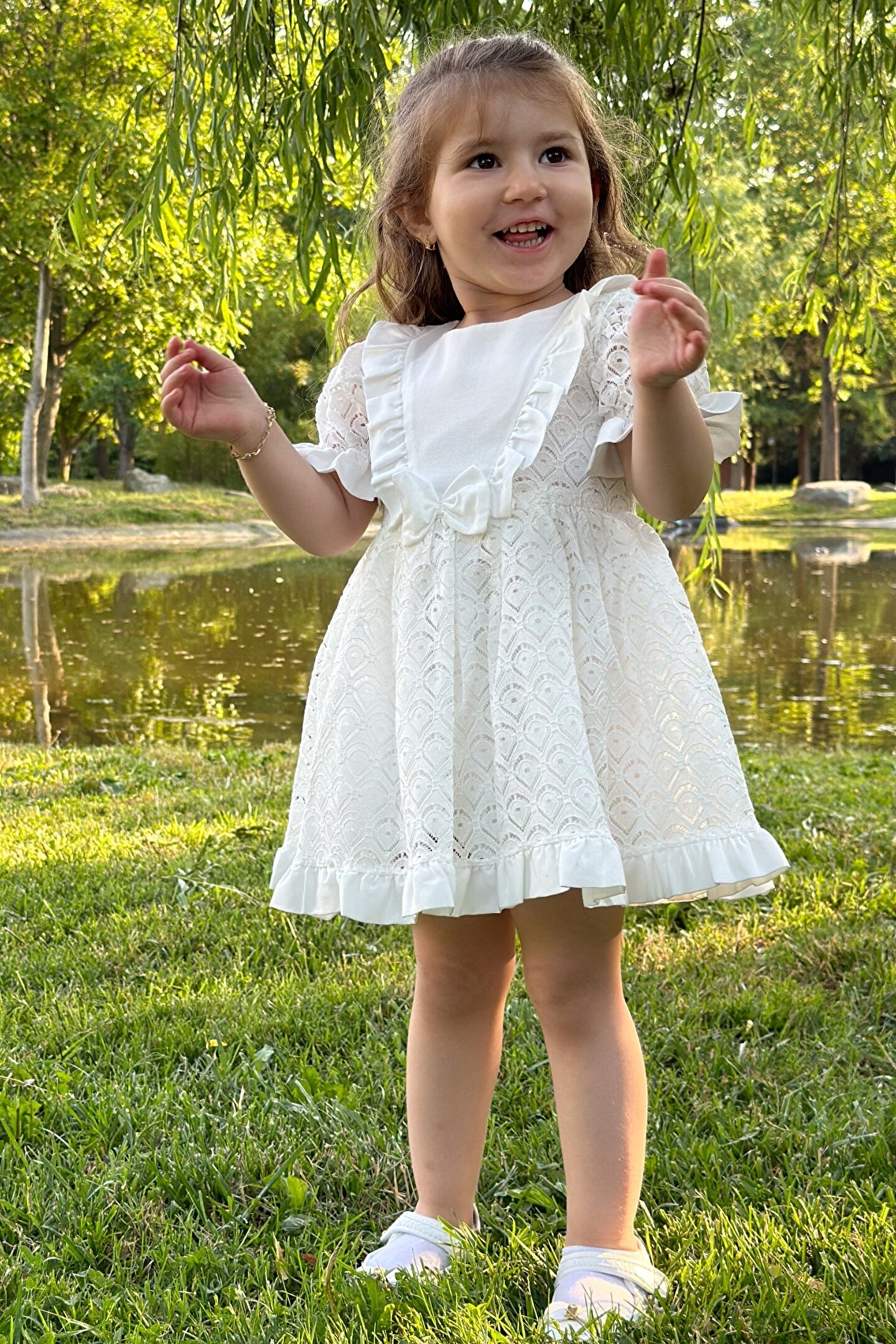 Yazlık Kısa Kollu Dantel Detaylı Kız Çocuk Elbisesi: Küçük prensesinizin yaz mevsiminde özel günlerde zarafetini ve şıklığını ön plana çıkaracak bu elbise, önünde bulunan fiyonk detayı ve dantel işlemeleriyle tasarlanmıştır. ; Ayrıca etek kısmında bulunan yırtmaç detayı, hareket özgürlüğü sağlarken bebeğinizin zarif bir görünüm sergilemesini sağlar. ; Özellikler: Dantel Detaylar: Elbisenin ön kısmında ve kollarda bulunan dantel detaylar, zarafet ve incelik katarken, küçük prensesinizin görünümünü daha etkileyici hale getirir. ; Önünde Fiyonk Detayı: Elbisenin ön kısmında bulunan fiyonk detayı, sevimliliği ve şıklığı artırır. ; Küçük prensesinizin görünümüne hoş bir dokunuş ekler. ; Yırtmaç Detayı: Etek kısmında bulunan yırtmaç detayı, hareket özgürlüğü sağlarken, elbisenin tasarımına dinamizm katar. ; Kısa Kollu Tasarım: Sıcak yaz günlerinde rahatlıkla giyilebilecek kısa kollu tasarım, bebeğinizin serin kalmasını sağlar ve özgürce hareket etmesine olanak tanır. ; Yazlık Kullanıma Uygun: Hafif yapısı ve nefes alabilen kumaşıyla yaz aylarında rahatlıkla giyilebilir. ; Özel Günler İçin Uygun: Özel günlerde tercih edilebilecek şık tasarımıyla bebeğinizin her anında göz kamaştırmasını sağlar. ; Bu yırtmaçlı, önü fiyonklu ve dantel detaylı kısa kollu kız çocuk elbisesi, küçük prensesinizin yazın serin ve şık kalmasını sağlarken, aynı zamanda özel günlerde de zarafetini tamamlar. ; Zarif detaylarıyla bezenmiş bu elbise, bebeğinizin tarzını ve güzelliğini ön plana çıkarır.;