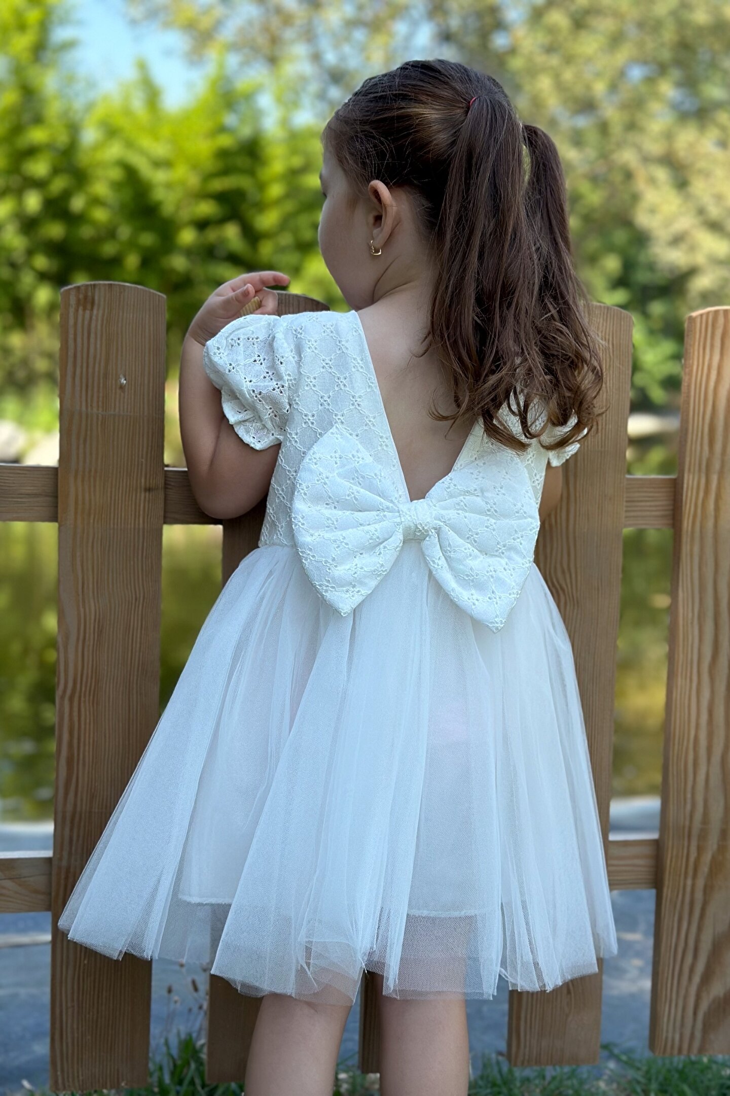 Yazlık Kısa Kollu Dantel Detaylı Kız Çocuk Elbisesi: Küçük prensesinizin yaz mevsiminde özel günlerde zarafetini ve şıklığını ön plana çıkaracak bu elbise, önünde bulunan fiyonk detayı ve dantel işlemeleriyle tasarlanmıştır.; Ayrıca etek kısmında bulunan yırtmaç detayı, hareket özgürlüğü sağlarken bebeğinizin zarif bir görünüm sergilemesini sağlar.; Özellikler: Dantel Detaylar: Elbisenin ön kısmında ve kollarda bulunan dantel detaylar, zarafet ve incelik katarken, küçük prensesinizin görünümünü daha etkileyici hale getirir.; Önünde Fiyonk Detayı: Elbisenin ön kısmında bulunan fiyonk detayı, sevimliliği ve şıklığı artırır.; Küçük prensesinizin görünümüne hoş bir dokunuş ekler.; Yırtmaç Detayı: Etek kısmında bulunan yırtmaç detayı, hareket özgürlüğü sağlarken, elbisenin tasarımına dinamizm katar.; Kısa Kollu Tasarım: Sıcak yaz günlerinde rahatlıkla giyilebilecek kısa kollu tasarım, bebeğinizin serin kalmasını sağlar ve özgürce hareket etmesine olanak tanır.; Yazlık Kullanıma Uygun: Hafif yapısı ve nefes alabilen kumaşıyla yaz aylarında rahatlıkla giyilebilir.; Özel Günler İçin Uygun: Özel günlerde tercih edilebilecek şık tasarımıyla bebeğinizin her anında göz kamaştırmasını sağlar.; Bu yırtmaçlı, önü fiyonklu ve dantel detaylı kısa kollu kız çocuk elbisesi, küçük prensesinizin yazın serin ve şık kalmasını sağlarken, aynı zamanda özel günlerde de zarafetini tamamlar.; Zarif detaylarıyla bezenmiş bu elbise, bebeğinizin tarzını ve güzelliğini ön plana çıkarır.