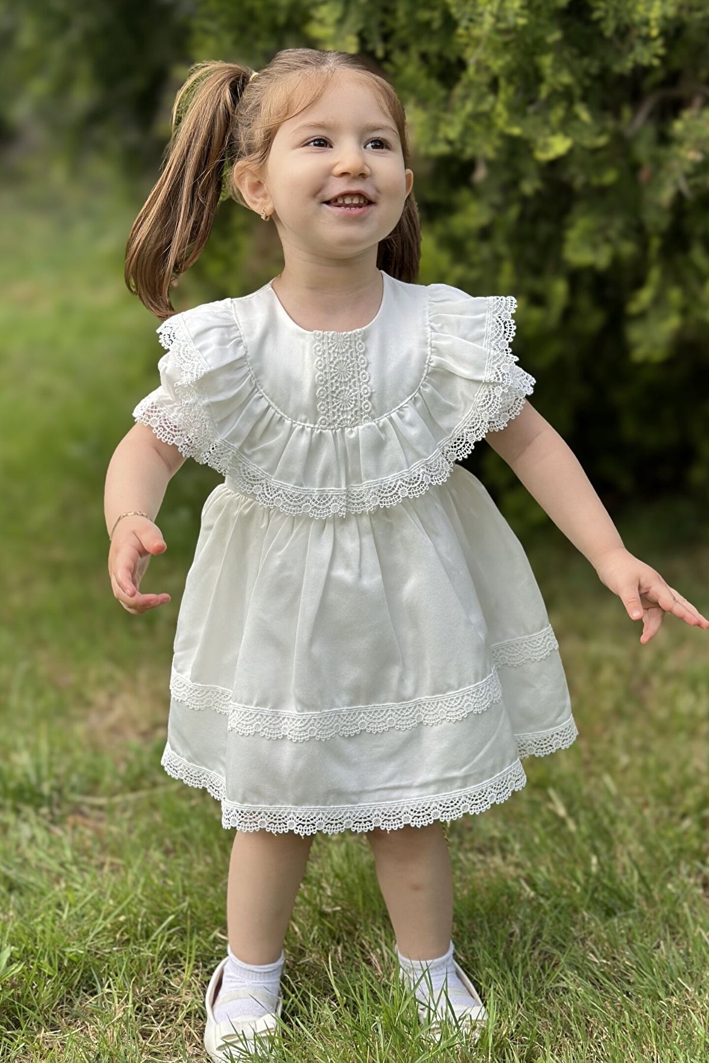 Yazlık Kısa Kollu Dantel Detaylı Kız Çocuk Elbisesi: Küçük prensesinizin yaz mevsiminde özel günlerde zarafetini ve şıklığını ön plana çıkaracak bu elbise, önünde bulunan fiyonk detayı ve dantel işlemeleriyle tasarlanmıştır. ; Ayrıca etek kısmında bulunan yırtmaç detayı, hareket özgürlüğü sağlarken bebeğinizin zarif bir görünüm sergilemesini sağlar. ; Özellikler: Dantel Detaylar: Elbisenin ön kısmında ve kollarda bulunan dantel detaylar, zarafet ve incelik katarken, küçük prensesinizin görünümünü daha etkileyici hale getirir. ; Önünde Fiyonk Detayı: Elbisenin ön kısmında bulunan fiyonk detayı, sevimliliği ve şıklığı artırır. ; Küçük prensesinizin görünümüne hoş bir dokunuş ekler. ; Yırtmaç Detayı: Etek kısmında bulunan yırtmaç detayı, hareket özgürlüğü sağlarken, elbisenin tasarımına dinamizm katar. ; Kısa Kollu Tasarım: Sıcak yaz günlerinde rahatlıkla giyilebilecek kısa kollu tasarım, bebeğinizin serin kalmasını sağlar ve özgürce hareket etmesine olanak tanır. ; Yazlık Kullanıma Uygun: Hafif yapısı ve nefes alabilen kumaşıyla yaz aylarında rahatlıkla giyilebilir. ; Özel Günler İçin Uygun: Özel günlerde tercih edilebilecek şık tasarımıyla bebeğinizin her anında göz kamaştırmasını sağlar. ; Bu yırtmaçlı, önü fiyonklu ve dantel detaylı kısa kollu kız çocuk elbisesi, küçük prensesinizin yazın serin ve şık kalmasını sağlarken, aynı zamanda özel günlerde de zarafetini tamamlar. ; Zarif detaylarıyla bezenmiş bu elbise, bebeğinizin tarzını ve güzelliğini ön plana çıkarır.;
