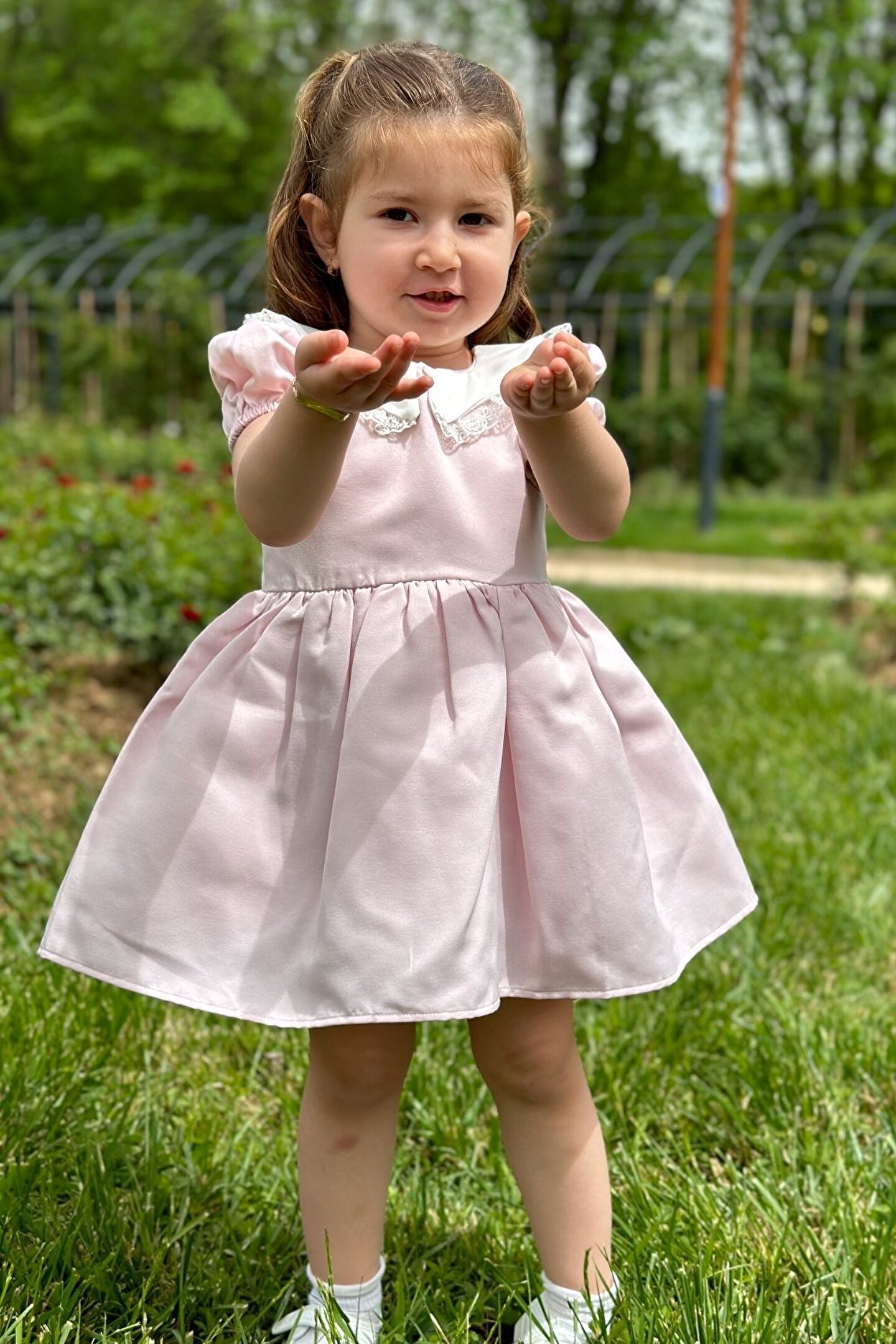 Yazlık Kısa Kollu Dantel Detaylı Kız Çocuk Elbisesi: Küçük prensesinizin yaz mevsiminde özel günlerde zarafetini ve şıklığını ön plana çıkaracak bu elbise, önünde bulunan fiyonk detayı ve dantel işlemeleriyle tasarlanmıştır. ; Ayrıca etek kısmında bulunan yırtmaç detayı, hareket özgürlüğü sağlarken bebeğinizin zarif bir görünüm sergilemesini sağlar. ; Özellikler: Dantel Detaylar: Elbisenin ön kısmında ve kollarda bulunan dantel detaylar, zarafet ve incelik katarken, küçük prensesinizin görünümünü daha etkileyici hale getirir. ; Önünde Fiyonk Detayı: Elbisenin ön kısmında bulunan fiyonk detayı, sevimliliği ve şıklığı artırır. ; Küçük prensesinizin görünümüne hoş bir dokunuş ekler. ; Yırtmaç Detayı: Etek kısmında bulunan yırtmaç detayı, hareket özgürlüğü sağlarken, elbisenin tasarımına dinamizm katar. ; Kısa Kollu Tasarım: Sıcak yaz günlerinde rahatlıkla giyilebilecek kısa kollu tasarım, bebeğinizin serin kalmasını sağlar ve özgürce hareket etmesine olanak tanır. ; Yazlık Kullanıma Uygun: Hafif yapısı ve nefes alabilen kumaşıyla yaz aylarında rahatlıkla giyilebilir. ; Özel Günler İçin Uygun: Özel günlerde tercih edilebilecek şık tasarımıyla bebeğinizin her anında göz kamaştırmasını sağlar. ; Bu yırtmaçlı, önü fiyonklu ve dantel detaylı kısa kollu kız çocuk elbisesi, küçük prensesinizin yazın serin ve şık kalmasını sağlarken, aynı zamanda özel günlerde de zarafetini tamamlar. ; Zarif detaylarıyla bezenmiş bu elbise, bebeğinizin tarzını ve güzelliğini ön plana çıkarır.;