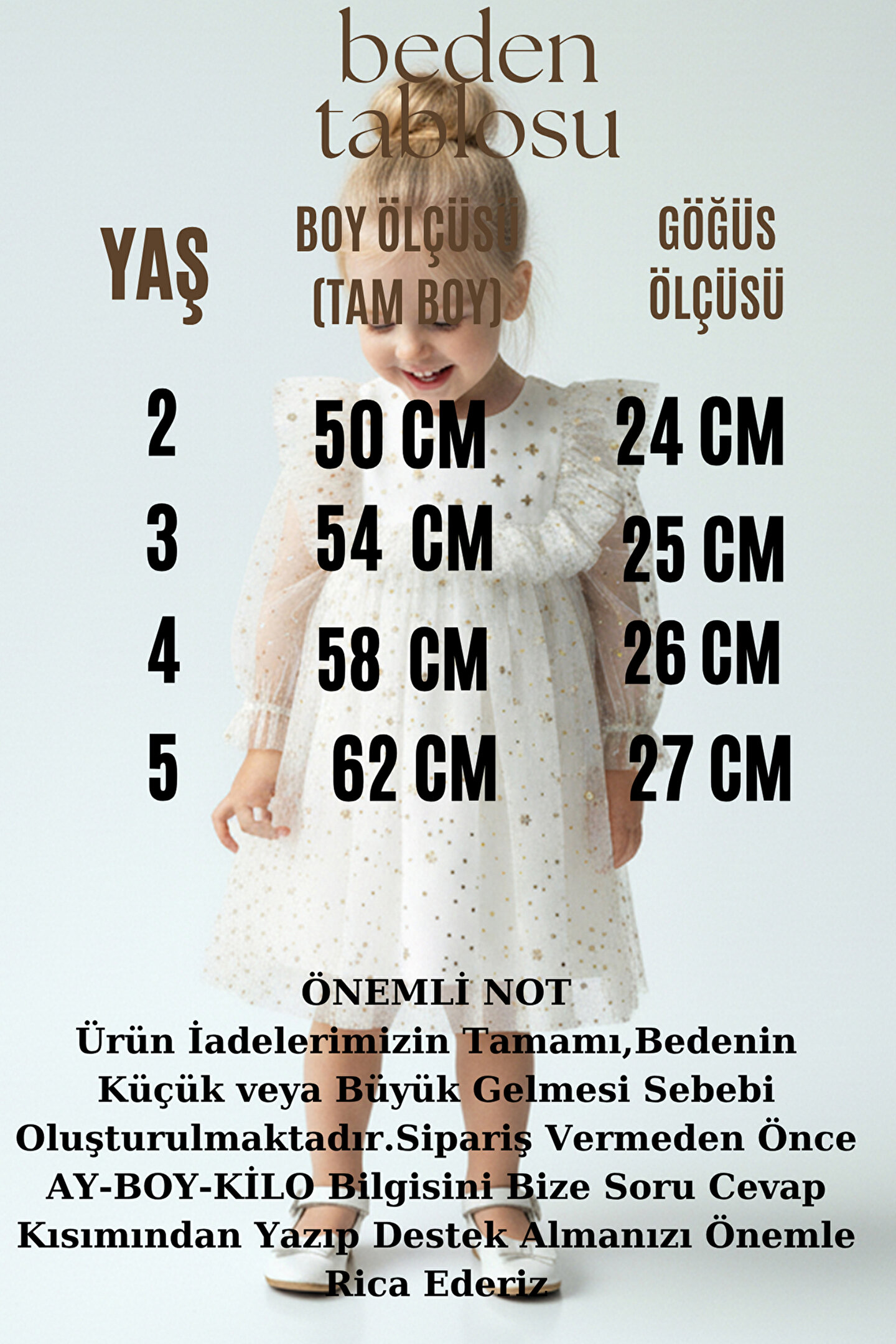 Mevsimlik Uzun Kollu Dantel Detaylı Kız Çocuk Elbisesi: Küçük prensesinizin özel günlerde zarafetini ve şıklığını ön plana çıkaracak bu elbise, yıldız detayıyla tasarlanmıştır.; Ayrıca etek kısmında bulunan yırtmaç detayı, hareket özgürlüğü sağlarken bebeğinizin zarif bir görünüm sergilemesini sağlar.; Özellikler tül Detaylar: Elbisenin ön kısmında ve kollarda bulunan yıldız detayıyla, zarafet ve incelik katarken, küçük prensesinizin görünümünü daha etkileyici hale getirir.; Arkasındaki yıldız detayıyla: Elbisenin ön kısmında bulunan yıldız detayıyla, sevimliliği ve şıklığı artırır.; Küçük prensesinizin görünümüne hoş bir dokunuş ekler.; Yırtmaç Detayı: Etek kısmında bulunan yırtmaç detayı, hareket özgürlüğü sağlarken, elbisenin tasarımına dinamizm katar.; Uzun Kollu Tasarım:Rahatlıkla giyilebilecek Uzun kollu tasarım, bebeğinizin özgürce hareket etmesine olanak tanır.; Mevsimlik Kullanıma Uygun: Hafif yapısı ve nefes alabilen kumaşıyla rahatlıkla giyilebilir.; Özel Günler İçin Uygun: Özel günlerde tercih edilebilecek şık tasarımıyla bebeğinizin her anında göz kamaştırmasını sağlar.; Bu yırtmaçlı,yıldız detayıyla Uzun kollu kız çocuk elbisesi, küçük prensesinizin serin ve şık kalmasını sağlarken, aynı zamanda özel günlerde de zarafetini tamamlar.; Zarif detaylarıyla bezenmiş bu elbise, bebeğinizin tarzını ve güzelliğini ön plana çıkarır.