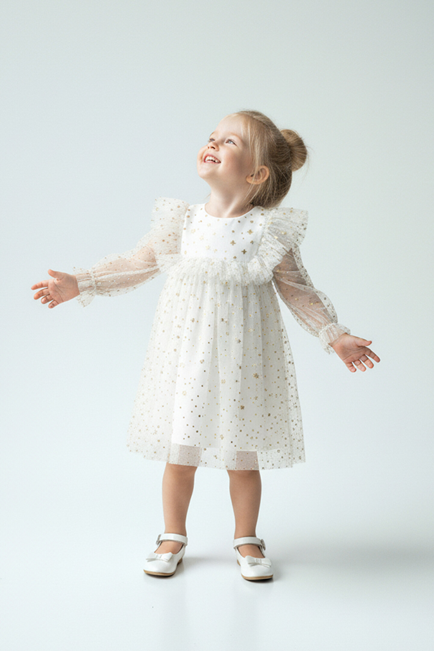 Mevsimlik Uzun Kollu Dantel Detaylı Kız Çocuk Elbisesi: Küçük prensesinizin özel günlerde zarafetini ve şıklığını ön plana çıkaracak bu elbise, yıldız detayıyla tasarlanmıştır.; Ayrıca etek kısmında bulunan yırtmaç detayı, hareket özgürlüğü sağlarken bebeğinizin zarif bir görünüm sergilemesini sağlar.; Özellikler tül Detaylar: Elbisenin ön kısmında ve kollarda bulunan yıldız detayıyla, zarafet ve incelik katarken, küçük prensesinizin görünümünü daha etkileyici hale getirir.; Arkasındaki yıldız detayıyla: Elbisenin ön kısmında bulunan yıldız detayıyla, sevimliliği ve şıklığı artırır.; Küçük prensesinizin görünümüne hoş bir dokunuş ekler.; Yırtmaç Detayı: Etek kısmında bulunan yırtmaç detayı, hareket özgürlüğü sağlarken, elbisenin tasarımına dinamizm katar.; Uzun Kollu Tasarım:Rahatlıkla giyilebilecek Uzun kollu tasarım, bebeğinizin özgürce hareket etmesine olanak tanır.; Mevsimlik Kullanıma Uygun: Hafif yapısı ve nefes alabilen kumaşıyla rahatlıkla giyilebilir.; Özel Günler İçin Uygun: Özel günlerde tercih edilebilecek şık tasarımıyla bebeğinizin her anında göz kamaştırmasını sağlar.; Bu yırtmaçlı,yıldız detayıyla Uzun kollu kız çocuk elbisesi, küçük prensesinizin serin ve şık kalmasını sağlarken, aynı zamanda özel günlerde de zarafetini tamamlar.; Zarif detaylarıyla bezenmiş bu elbise, bebeğinizin tarzını ve güzelliğini ön plana çıkarır.