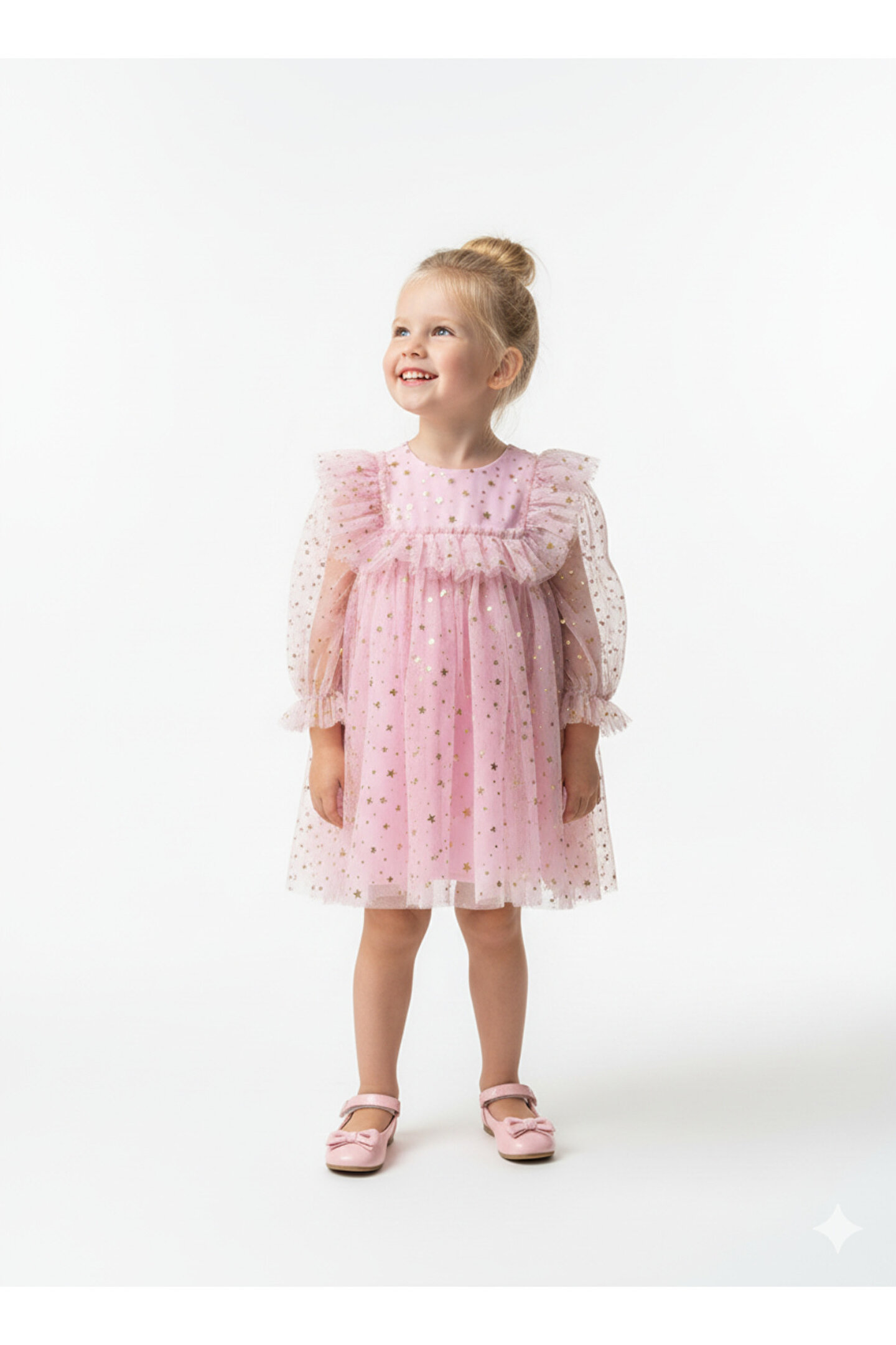 Mevsimlik Uzun Kollu Dantel Detaylı Kız Çocuk Elbisesi: Küçük prensesinizin özel günlerde zarafetini ve şıklığını ön plana çıkaracak bu elbise, yıldız detayıyla tasarlanmıştır.; Ayrıca etek kısmında bulunan yırtmaç detayı, hareket özgürlüğü sağlarken bebeğinizin zarif bir görünüm sergilemesini sağlar.; Özellikler tül Detaylar: Elbisenin ön kısmında ve kollarda bulunan yıldız detayıyla, zarafet ve incelik katarken, küçük prensesinizin görünümünü daha etkileyici hale getirir.; Arkasındaki yıldız detayıyla: Elbisenin ön kısmında bulunan yıldız detayıyla, sevimliliği ve şıklığı artırır.; Küçük prensesinizin görünümüne hoş bir dokunuş ekler.; Yırtmaç Detayı: Etek kısmında bulunan yırtmaç detayı, hareket özgürlüğü sağlarken, elbisenin tasarımına dinamizm katar.; Uzun Kollu Tasarım:Rahatlıkla giyilebilecek Uzun kollu tasarım, bebeğinizin özgürce hareket etmesine olanak tanır.; Mevsimlik Kullanıma Uygun: Hafif yapısı ve nefes alabilen kumaşıyla rahatlıkla giyilebilir.; Özel Günler İçin Uygun: Özel günlerde tercih edilebilecek şık tasarımıyla bebeğinizin her anında göz kamaştırmasını sağlar.; Bu yırtmaçlı,yıldız detayıyla Uzun kollu kız çocuk elbisesi, küçük prensesinizin serin ve şık kalmasını sağlarken, aynı zamanda özel günlerde de zarafetini tamamlar.; Zarif detaylarıyla bezenmiş bu elbise, bebeğinizin tarzını ve güzelliğini ön plana çıkarır.