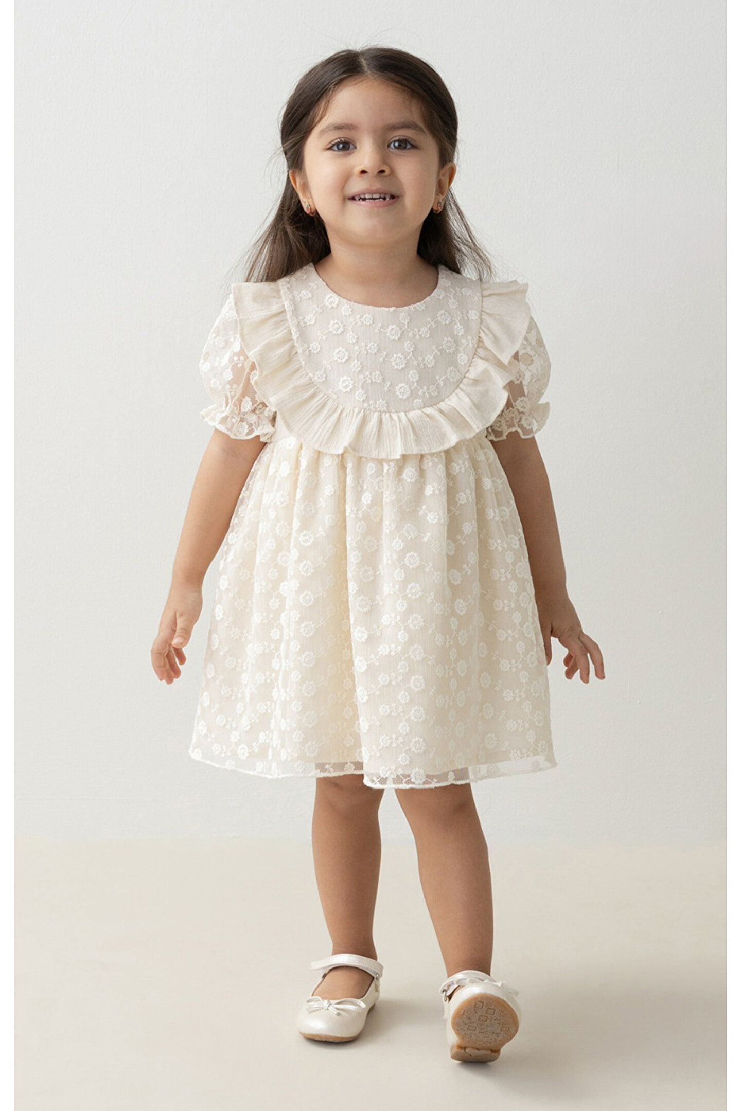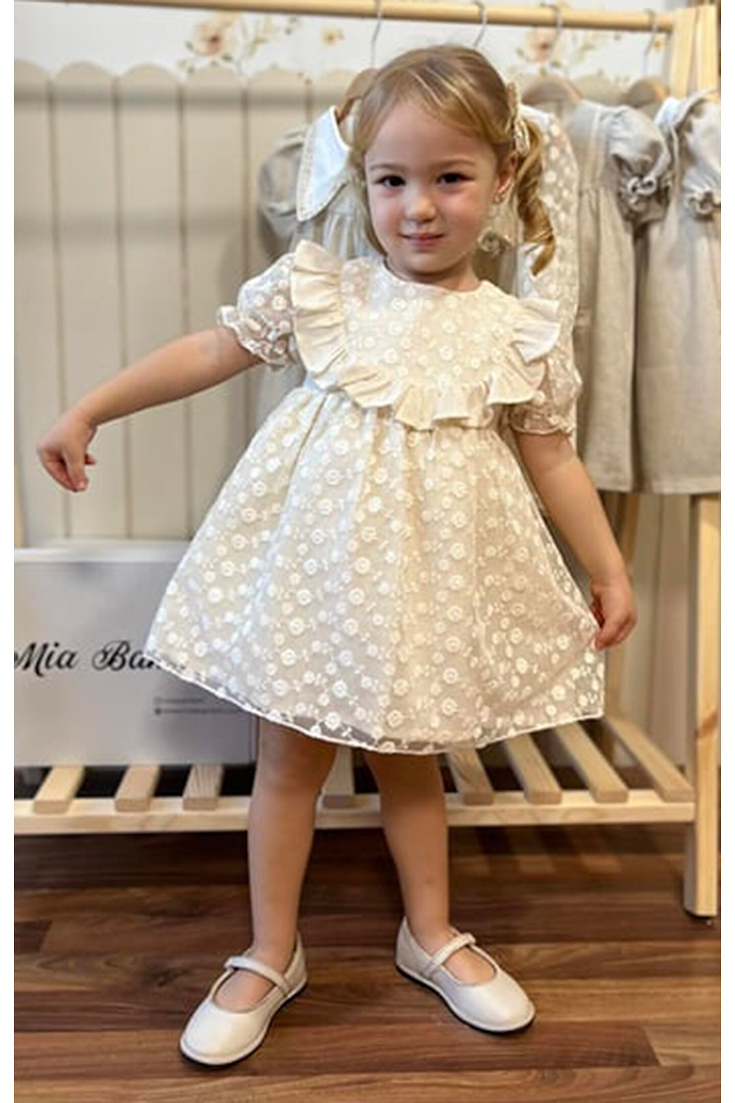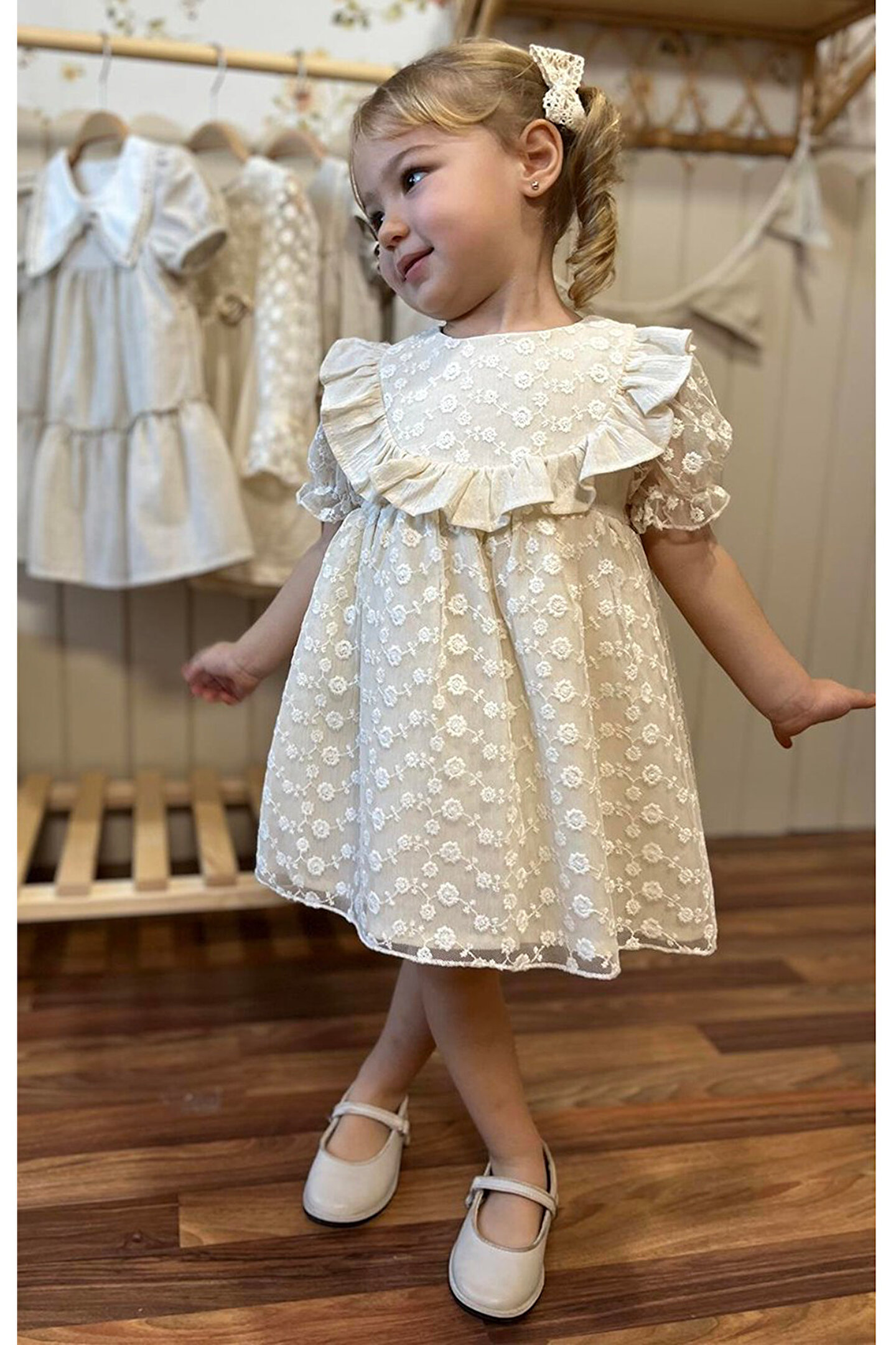 Yazlık Kısa Kollu Dantel Detaylı Kız Çocuk Elbisesi: Küçük prensesinizin yaz mevsiminde özel günlerde zarafetini ve şıklığını ön plana çıkaracak bu elbise, önünde bulunan fiyonk detayı ve dantel işlemeleriyle tasarlanmıştır.; Ayrıca etek kısmında bulunan yırtmaç detayı, hareket özgürlüğü sağlarken bebeğinizin zarif bir görünüm sergilemesini sağlar.; Özellikler: Dantel Detaylar: Elbisenin ön kısmında ve kollarda bulunan dantel detaylar, zarafet ve incelik katarken, küçük prensesinizin görünümünü daha etkileyici hale getirir.; Önünde Fiyonk Detayı: Elbisenin ön kısmında bulunan fiyonk detayı, sevimliliği ve şıklığı artırır.; Küçük prensesinizin görünümüne hoş bir dokunuş ekler.; Yırtmaç Detayı: Etek kısmında bulunan yırtmaç detayı, hareket özgürlüğü sağlarken, elbisenin tasarımına dinamizm katar.; Kısa Kollu Tasarım: Sıcak yaz günlerinde rahatlıkla giyilebilecek kısa kollu tasarım, bebeğinizin serin kalmasını sağlar ve özgürce hareket etmesine olanak tanır.; Yazlık Kullanıma Uygun: Hafif yapısı ve nefes alabilen kumaşıyla yaz aylarında rahatlıkla giyilebilir.; Özel Günler İçin Uygun: Özel günlerde tercih edilebilecek şık tasarımıyla bebeğinizin her anında göz kamaştırmasını sağlar.; Bu yırtmaçlı, önü fiyonklu ve dantel detaylı kısa kollu kız çocuk elbisesi, küçük prensesinizin yazın serin ve şık kalmasını sağlarken, aynı zamanda özel günlerde de zarafetini tamamlar.; Zarif detaylarıyla bezenmiş bu elbise, bebeğinizin tarzını ve güzelliğini ön plana çıkarır.