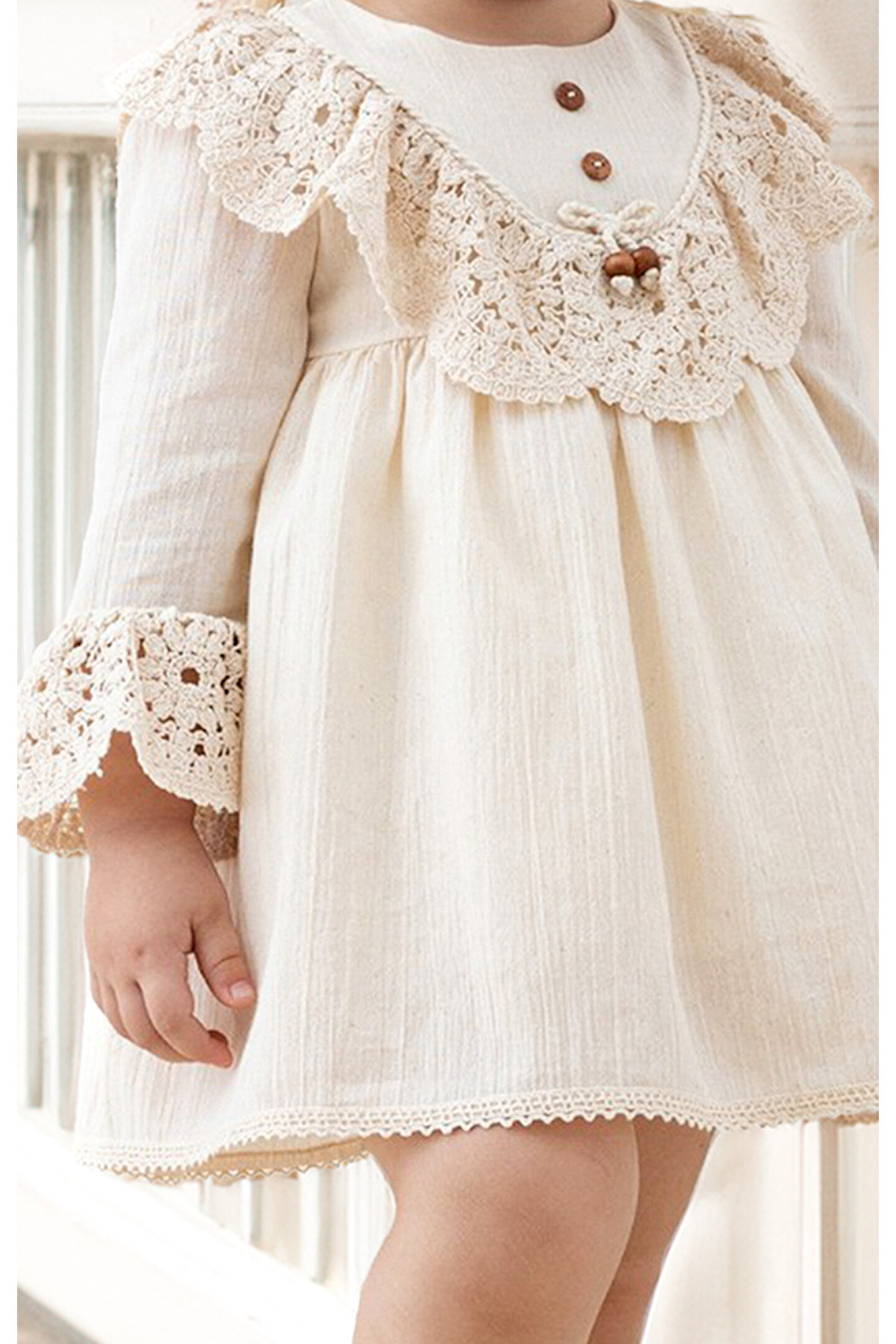 Mevsimlik Uzun Kollu Dantel Detaylı Kız Çocuk Elbisesi: Küçük prensesinizin yaz mevsiminde özel günlerde zarafetini ve şıklığını ön plana çıkaracak bu elbise, önünde bulunan fiyonk detayı ve dantel işlemeleriyle tasarlanmıştır.; Ayrıca etek kısmında bulunan yırtmaç detayı, hareket özgürlüğü sağlarken bebeğinizin zarif bir görünüm sergilemesini sağlar.; Özellikler: Dantel Detaylar: Elbisenin ön kısmında ve kollarda bulunan dantel detaylar, zarafet ve incelik katarken, küçük prensesinizin görünümünü daha etkileyici hale getirir.; Önünde Fiyonk Detayı: Elbisenin ön kısmında bulunan fiyonk detayı, sevimliliği ve şıklığı artırır.; Küçük prensesinizin görünümüne hoş bir dokunuş ekler.; Yırtmaç Detayı: Etek kısmında bulunan yırtmaç detayı, hareket özgürlüğü sağlarken, elbisenin tasarımına dinamizm katar.; Uzun Kollu Tasarım:Rahatlıkla giyilebilecek Uzun kollu tasarım, bebeğinizin serin kalmasını sağlar ve özgürce hareket etmesine olanak tanır.; Mevsimlik Kullanıma Uygun: Hafif yapısı ve nefes alabilen kumaşıyla yaz aylarında rahatlıkla giyilebilir.; Özel Günler İçin Uygun: Özel günlerde tercih edilebilecek şık tasarımıyla bebeğinizin her anında göz kamaştırmasını sağlar.; Bu yırtmaçlı, önü fiyonklu ve dantel detaylı Uzun kollu kız çocuk elbisesi, küçük prensesinizin serin ve şık kalmasını sağlarken, aynı zamanda özel günlerde de zarafetini tamamlar.; Zarif detaylarıyla bezenmiş bu elbise, bebeğinizin tarzını ve güzelliğini ön plana çıkarır.