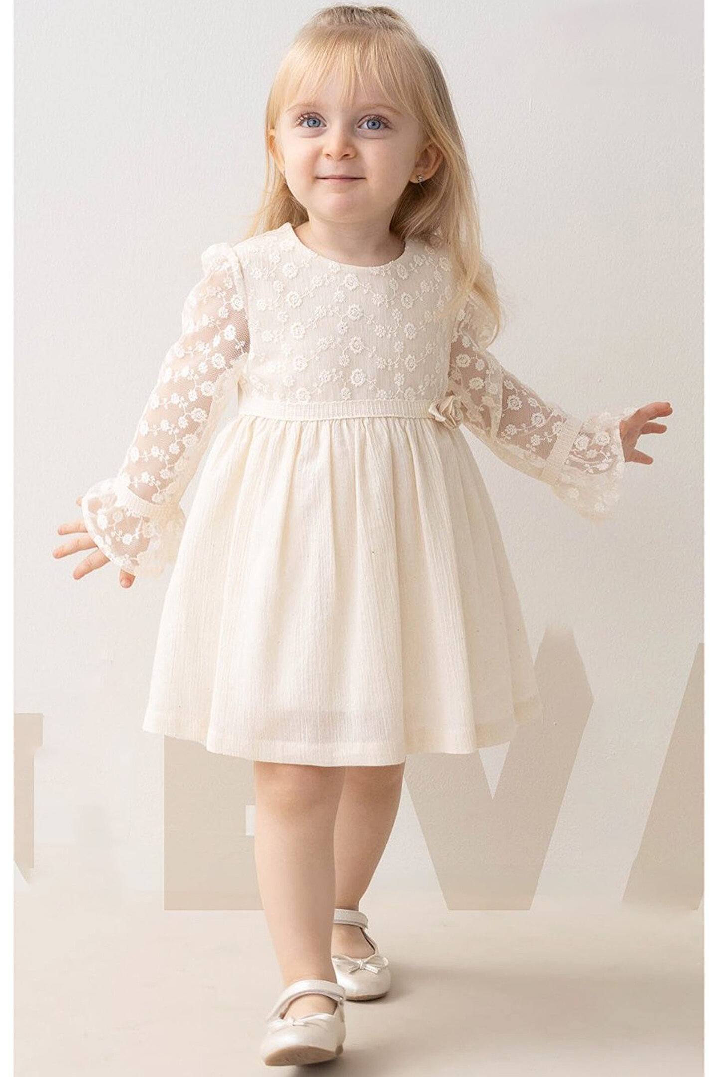 Mevsimlik Uzun Kollu Dantel Detaylı Kız Çocuk Elbisesi: Küçük prensesinizin yaz mevsiminde özel günlerde zarafetini ve şıklığını ön plana çıkaracak bu elbise, önünde bulunan fiyonk detayı ve dantel işlemeleriyle tasarlanmıştır.; Ayrıca etek kısmında bulunan yırtmaç detayı, hareket özgürlüğü sağlarken bebeğinizin zarif bir görünüm sergilemesini sağlar.; Özellikler: Dantel Detaylar: Elbisenin ön kısmında ve kollarda bulunan dantel detaylar, zarafet ve incelik katarken, küçük prensesinizin görünümünü daha etkileyici hale getirir.; Önünde Fiyonk Detayı: Elbisenin ön kısmında bulunan fiyonk detayı, sevimliliği ve şıklığı artırır.; Küçük prensesinizin görünümüne hoş bir dokunuş ekler.; Yırtmaç Detayı: Etek kısmında bulunan yırtmaç detayı, hareket özgürlüğü sağlarken, elbisenin tasarımına dinamizm katar.; Uzun Kollu Tasarım:Rahatlıkla giyilebilecek Uzun kollu tasarım, bebeğinizin serin kalmasını sağlar ve özgürce hareket etmesine olanak tanır.; Mevsimlik Kullanıma Uygun: Hafif yapısı ve nefes alabilen kumaşıyla yaz aylarında rahatlıkla giyilebilir.; Özel Günler İçin Uygun: Özel günlerde tercih edilebilecek şık tasarımıyla bebeğinizin her anında göz kamaştırmasını sağlar.; Bu yırtmaçlı, önü fiyonklu ve dantel detaylı Uzun kollu kız çocuk elbisesi, küçük prensesinizin serin ve şık kalmasını sağlarken, aynı zamanda özel günlerde de zarafetini tamamlar.; Zarif detaylarıyla bezenmiş bu elbise, bebeğinizin tarzını ve güzelliğini ön plana çıkarır.