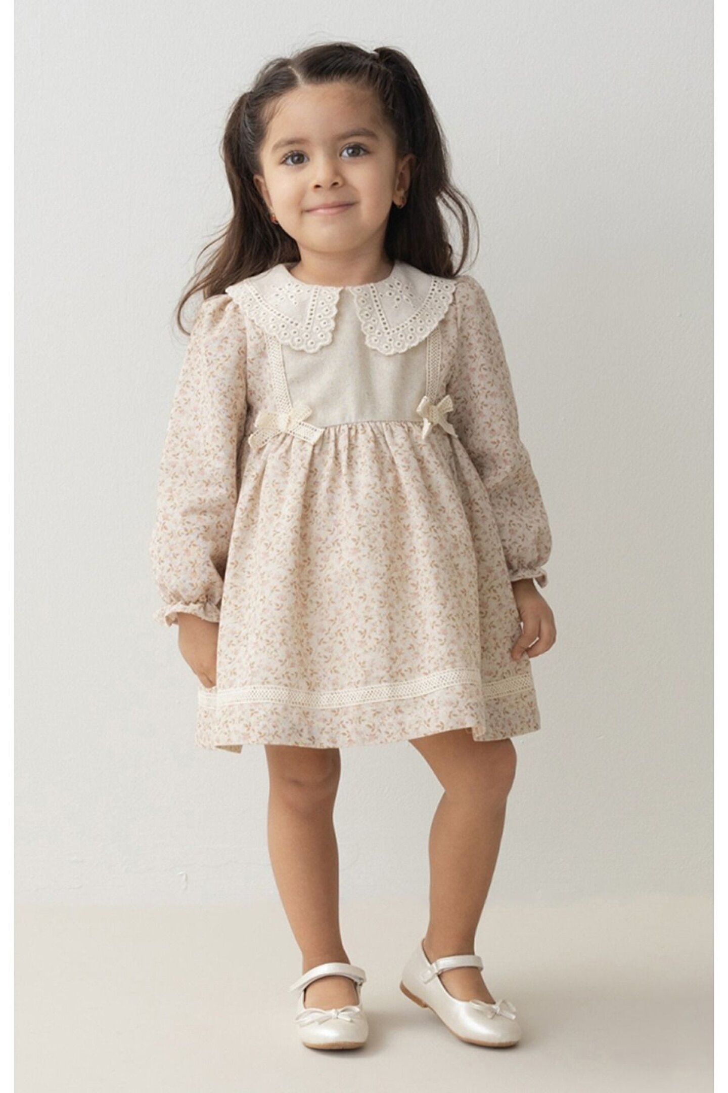 Baby Animals Kız Bebek Elbise Kız Çocuk Elbise Yakalı Doğum Günü Parti Düğün Özel Gün Uzun Kol Astarlı Çiçekli