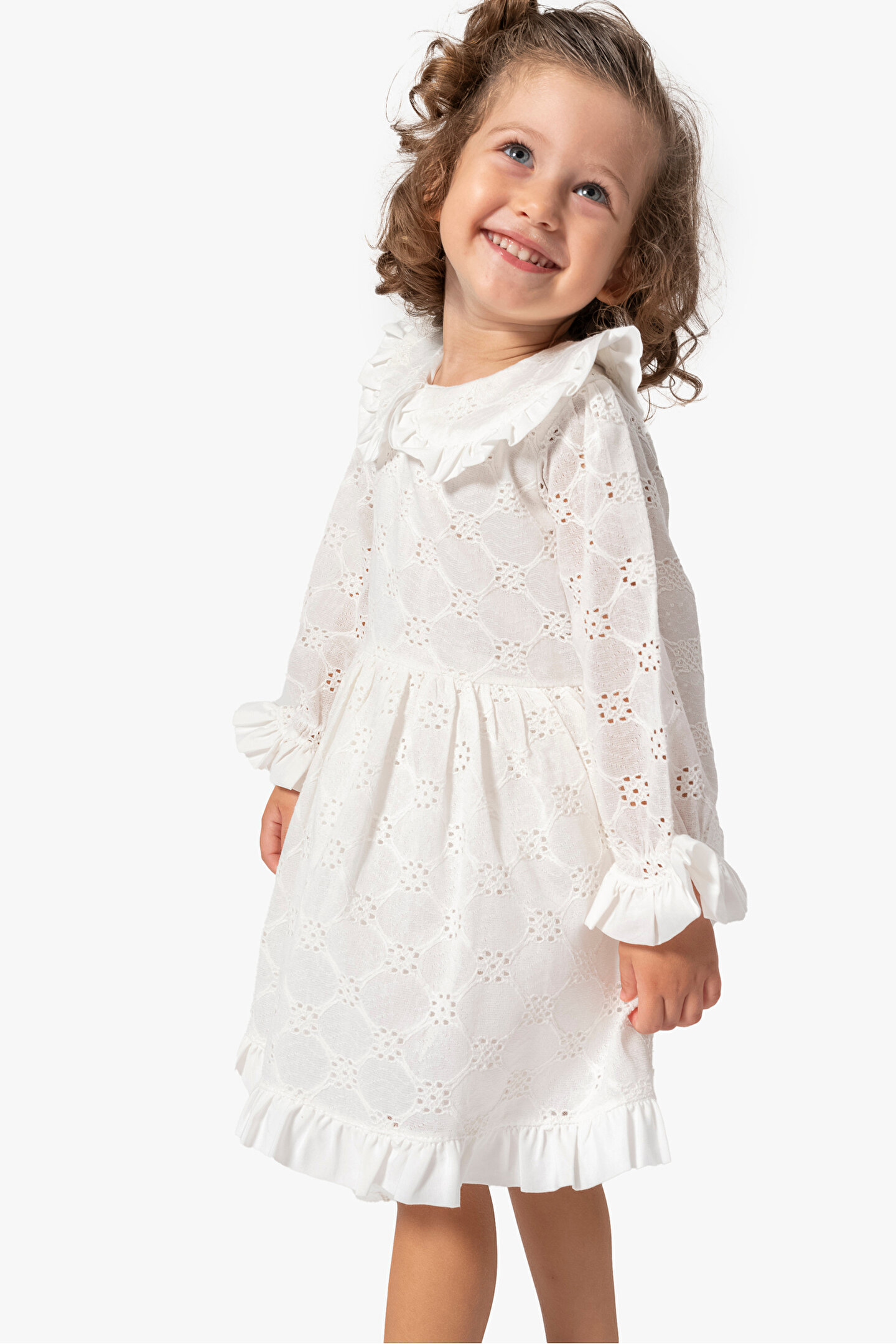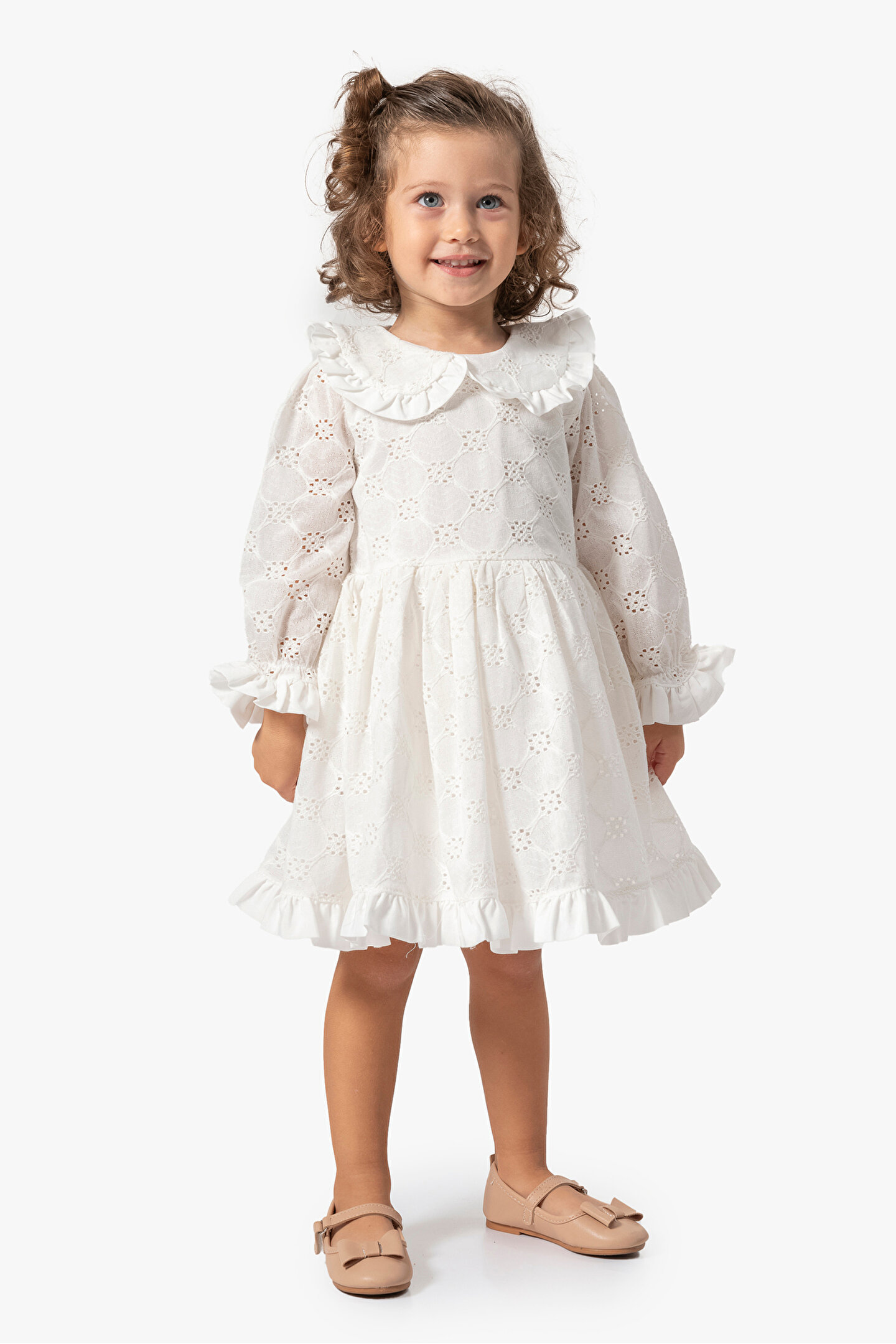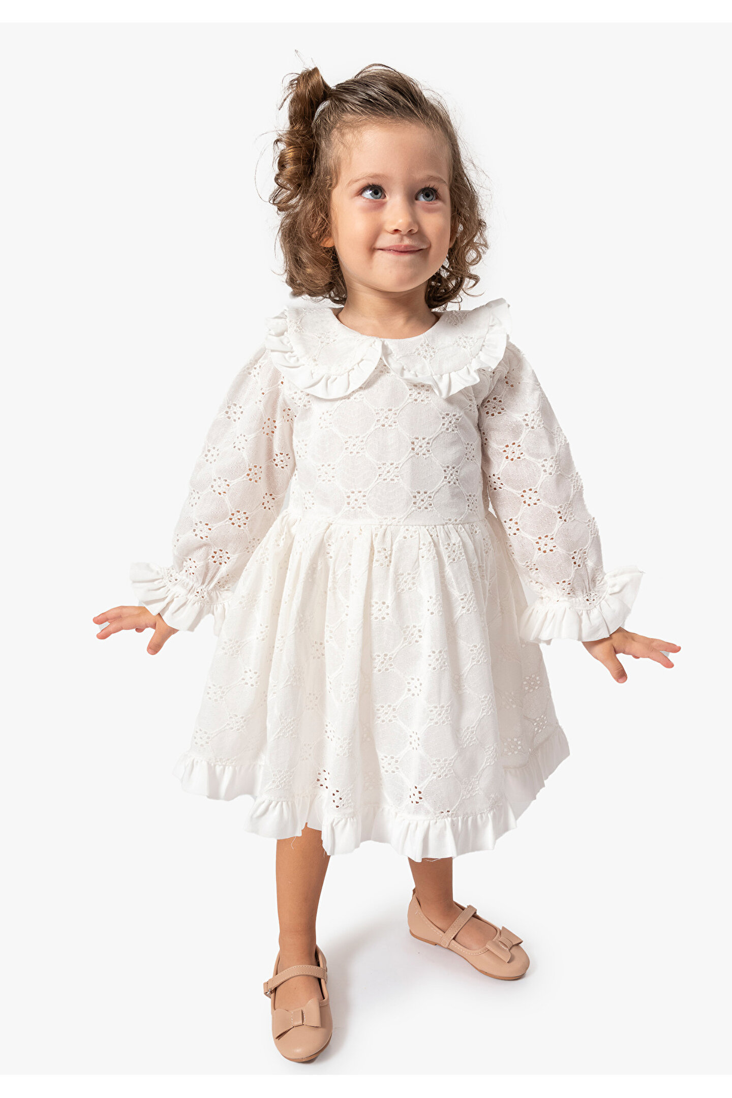 Mevsimlik Uzun Kollu Dantel Detaylı Kız Çocuk Elbisesi: Küçük prensesinizin yaz mevsiminde özel günlerde zarafetini ve şıklığını ön plana çıkaracak bu elbise, önünde bulunan fiyonk detayı ve dantel işlemeleriyle tasarlanmıştır.; Ayrıca etek kısmında bulunan yırtmaç detayı, hareket özgürlüğü sağlarken bebeğinizin zarif bir görünüm sergilemesini sağlar.; Özellikler: Dantel Detaylar: Elbisenin ön kısmında ve kollarda bulunan dantel detaylar, zarafet ve incelik katarken, küçük prensesinizin görünümünü daha etkileyici hale getirir.; Önünde Fiyonk Detayı: Elbisenin ön kısmında bulunan fiyonk detayı, sevimliliği ve şıklığı artırır.; Küçük prensesinizin görünümüne hoş bir dokunuş ekler.; Yırtmaç Detayı: Etek kısmında bulunan yırtmaç detayı, hareket özgürlüğü sağlarken, elbisenin tasarımına dinamizm katar.; Uzun Kollu Tasarım:Rahatlıkla giyilebilecek Uzun kollu tasarım, bebeğinizin serin kalmasını sağlar ve özgürce hareket etmesine olanak tanır.; Mevsimlik Kullanıma Uygun: Hafif yapısı ve nefes alabilen kumaşıyla yaz aylarında rahatlıkla giyilebilir.; Özel Günler İçin Uygun: Özel günlerde tercih edilebilecek şık tasarımıyla bebeğinizin her anında göz kamaştırmasını sağlar.; Bu yırtmaçlı, önü fiyonklu ve dantel detaylı Uzun kollu kız çocuk elbisesi, küçük prensesinizin serin ve şık kalmasını sağlarken, aynı zamanda özel günlerde de zarafetini tamamlar.; Zarif detaylarıyla bezenmiş bu elbise, bebeğinizin tarzını ve güzelliğini ön plana çıkarır.