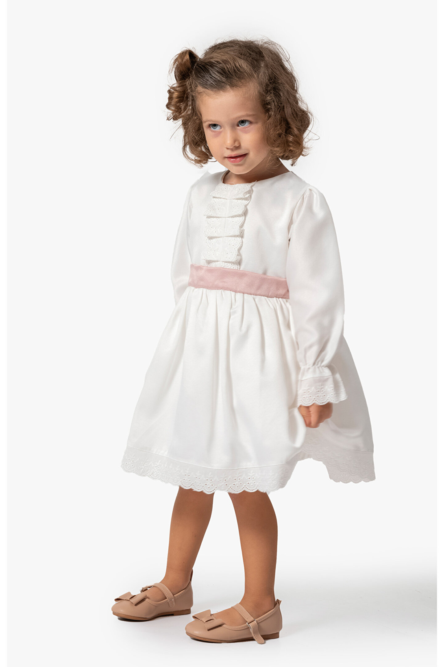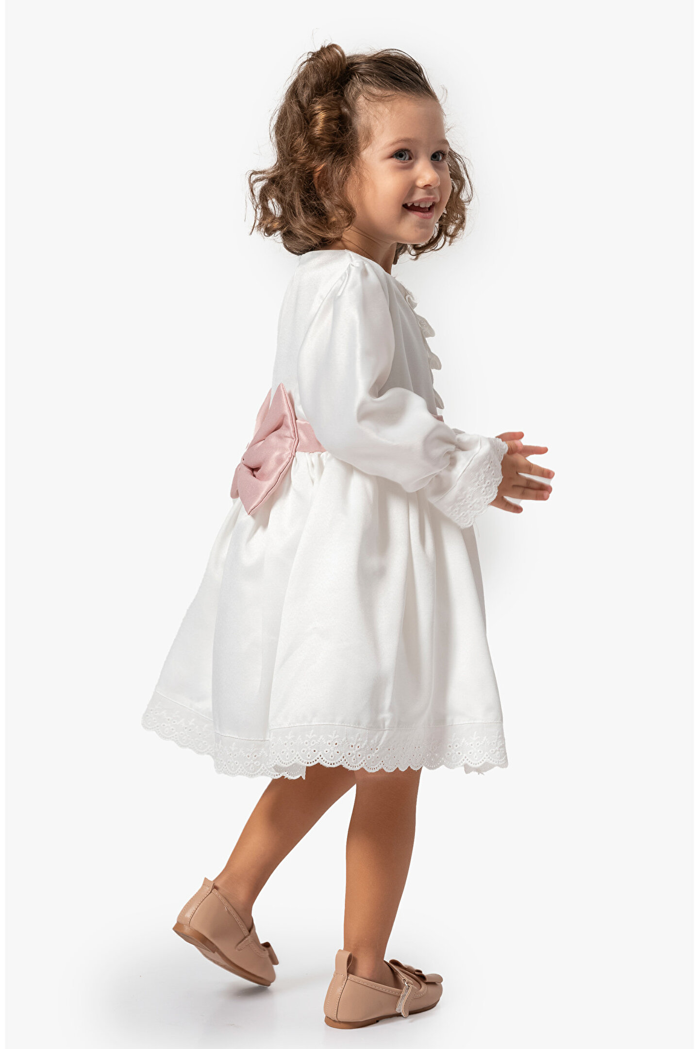 Mevsimlik Uzun Kollu Dantel Detaylı Kız Çocuk Elbisesi: Küçük prensesinizin yaz mevsiminde özel günlerde zarafetini ve şıklığını ön plana çıkaracak bu elbise, önünde bulunan fiyonk detayı ve dantel işlemeleriyle tasarlanmıştır.; Ayrıca etek kısmında bulunan yırtmaç detayı, hareket özgürlüğü sağlarken bebeğinizin zarif bir görünüm sergilemesini sağlar.; Özellikler: Dantel Detaylar: Elbisenin ön kısmında ve kollarda bulunan dantel detaylar, zarafet ve incelik katarken, küçük prensesinizin görünümünü daha etkileyici hale getirir.; Önünde Fiyonk Detayı: Elbisenin ön kısmında bulunan fiyonk detayı, sevimliliği ve şıklığı artırır.; Küçük prensesinizin görünümüne hoş bir dokunuş ekler.; Yırtmaç Detayı: Etek kısmında bulunan yırtmaç detayı, hareket özgürlüğü sağlarken, elbisenin tasarımına dinamizm katar.; Uzun Kollu Tasarım:Rahatlıkla giyilebilecek Uzun kollu tasarım, bebeğinizin serin kalmasını sağlar ve özgürce hareket etmesine olanak tanır.; Mevsimlik Kullanıma Uygun: Hafif yapısı ve nefes alabilen kumaşıyla yaz aylarında rahatlıkla giyilebilir.; Özel Günler İçin Uygun: Özel günlerde tercih edilebilecek şık tasarımıyla bebeğinizin her anında göz kamaştırmasını sağlar.; Bu yırtmaçlı, önü fiyonklu ve dantel detaylı Uzun kollu kız çocuk elbisesi, küçük prensesinizin serin ve şık kalmasını sağlarken, aynı zamanda özel günlerde de zarafetini tamamlar.; Zarif detaylarıyla bezenmiş bu elbise, bebeğinizin tarzını ve güzelliğini ön plana çıkarır.