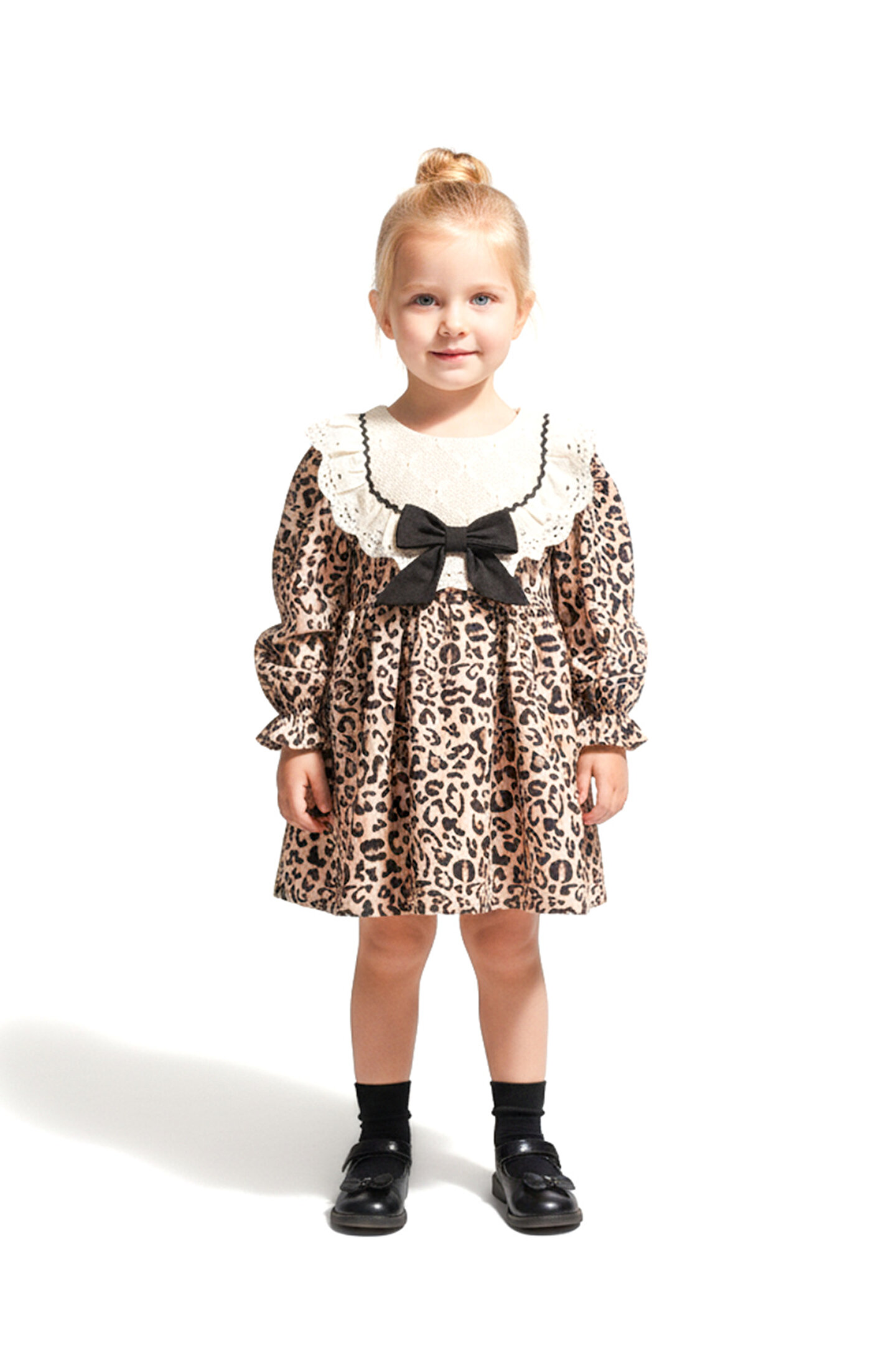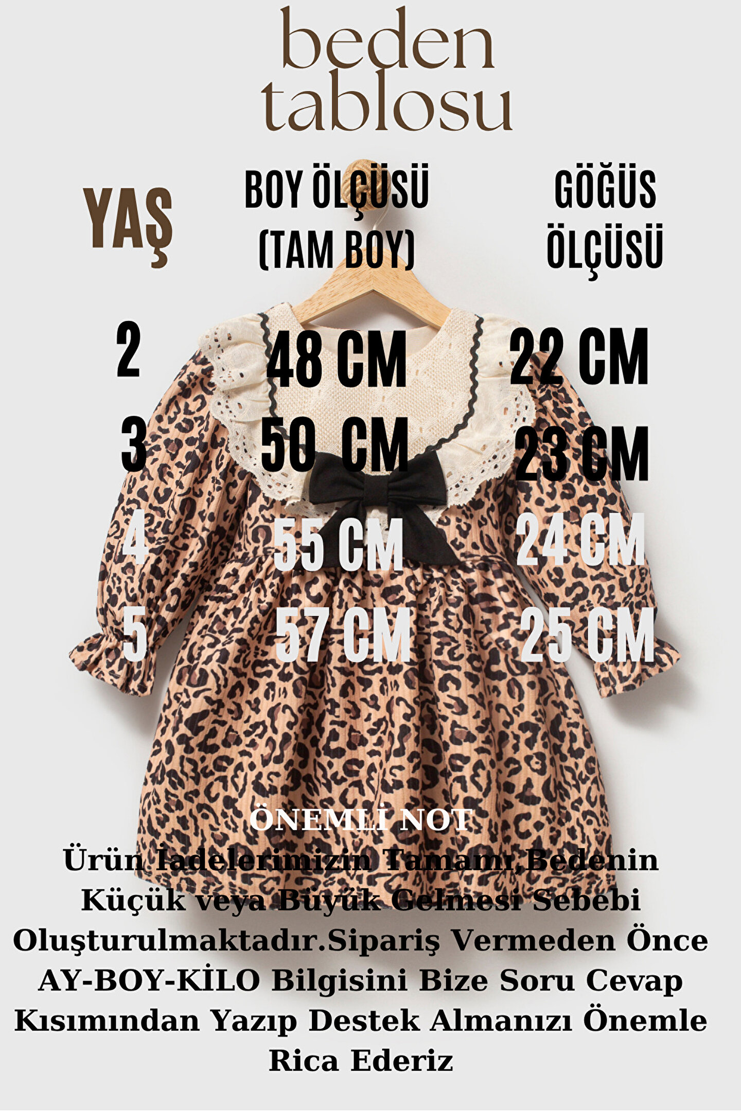Mevsimlik Uzun Kollu Leopar Dantel Detaylı Kız Çocuk Elbisesi: Küçük prensesinizin özel günlerde zarafetini ve şıklığını ön plana çıkaracak bu elbise, önünde bulunan Leopar fiyonk detayı ve dantel işlemeleriyle tasarlanmıştır.; Özellikler: Dantel Detaylar: Elbisenin ön kısmında ve kollarda bulunan dantel detaylar, zarafet ve incelik katarken, küçük prensesinizin görünümünü daha etkileyici hale getirir.; Önünde Leopar Fiyonk Detayı: Elbisenin ön kısmında bulunan fiyonk detayı, sevimliliği ve şıklığı artırır.; Küçük prensesinizin görünümüne hoş bir dokunuş ekler.; Uzun Kollu Tasarım:Rahatlıkla giyilebilecek Uzun kollu tasarım, bebeğinizin serin kalmasını sağlar ve özgürce hareket etmesine olanak tanır.; Mevsimlik Kullanıma Uygun: Hafif yapısı ve nefes alabilen kumaşıyla rahatlıkla giyilebilir.; Özel Günler İçin Uygun: Özel günlerde tercih edilebilecek şık tasarımıyla bebeğinizin her anında göz kamaştırmasını sağlar.; Bu önü fiyonklu ve dantel detaylı Uzun kollu kız çocuk elbisesi, küçük prensesinizin şık kalmasını sağlarken, aynı zamanda özel günlerde de zarafetini tamamlar.; Zarif detaylarıyla bezenmiş bu elbise, bebeğinizin tarzını ve güzelliğini ön plana çıkarır.