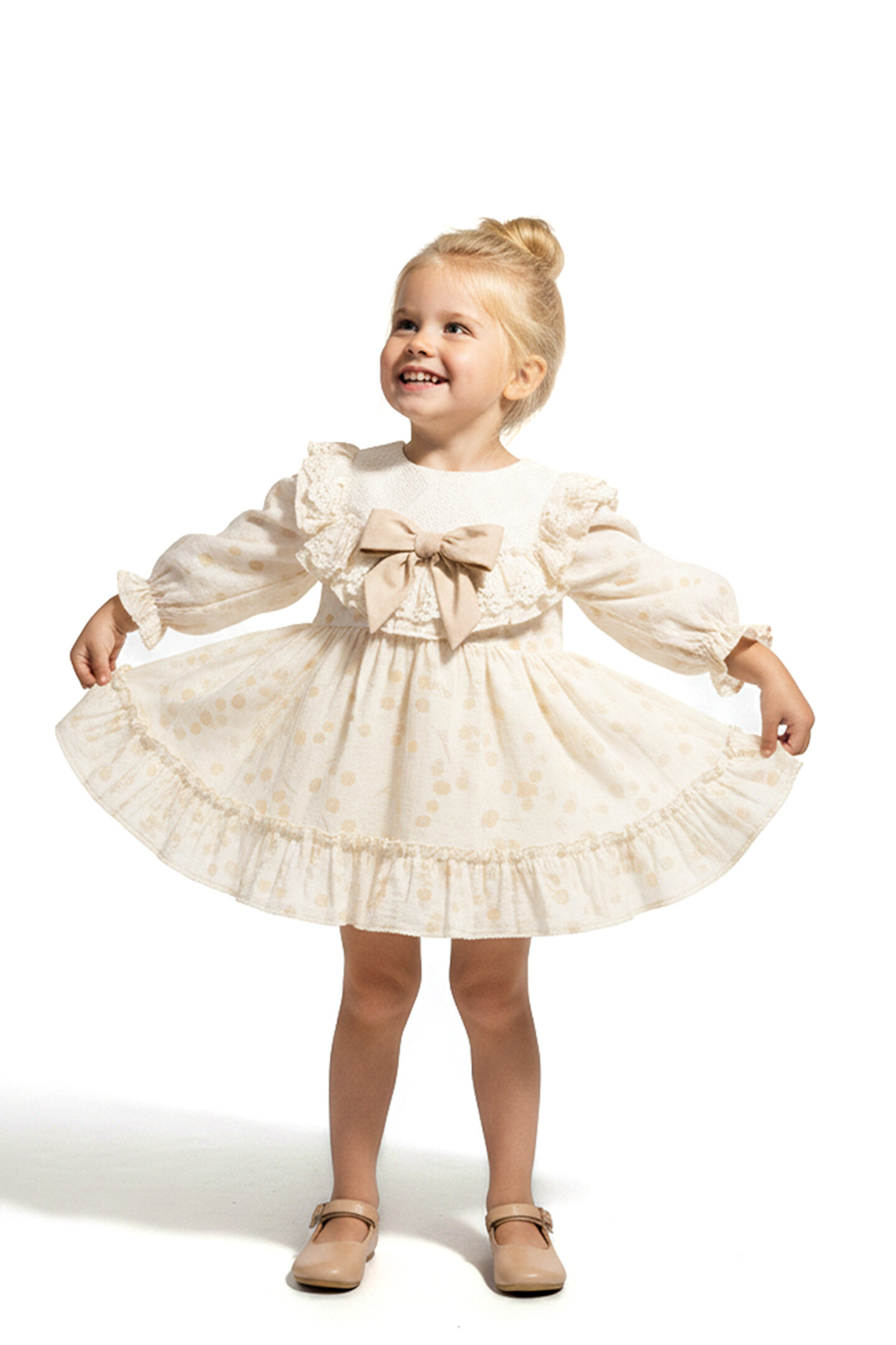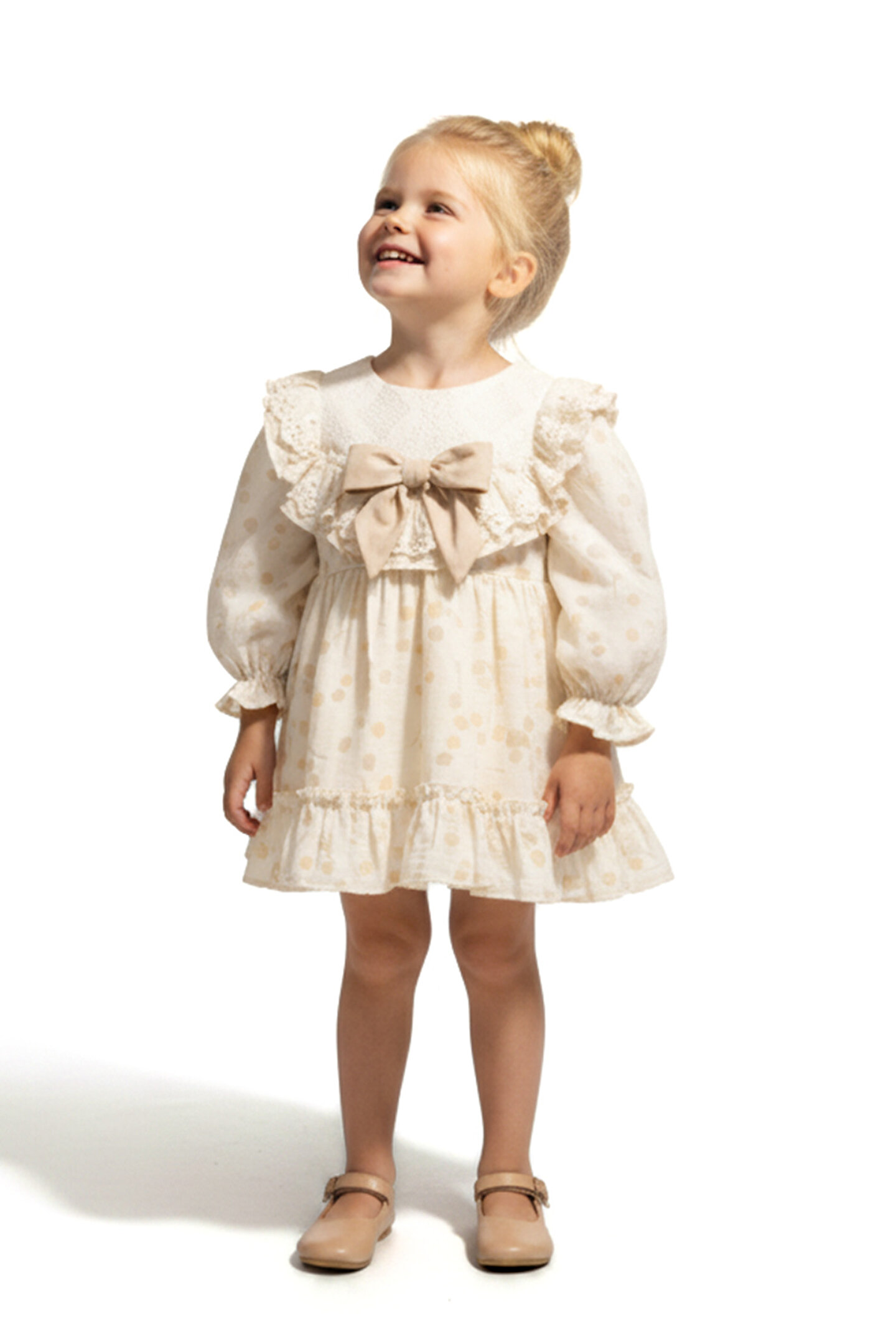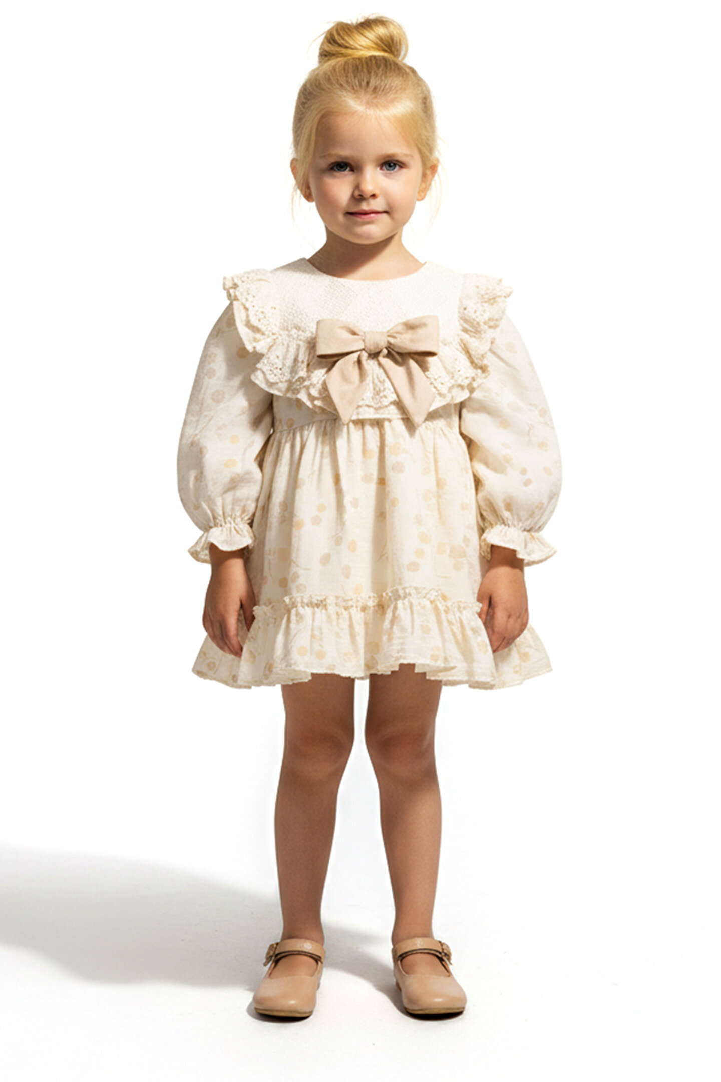 Mevsimlik Uzun Kollu Dantel Detaylı Kız Çocuk Elbisesi: Küçük prensesinizin özel günlerde zarafetini ve şıklığını ön plana çıkaracak bu elbise, önünde bulunan Yakalı fiyonk detayı ve dantel işlemeleriyle tasarlanmıştır.; Özellikler: Dantel Detaylar: Elbisenin ön kısmında ve kollarda bulunan dantel detaylar, zarafet ve incelik katarken, küçük prensesinizin görünümünü daha etkileyici hale getirir.; Önünde Yakalı Fiyonk Detayı: Elbisenin ön kısmında bulunan fiyonk detayı, sevimliliği ve şıklığı artırır.; Küçük prensesinizin görünümüne hoş bir dokunuş ekler.; Uzun Kollu Tasarım:Rahatlıkla giyilebilecek Uzun kollu tasarım, bebeğinizin serin kalmasını sağlar ve özgürce hareket etmesine olanak tanır.; Mevsimlik Kullanıma Uygun: Hafif yapısı ve nefes alabilen kumaşıyla rahatlıkla giyilebilir.; Özel Günler İçin Uygun: Özel günlerde tercih edilebilecek şık tasarımıyla bebeğinizin her anında göz kamaştırmasını sağlar.; Bu önü Yakalı fiyonklu ve dantel detaylı Uzun kollu kız çocuk elbisesi, küçük prensesinizin şık kalmasını sağlarken, aynı zamanda özel günlerde de zarafetini tamamlar.; Zarif detaylarıyla bezenmiş bu elbise, bebeğinizin tarzını ve güzelliğini ön plana çıkarır.