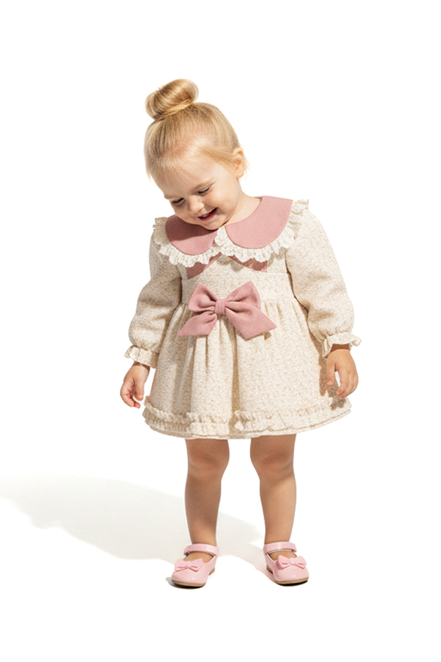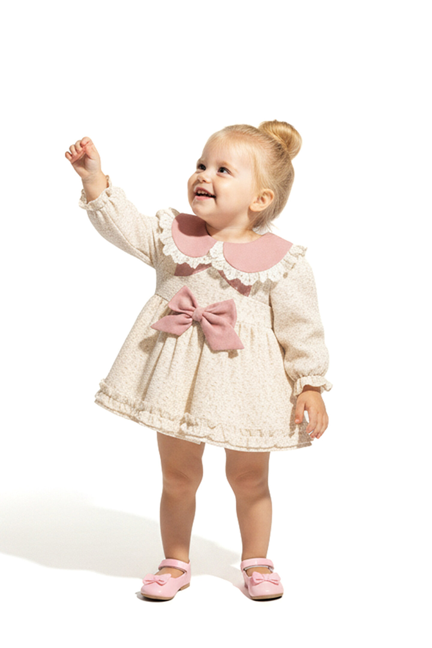 Mevsimlik Uzun Kollu Dantel Detaylı Kız Çocuk Elbisesi: Küçük prensesinizin özel günlerde zarafetini ve şıklığını ön plana çıkaracak bu elbise, önünde bulunan Yakalı fiyonk detayı ve dantel işlemeleriyle tasarlanmıştır.; Özellikler: Dantel Detaylar: Elbisenin ön kısmında ve kollarda bulunan dantel detaylar, zarafet ve incelik katarken, küçük prensesinizin görünümünü daha etkileyici hale getirir.; Önünde Yakalı Fiyonk Detayı: Elbisenin ön kısmında bulunan fiyonk detayı, sevimliliği ve şıklığı artırır.; Küçük prensesinizin görünümüne hoş bir dokunuş ekler.; Uzun Kollu Tasarım:Rahatlıkla giyilebilecek Uzun kollu tasarım, bebeğinizin serin kalmasını sağlar ve özgürce hareket etmesine olanak tanır.; Mevsimlik Kullanıma Uygun: Hafif yapısı ve nefes alabilen kumaşıyla rahatlıkla giyilebilir.; Özel Günler İçin Uygun: Özel günlerde tercih edilebilecek şık tasarımıyla bebeğinizin her anında göz kamaştırmasını sağlar.; Bu önü Yakalı fiyonklu ve dantel detaylı Uzun kollu kız çocuk elbisesi, küçük prensesinizin şık kalmasını sağlarken, aynı zamanda özel günlerde de zarafetini tamamlar.; Zarif detaylarıyla bezenmiş bu elbise, bebeğinizin tarzını ve güzelliğini ön plana çıkarır.
