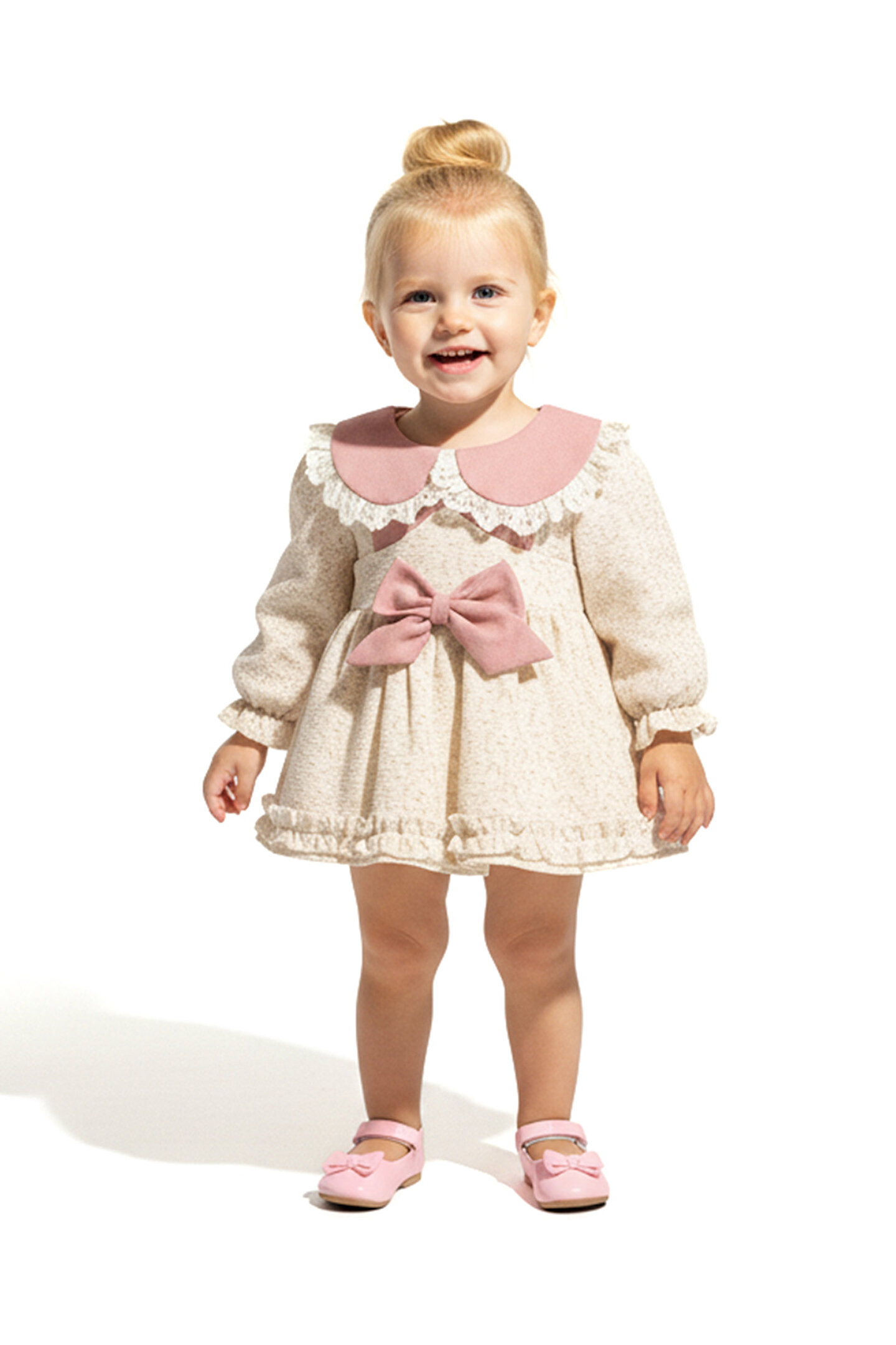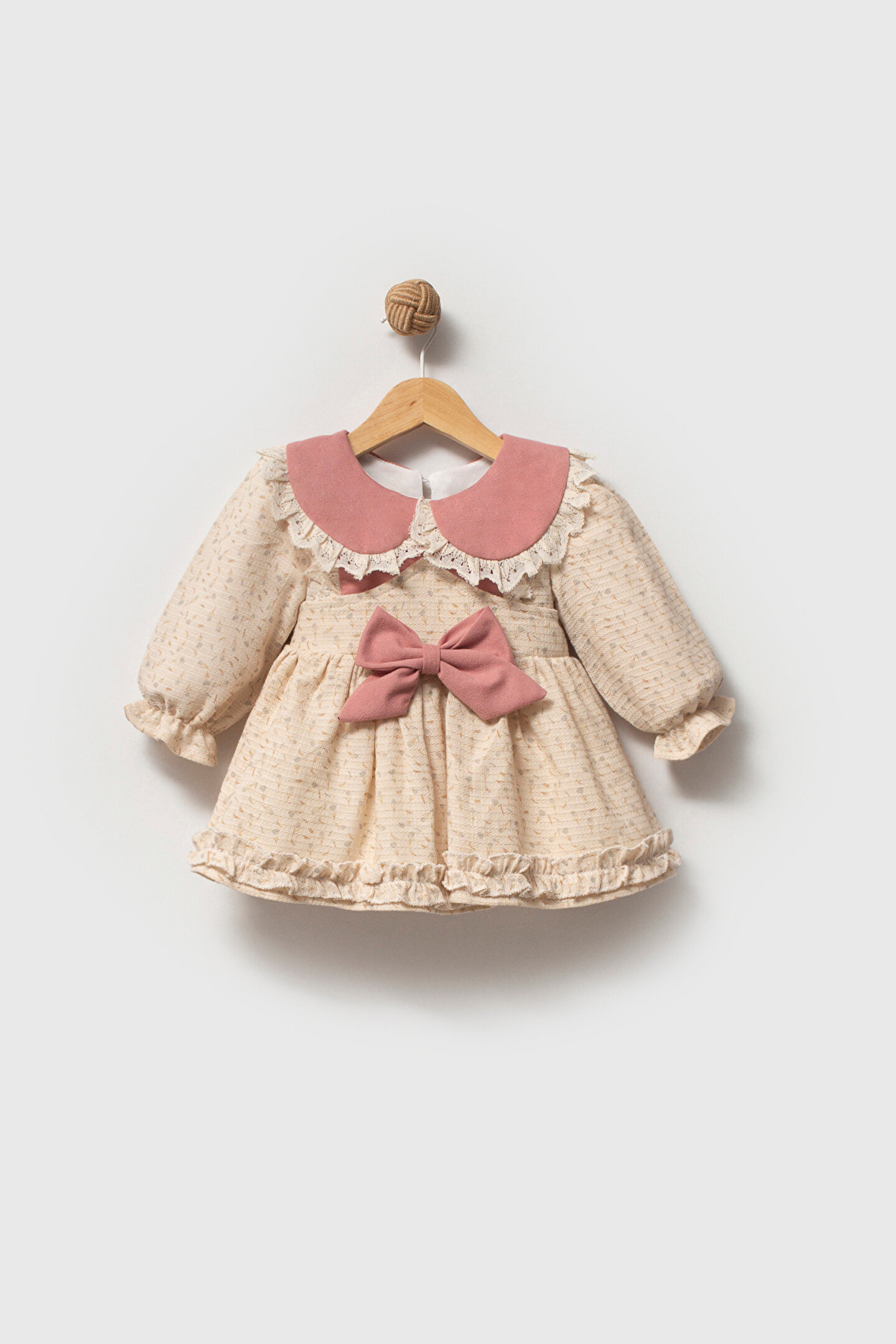 Mevsimlik Uzun Kollu Dantel Detaylı Kız Çocuk Elbisesi: Küçük prensesinizin özel günlerde zarafetini ve şıklığını ön plana çıkaracak bu elbise, önünde bulunan Yakalı fiyonk detayı ve dantel işlemeleriyle tasarlanmıştır.; Özellikler: Dantel Detaylar: Elbisenin ön kısmında ve kollarda bulunan dantel detaylar, zarafet ve incelik katarken, küçük prensesinizin görünümünü daha etkileyici hale getirir.; Önünde Yakalı Fiyonk Detayı: Elbisenin ön kısmında bulunan fiyonk detayı, sevimliliği ve şıklığı artırır.; Küçük prensesinizin görünümüne hoş bir dokunuş ekler.; Uzun Kollu Tasarım:Rahatlıkla giyilebilecek Uzun kollu tasarım, bebeğinizin serin kalmasını sağlar ve özgürce hareket etmesine olanak tanır.; Mevsimlik Kullanıma Uygun: Hafif yapısı ve nefes alabilen kumaşıyla rahatlıkla giyilebilir.; Özel Günler İçin Uygun: Özel günlerde tercih edilebilecek şık tasarımıyla bebeğinizin her anında göz kamaştırmasını sağlar.; Bu önü Yakalı fiyonklu ve dantel detaylı Uzun kollu kız çocuk elbisesi, küçük prensesinizin şık kalmasını sağlarken, aynı zamanda özel günlerde de zarafetini tamamlar.; Zarif detaylarıyla bezenmiş bu elbise, bebeğinizin tarzını ve güzelliğini ön plana çıkarır.