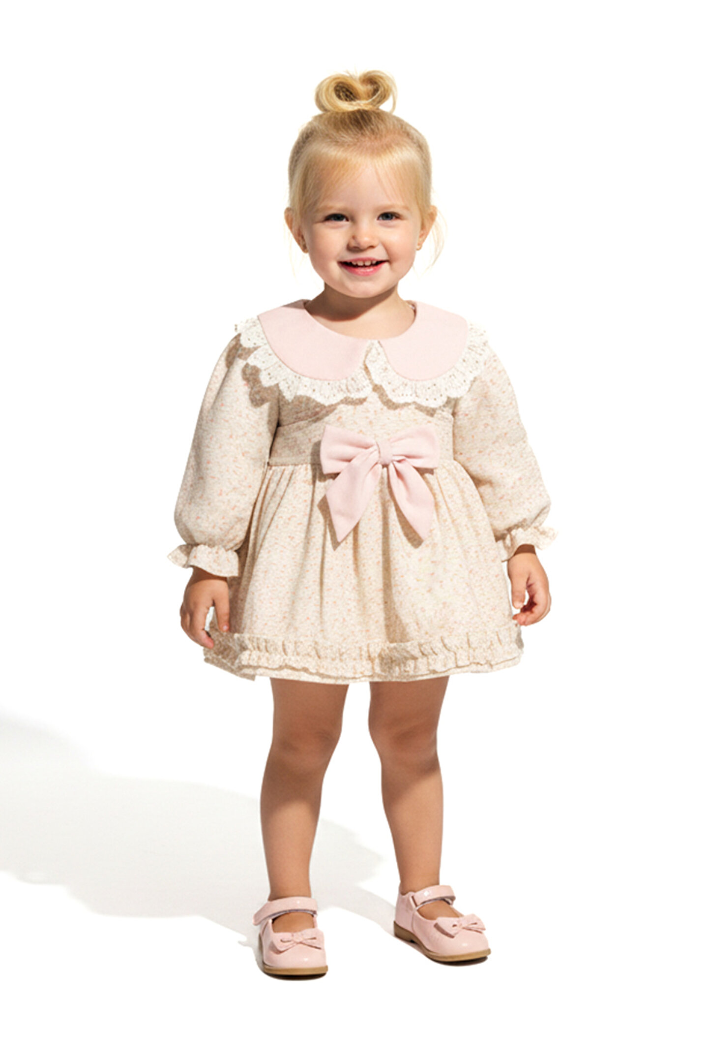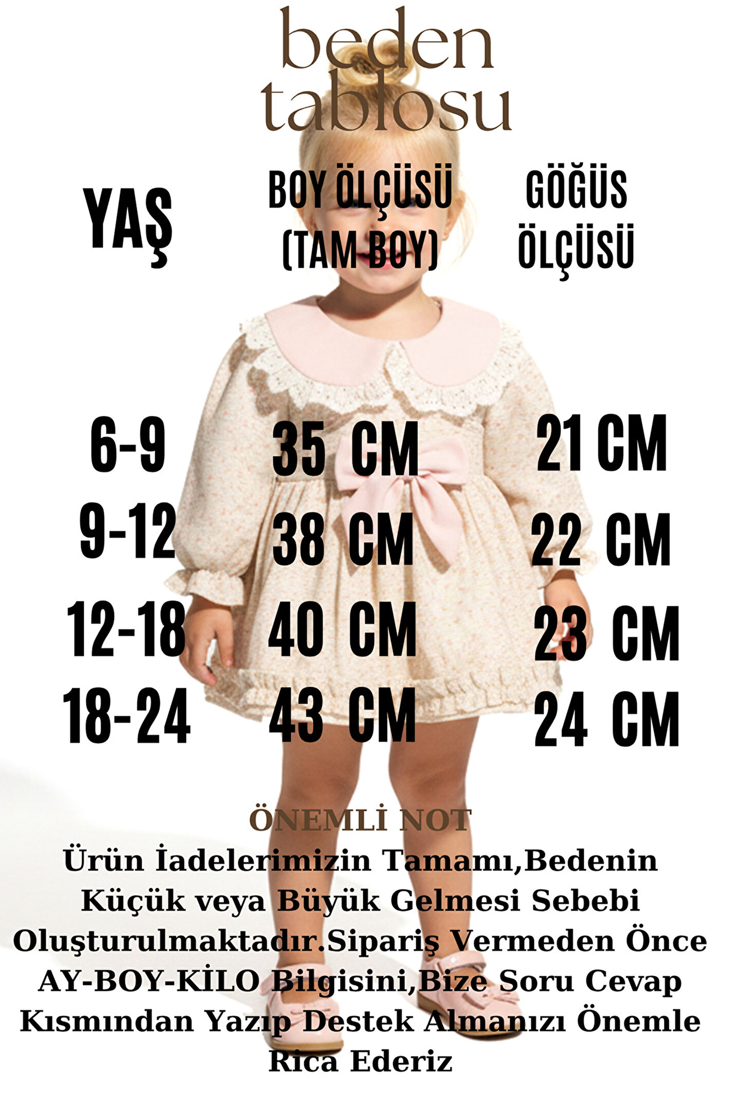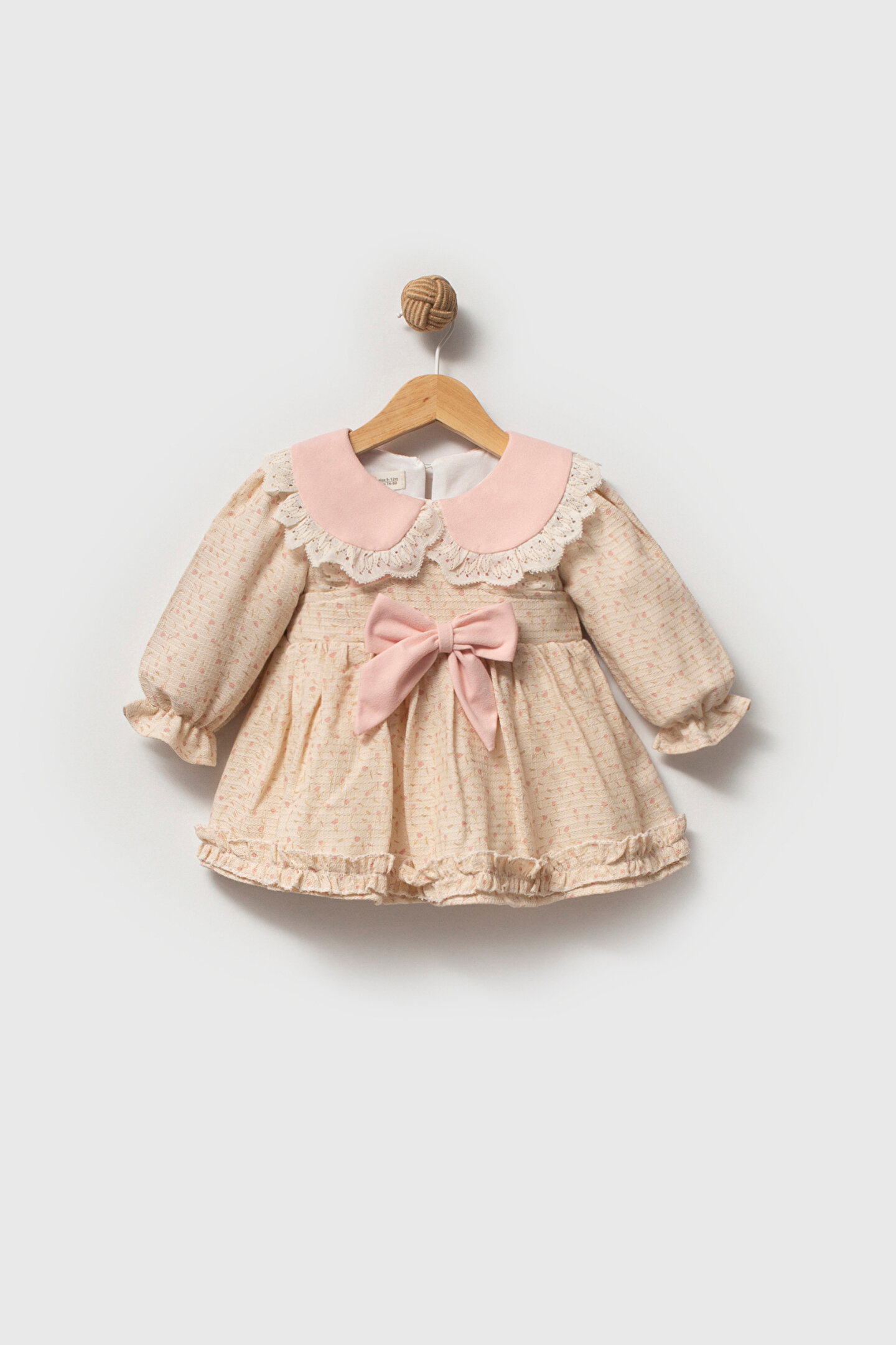 Mevsimlik Uzun Kollu Dantel Detaylı Kız Çocuk Elbisesi: Küçük prensesinizin özel günlerde zarafetini ve şıklığını ön plana çıkaracak bu elbise, önünde bulunan Yakalı fiyonk detayı ve dantel işlemeleriyle tasarlanmıştır.; Özellikler: Dantel Detaylar: Elbisenin ön kısmında ve kollarda bulunan dantel detaylar, zarafet ve incelik katarken, küçük prensesinizin görünümünü daha etkileyici hale getirir.; Önünde Yakalı Fiyonk Detayı: Elbisenin ön kısmında bulunan fiyonk detayı, sevimliliği ve şıklığı artırır.; Küçük prensesinizin görünümüne hoş bir dokunuş ekler.; Uzun Kollu Tasarım:Rahatlıkla giyilebilecek Uzun kollu tasarım, bebeğinizin serin kalmasını sağlar ve özgürce hareket etmesine olanak tanır.; Mevsimlik Kullanıma Uygun: Hafif yapısı ve nefes alabilen kumaşıyla rahatlıkla giyilebilir.; Özel Günler İçin Uygun: Özel günlerde tercih edilebilecek şık tasarımıyla bebeğinizin her anında göz kamaştırmasını sağlar.; Bu önü Yakalı fiyonklu ve dantel detaylı Uzun kollu kız çocuk elbisesi, küçük prensesinizin şık kalmasını sağlarken, aynı zamanda özel günlerde de zarafetini tamamlar.; Zarif detaylarıyla bezenmiş bu elbise, bebeğinizin tarzını ve güzelliğini ön plana çıkarır.