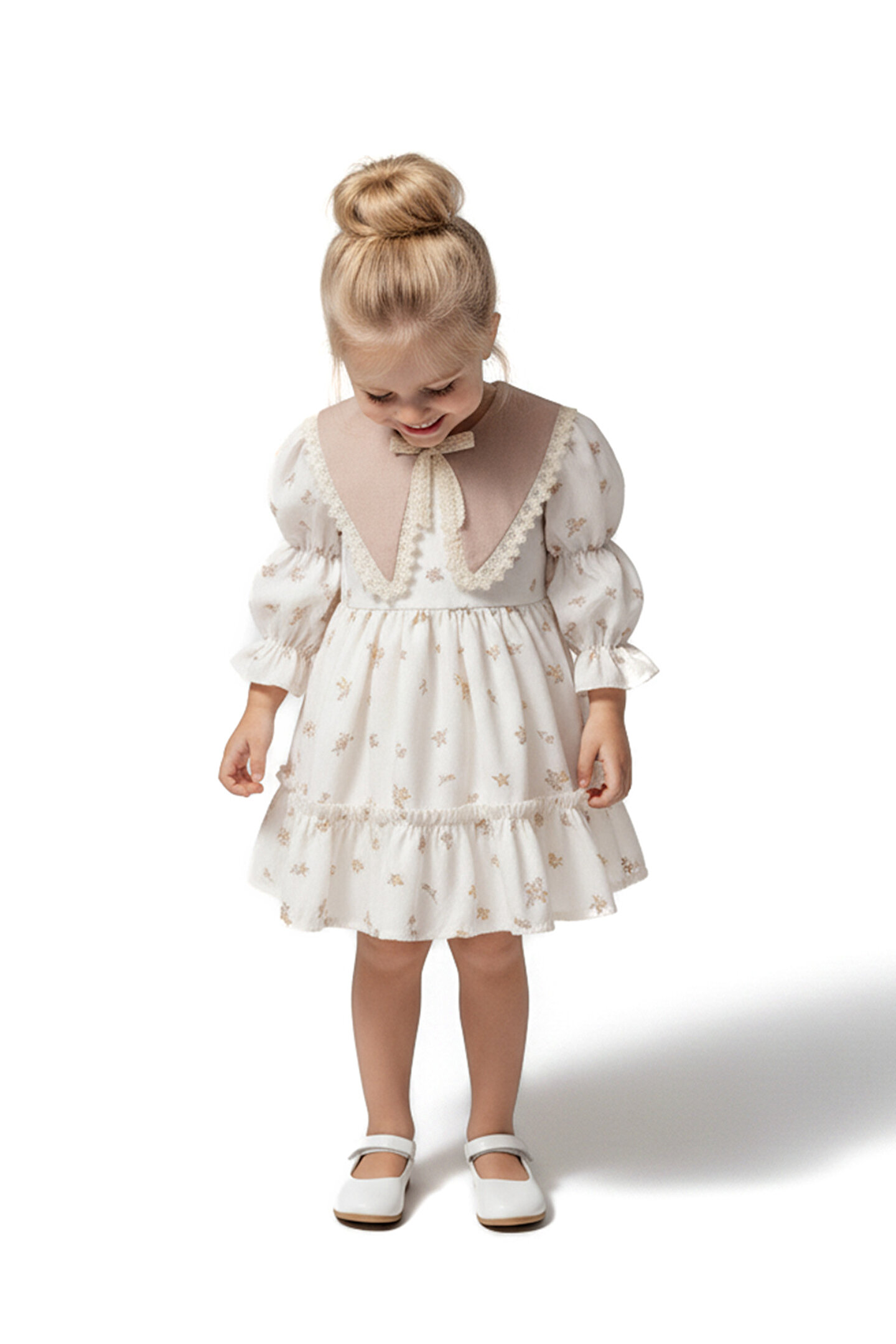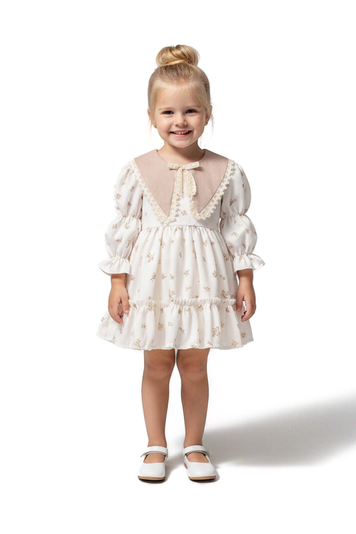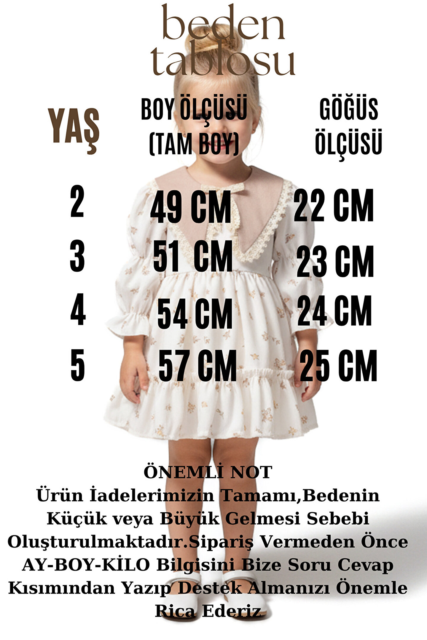 Mevsimlik Uzun Kollu Yakalı Dantel Detaylı Kız Çocuk Elbisesi: Küçük prensesinizin özel günlerde zarafetini ve şıklığını ön plana çıkaracak bu elbise, önünde bulunan Yakalı fiyonk detayı ve dantel işlemeleriyle tasarlanmıştır.; Özellikler: Dantel Detaylar: Elbisenin ön kısmında ve kollarda bulunan dantel detaylar, zarafet ve incelik katarken, küçük prensesinizin görünümünü daha etkileyici hale getirir.; Önünde Yakalı Fiyonk Detayı: Elbisenin ön kısmında bulunan fiyonk detayı, sevimliliği ve şıklığı artırır.; Küçük prensesinizin görünümüne hoş bir dokunuş ekler.; Uzun Kollu Tasarım:Rahatlıkla giyilebilecek Uzun kollu tasarım, bebeğinizin serin kalmasını sağlar ve özgürce hareket etmesine olanak tanır.; Mevsimlik Kullanıma Uygun: Hafif yapısı ve nefes alabilen kumaşıyla rahatlıkla giyilebilir.; Özel Günler İçin Uygun: Özel günlerde tercih edilebilecek şık tasarımıyla bebeğinizin her anında göz kamaştırmasını sağlar.; Bu önü Yakalı fiyonklu ve dantel detaylı Uzun kollu kız çocuk elbisesi, küçük prensesinizin şık kalmasını sağlarken, aynı zamanda özel günlerde de zarafetini tamamlar.; Zarif detaylarıyla bezenmiş bu elbise, bebeğinizin tarzını ve güzelliğini ön plana çıkarır.