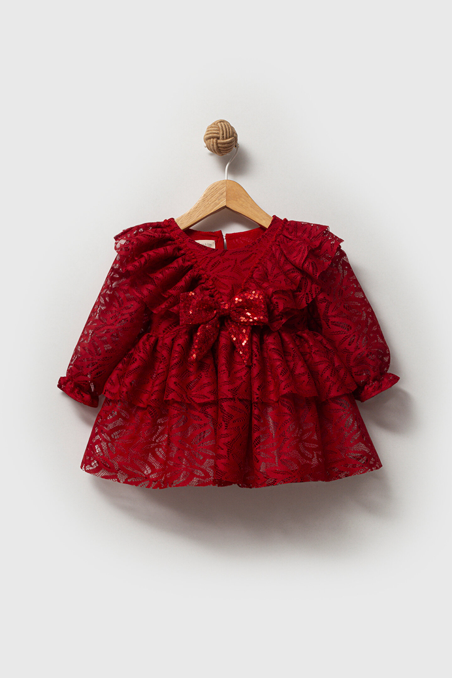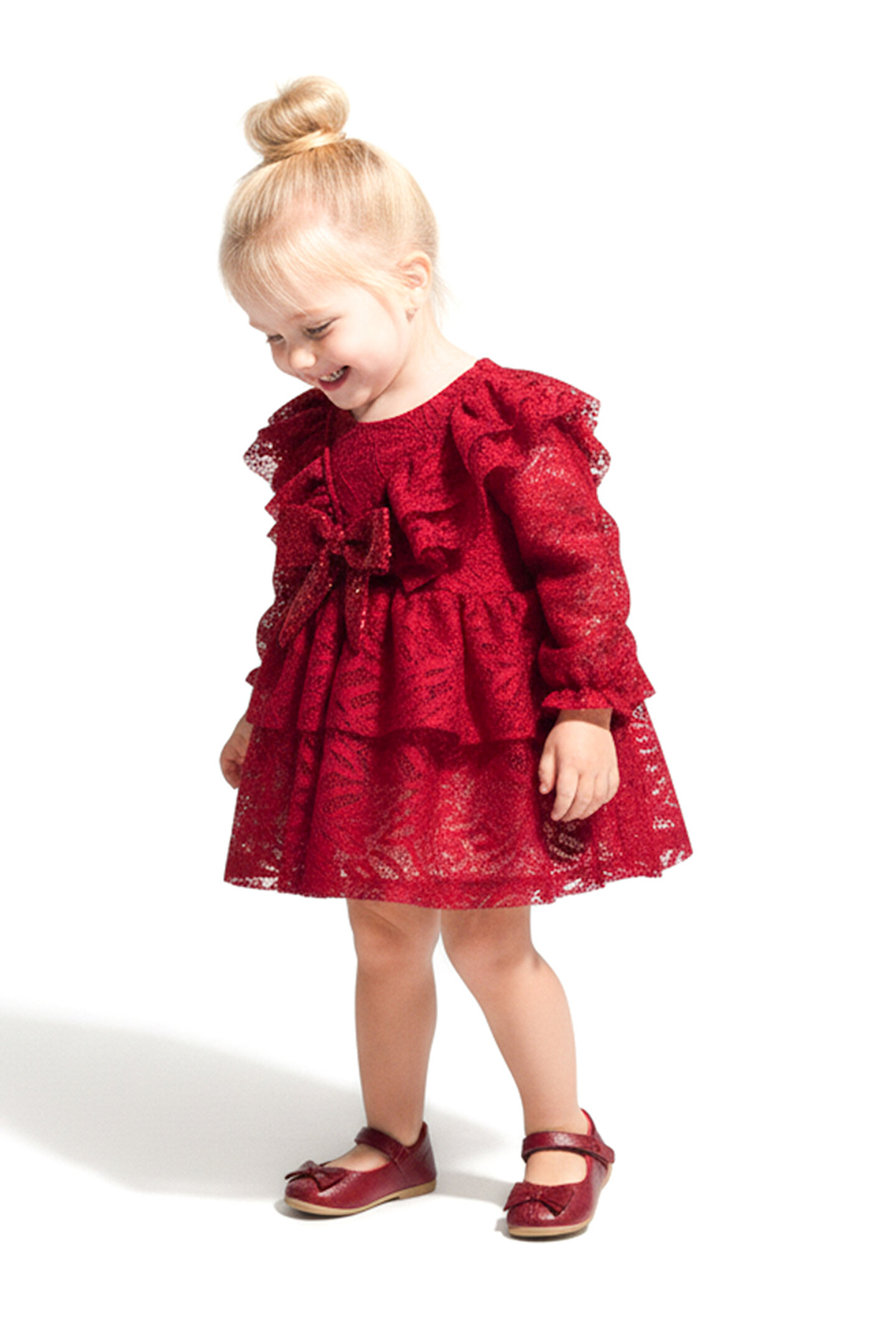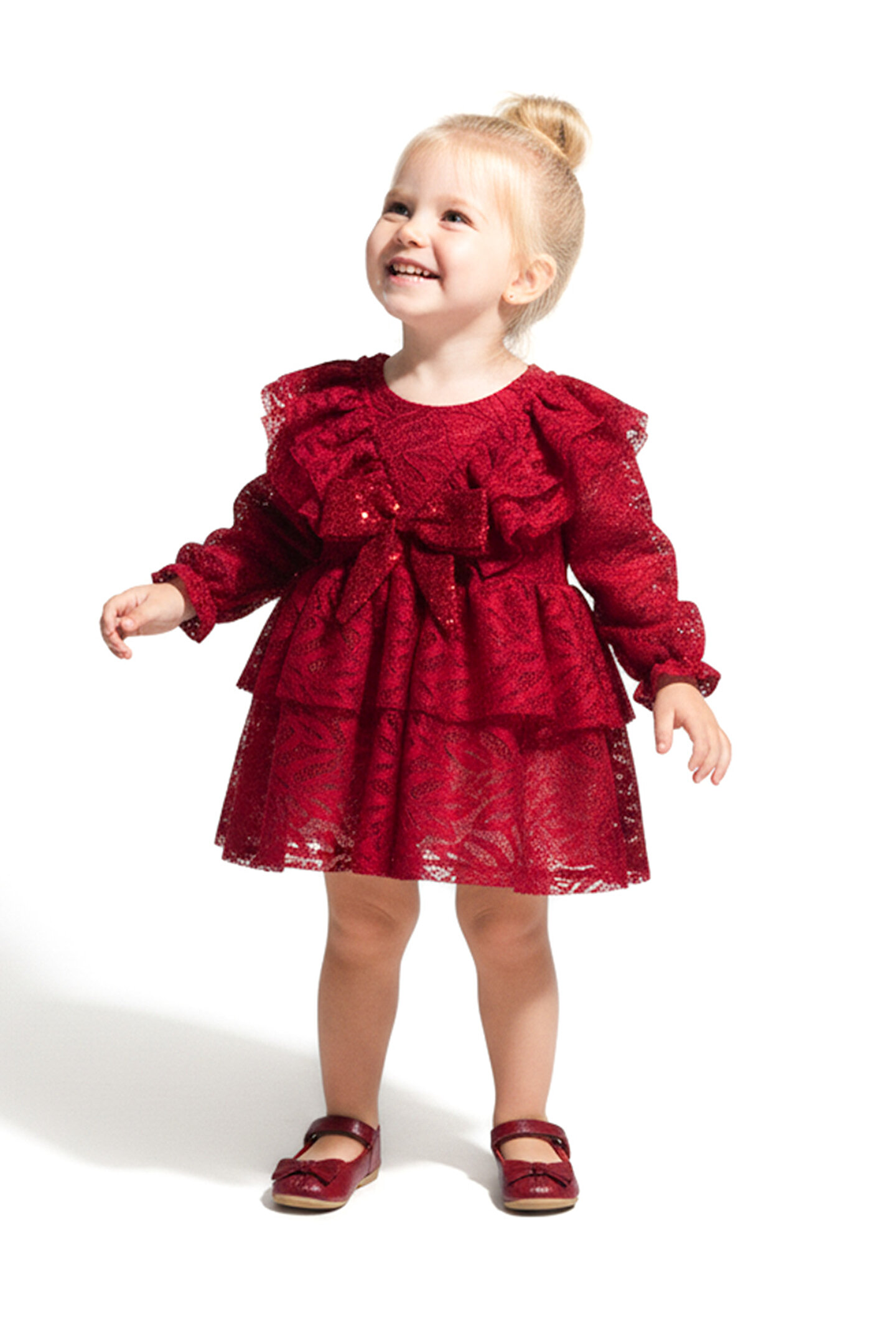 Mevsimlik Uzun Kollu Dantel Detaylı Kız Çocuk Elbisesi: Küçük prensesinizin özel günlerde zarafetini ve şıklığını ön plana çıkaracak bu elbise, önünde bulunan Yakalı fiyonk detayı ve dantel işlemeleriyle tasarlanmıştır.; Özellikler: Dantel Detaylar: Elbisenin ön kısmında ve kollarda bulunan dantel detaylar, zarafet ve incelik katarken, küçük prensesinizin görünümünü daha etkileyici hale getirir.; Önünde Yakalı Fiyonk Detayı: Elbisenin ön kısmında bulunan fiyonk detayı, sevimliliği ve şıklığı artırır.; Küçük prensesinizin görünümüne hoş bir dokunuş ekler.; Uzun Kollu Tasarım:Rahatlıkla giyilebilecek Uzun kollu tasarım, bebeğinizin serin kalmasını sağlar ve özgürce hareket etmesine olanak tanır.; Mevsimlik Kullanıma Uygun: Hafif yapısı ve nefes alabilen kumaşıyla rahatlıkla giyilebilir.; Özel Günler İçin Uygun: Özel günlerde tercih edilebilecek şık tasarımıyla bebeğinizin her anında göz kamaştırmasını sağlar.; Bu önü Yakalı fiyonklu ve dantel detaylı Uzun kollu kız çocuk elbisesi, küçük prensesinizin şık kalmasını sağlarken, aynı zamanda özel günlerde de zarafetini tamamlar.; Zarif detaylarıyla bezenmiş bu elbise, bebeğinizin tarzını ve güzelliğini ön plana çıkarır.