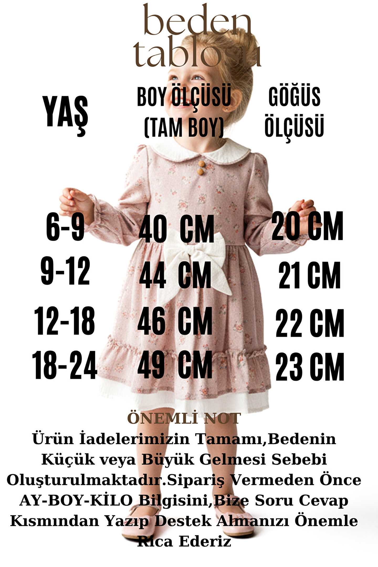 Mevsimlik Uzun Kollu Dantel Detaylı Kız Çocuk Elbisesi: Küçük prensesinizin özel günlerde zarafetini ve şıklığını ön plana çıkaracak bu elbise, önünde bulunan Yakalı fiyonk detayı ve dantel işlemeleriyle tasarlanmıştır.; Özellikler: Dantel Detaylar: Elbisenin ön kısmında ve kollarda bulunan dantel detaylar, zarafet ve incelik katarken, küçük prensesinizin görünümünü daha etkileyici hale getirir.; Önünde Yakalı Fiyonk Detayı: Elbisenin ön kısmında bulunan fiyonk detayı, sevimliliği ve şıklığı artırır.; Küçük prensesinizin görünümüne hoş bir dokunuş ekler.; Uzun Kollu Tasarım:Rahatlıkla giyilebilecek Uzun kollu tasarım, bebeğinizin serin kalmasını sağlar ve özgürce hareket etmesine olanak tanır.; Mevsimlik Kullanıma Uygun: Hafif yapısı ve nefes alabilen kumaşıyla rahatlıkla giyilebilir.; Özel Günler İçin Uygun: Özel günlerde tercih edilebilecek şık tasarımıyla bebeğinizin her anında göz kamaştırmasını sağlar.; Bu önü Yakalı fiyonklu ve dantel detaylı Uzun kollu kız çocuk elbisesi, küçük prensesinizin şık kalmasını sağlarken, aynı zamanda özel günlerde de zarafetini tamamlar.; Zarif detaylarıyla bezenmiş bu elbise, bebeğinizin tarzını ve güzelliğini ön plana çıkarır.