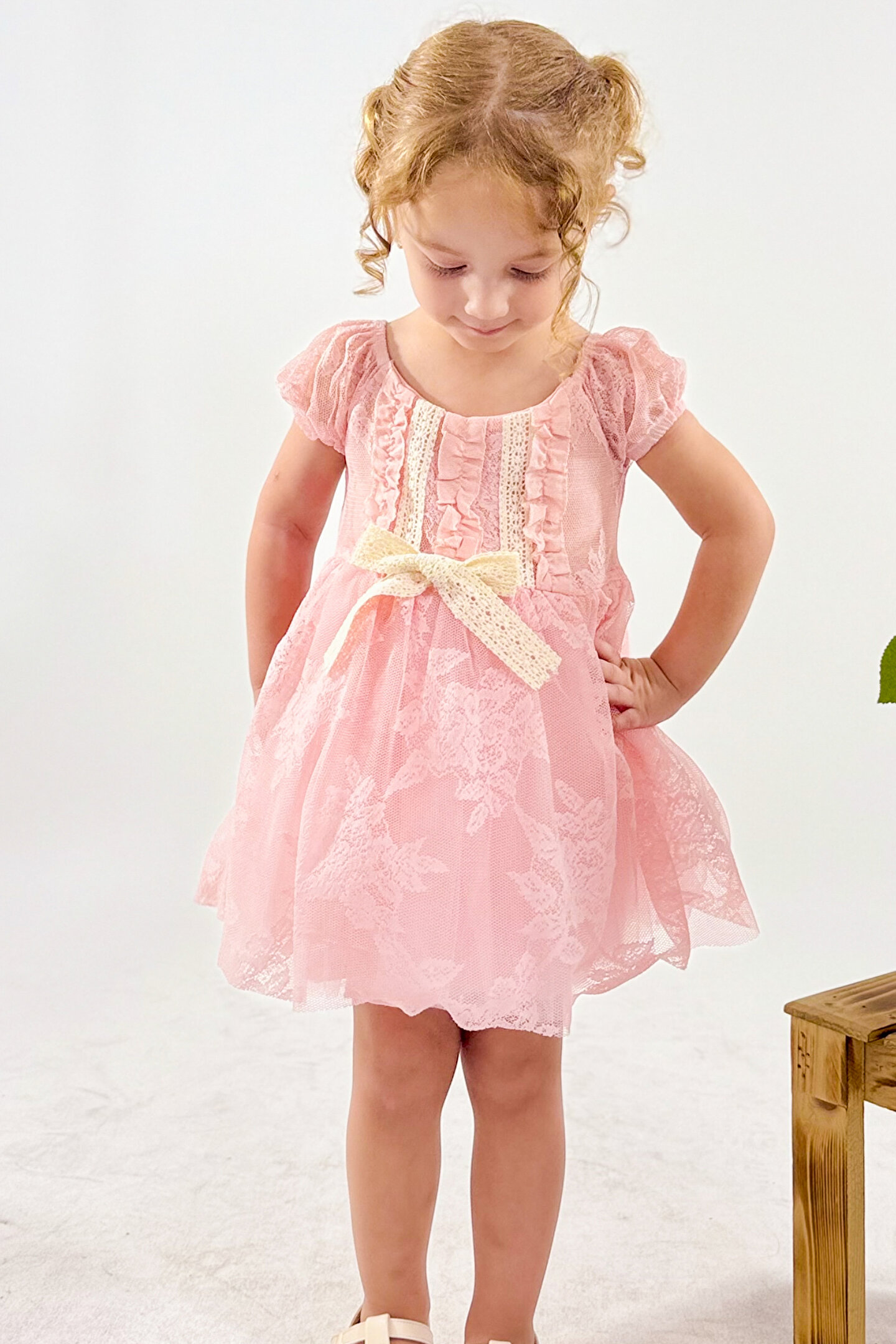 Yazlık Kısa Kollu Kolsuz Askılı Dantel Detaylı Astarlı Kız Çocuk Elbisesi: Küçük prensesinizin yaz mevsiminde özel günlerde zarafetini ve şıklığını ön plana çıkaracak bu elbise, önünde bulunan fiyonk detayı ve dantel işlemeleriyle tasarlanmıştır.; Ayrıca etek kısmında bulunan yırtmaç detayı, hareket özgürlüğü sağlarken bebeğinizin zarif bir görünüm sergilemesini sağlar.; Özellikler: Dantel Detaylar: Elbisenin ön kısmında ve kollarda bulunan dantel detaylar, zarafet ve incelik katarken, küçük prensesinizin görünümünü daha etkileyici hale getirir.; Önünde Fiyonk Detayı: Elbisenin ön kısmında bulunan fiyonk detayı, sevimliliği ve şıklığı artırır.; Küçük prensesinizin görünümüne hoş bir dokunuş ekler.; Yırtmaç Detayı: Etek kısmında bulunan yırtmaç detayı, hareket özgürlüğü sağlarken, elbisenin tasarımına dinamizm katar.; Kısa Kollu Tasarım: Sıcak yaz günlerinde rahatlıkla giyilebilecek kısa kollu tasarım, bebeğinizin serin kalmasını sağlar ve özgürce hareket etmesine olanak tanır.; Yazlık Kullanıma Uygun: Hafif yapısı ve nefes alabilen kumaşıyla yaz aylarında rahatlıkla giyilebilir.; Özel Günler İçin Uygun: Özel günlerde tercih edilebilecek şık tasarımıyla bebeğinizin her anında göz kamaştırmasını sağlar.; Bu yırtmaçlı, önü fiyonklu ve dantel detaylı kısa kollu Kolsuz Askılı kız çocuk elbisesi, küçük prensesinizin yazın serin ve şık kalmasını sağlarken, aynı zamanda özel günlerde de zarafetini tamamlar.; Zarif detaylarıyla bezenmiş bu elbise, bebeğinizin tarzını ve güzelliğini ön plana çıkarır.