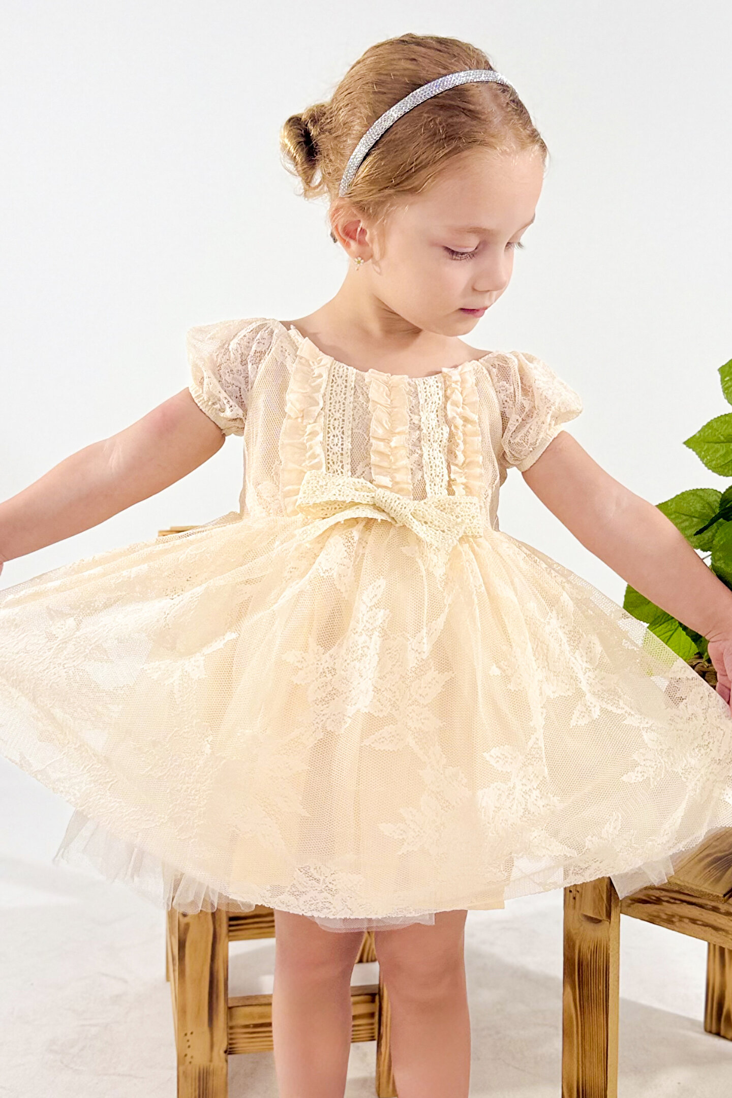 Yazlık Kısa Kollu Kolsuz Askılı Dantel Detaylı Astarlı Kız Çocuk Elbisesi: Küçük prensesinizin yaz mevsiminde özel günlerde zarafetini ve şıklığını ön plana çıkaracak bu elbise, önünde bulunan fiyonk detayı ve dantel işlemeleriyle tasarlanmıştır.; Ayrıca etek kısmında bulunan yırtmaç detayı, hareket özgürlüğü sağlarken bebeğinizin zarif bir görünüm sergilemesini sağlar.; Özellikler: Dantel Detaylar: Elbisenin ön kısmında ve kollarda bulunan dantel detaylar, zarafet ve incelik katarken, küçük prensesinizin görünümünü daha etkileyici hale getirir.; Önünde Fiyonk Detayı: Elbisenin ön kısmında bulunan fiyonk detayı, sevimliliği ve şıklığı artırır.; Küçük prensesinizin görünümüne hoş bir dokunuş ekler.; Yırtmaç Detayı: Etek kısmında bulunan yırtmaç detayı, hareket özgürlüğü sağlarken, elbisenin tasarımına dinamizm katar.; Kısa Kollu Tasarım: Sıcak yaz günlerinde rahatlıkla giyilebilecek kısa kollu tasarım, bebeğinizin serin kalmasını sağlar ve özgürce hareket etmesine olanak tanır.; Yazlık Kullanıma Uygun: Hafif yapısı ve nefes alabilen kumaşıyla yaz aylarında rahatlıkla giyilebilir.; Özel Günler İçin Uygun: Özel günlerde tercih edilebilecek şık tasarımıyla bebeğinizin her anında göz kamaştırmasını sağlar.; Bu yırtmaçlı, önü fiyonklu ve dantel detaylı kısa kollu Kolsuz Askılı kız çocuk elbisesi, küçük prensesinizin yazın serin ve şık kalmasını sağlarken, aynı zamanda özel günlerde de zarafetini tamamlar.; Zarif detaylarıyla bezenmiş bu elbise, bebeğinizin tarzını ve güzelliğini ön plana çıkarır.