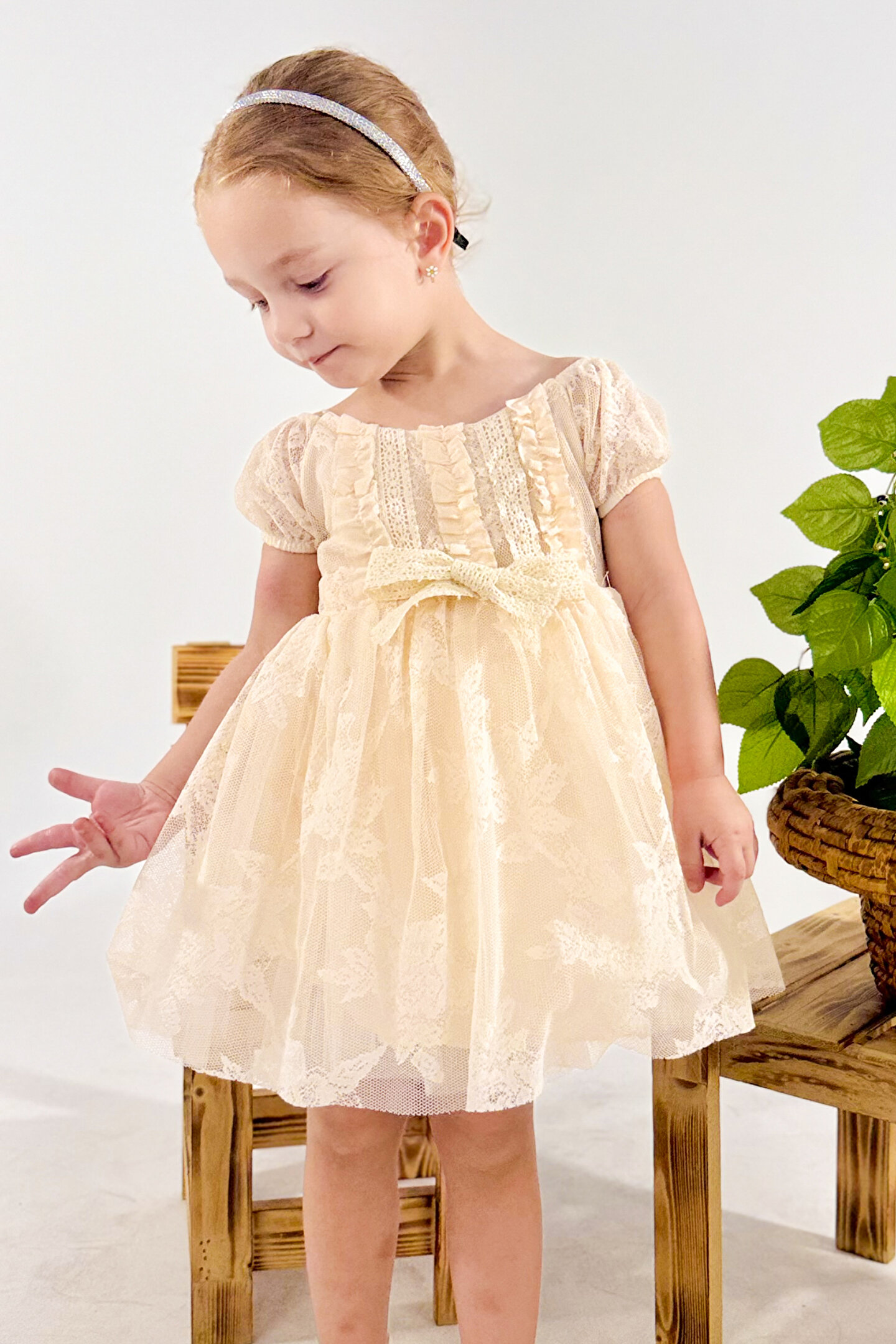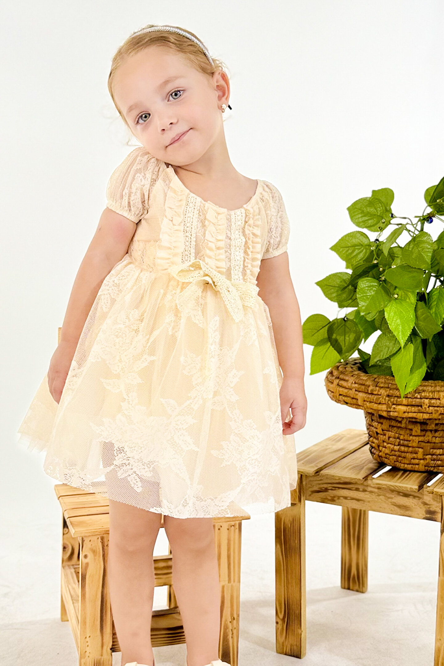 Yazlık Kısa Kollu Kolsuz Askılı Dantel Detaylı Astarlı Kız Çocuk Elbisesi: Küçük prensesinizin yaz mevsiminde özel günlerde zarafetini ve şıklığını ön plana çıkaracak bu elbise, önünde bulunan fiyonk detayı ve dantel işlemeleriyle tasarlanmıştır.; Ayrıca etek kısmında bulunan yırtmaç detayı, hareket özgürlüğü sağlarken bebeğinizin zarif bir görünüm sergilemesini sağlar.; Özellikler: Dantel Detaylar: Elbisenin ön kısmında ve kollarda bulunan dantel detaylar, zarafet ve incelik katarken, küçük prensesinizin görünümünü daha etkileyici hale getirir.; Önünde Fiyonk Detayı: Elbisenin ön kısmında bulunan fiyonk detayı, sevimliliği ve şıklığı artırır.; Küçük prensesinizin görünümüne hoş bir dokunuş ekler.; Yırtmaç Detayı: Etek kısmında bulunan yırtmaç detayı, hareket özgürlüğü sağlarken, elbisenin tasarımına dinamizm katar.; Kısa Kollu Tasarım: Sıcak yaz günlerinde rahatlıkla giyilebilecek kısa kollu tasarım, bebeğinizin serin kalmasını sağlar ve özgürce hareket etmesine olanak tanır.; Yazlık Kullanıma Uygun: Hafif yapısı ve nefes alabilen kumaşıyla yaz aylarında rahatlıkla giyilebilir.; Özel Günler İçin Uygun: Özel günlerde tercih edilebilecek şık tasarımıyla bebeğinizin her anında göz kamaştırmasını sağlar.; Bu yırtmaçlı, önü fiyonklu ve dantel detaylı kısa kollu Kolsuz Askılı kız çocuk elbisesi, küçük prensesinizin yazın serin ve şık kalmasını sağlarken, aynı zamanda özel günlerde de zarafetini tamamlar.; Zarif detaylarıyla bezenmiş bu elbise, bebeğinizin tarzını ve güzelliğini ön plana çıkarır.