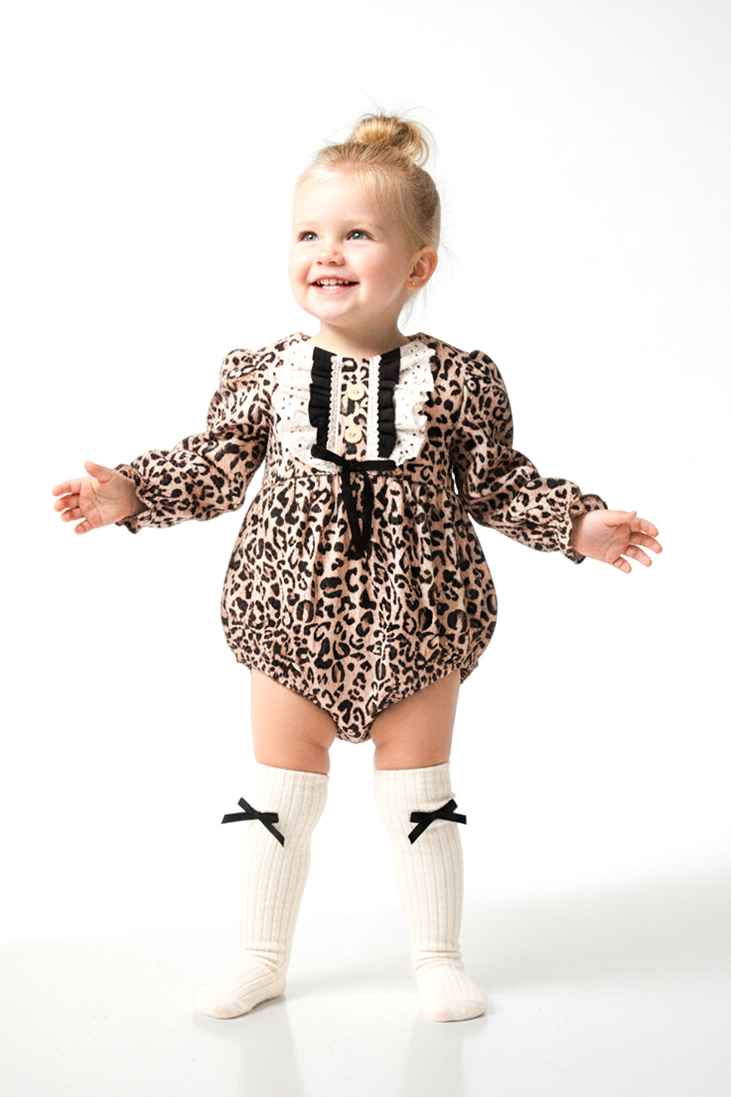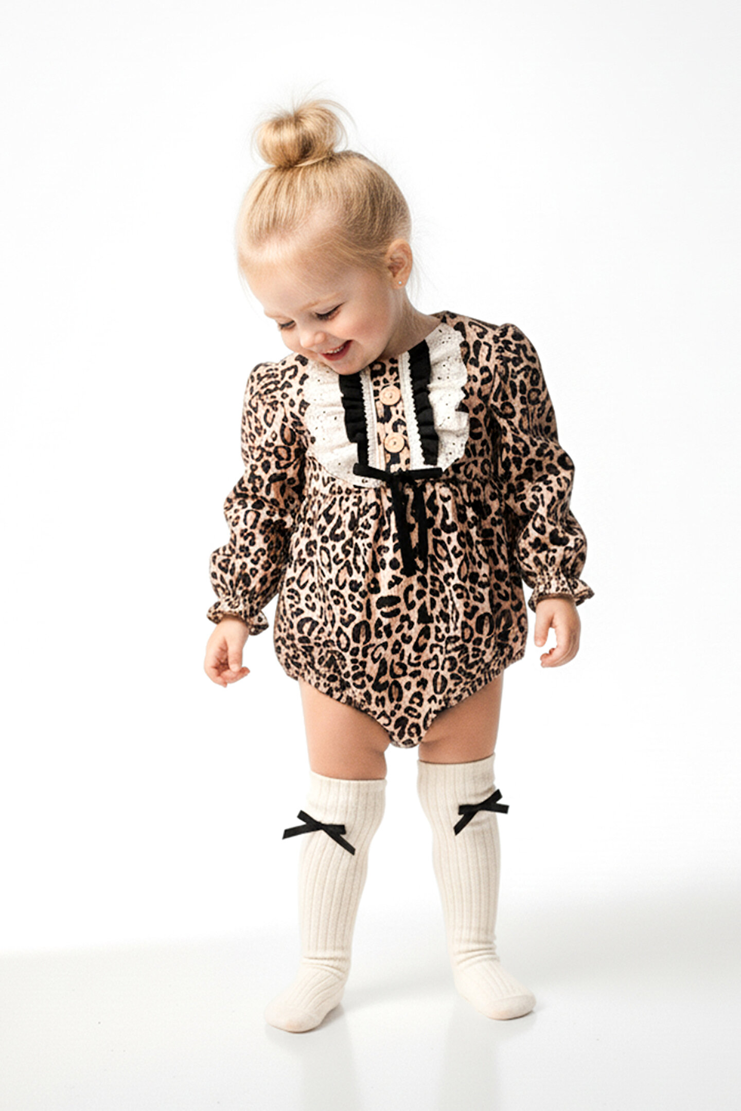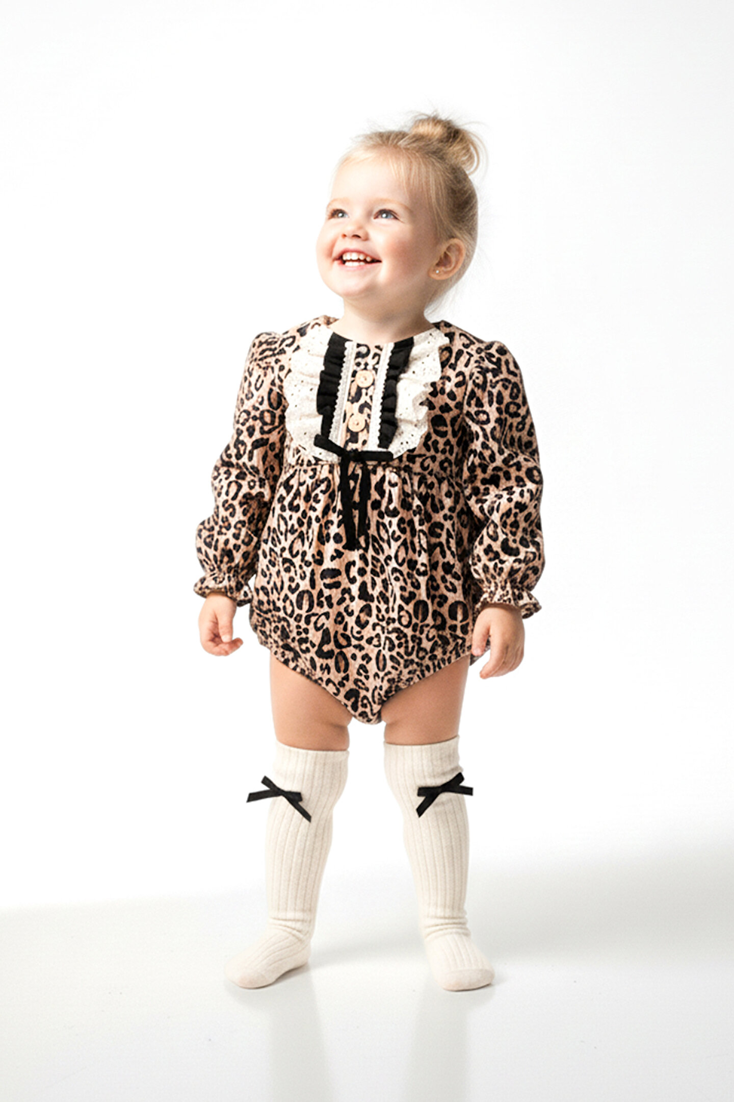 Baby Animals Kız Bebek Kız Çocuk Romper Doğum Günü Parti Düğün Leopar Romper Dantelli Fiyonklu Uzun Kol Romper