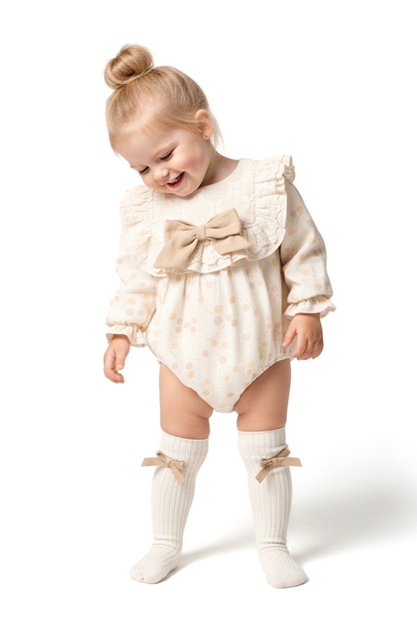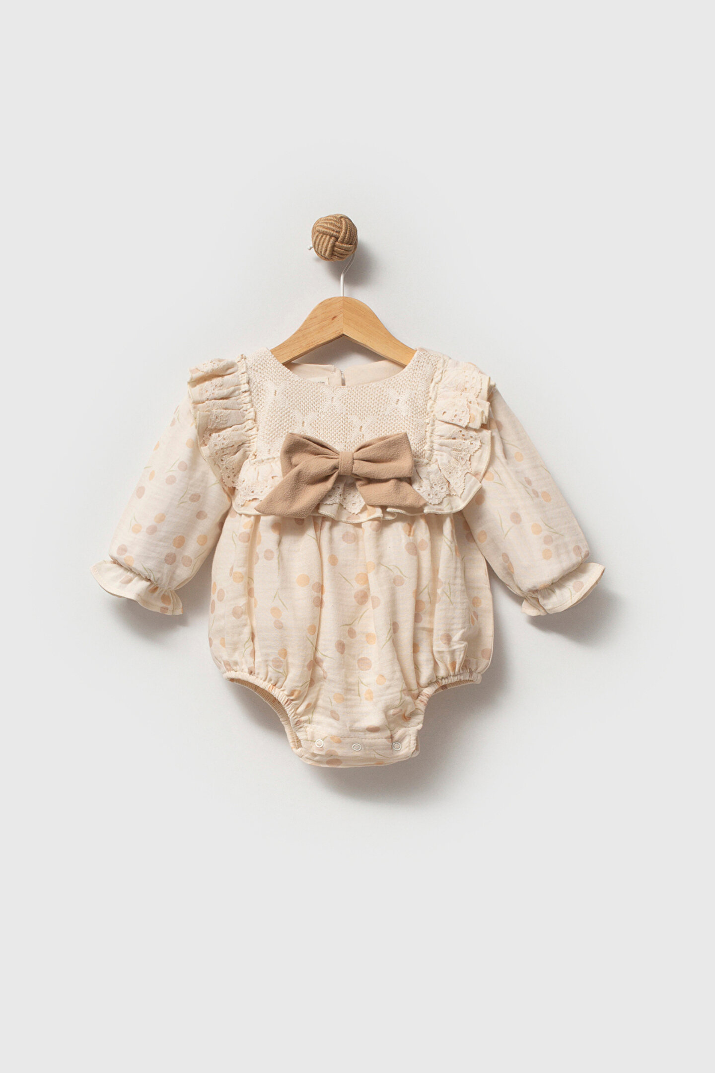 Mevsimlik Uzun Kollu Dantel Detaylı Kız Çocuk Elbise Romper: Küçük prensesinizin yaz mevsiminde özel günlerde zarafetini ve şıklığını ön plana çıkaracak bu elbise Romper, önünde bulunan fiyonk detayı ve dantel işlemeleriyle tasarlanmıştır.; Ayrıca etek kısmında bulunan yırtmaç detayı, hareket özgürlüğü sağlarken bebeğinizin zarif bir görünüm sergilemesini sağlar.; Özellikler: Dantel Detaylar: Elbisenin Romper ön kısmında ve kollarda bulunan dantel detaylar, zarafet ve incelik katarken, küçük prensesinizin görünümünü daha etkileyici hale getirir.; Önünde Fiyonk Detayı: Elbisenin ön kısmında bulunan fiyonk detayı, sevimliliği ve şıklığı artırır.; Küçük prensesinizin görünümüne hoş bir dokunuş ekler.; Yırtmaç Detayı: Etek kısmında bulunan yırtmaç detayı, hareket özgürlüğü sağlarken, elbisenin tasarımına dinamizm katar.; Uzun Kollu Tasarım:Rahatlıkla giyilebilecek Uzun kollu tasarım, bebeğinizin serin kalmasını sağlar ve özgürce hareket etmesine olanak tanır.; Mevsimlik Kullanıma Uygun: Hafif yapısı ve nefes alabilen kumaşıyla rahatlıkla giyilebilir.; Özel Günler İçin Uygun: Özel günlerde tercih edilebilecek şık tasarımıyla bebeğinizin her anında göz kamaştırmasını sağlar.; Bu yırtmaçlı, önü fiyonklu ve dantel detaylı Uzun kollu kız çocuk elbisesi Romper, küçük prensesinizin serin ve şık kalmasını sağlarken, aynı zamanda özel günlerde de zarafetini tamamlar.; Zarif detaylarıyla bezenmiş bu elbise Romper, bebeğinizin tarzını ve güzelliğini ön plana çıkarır.