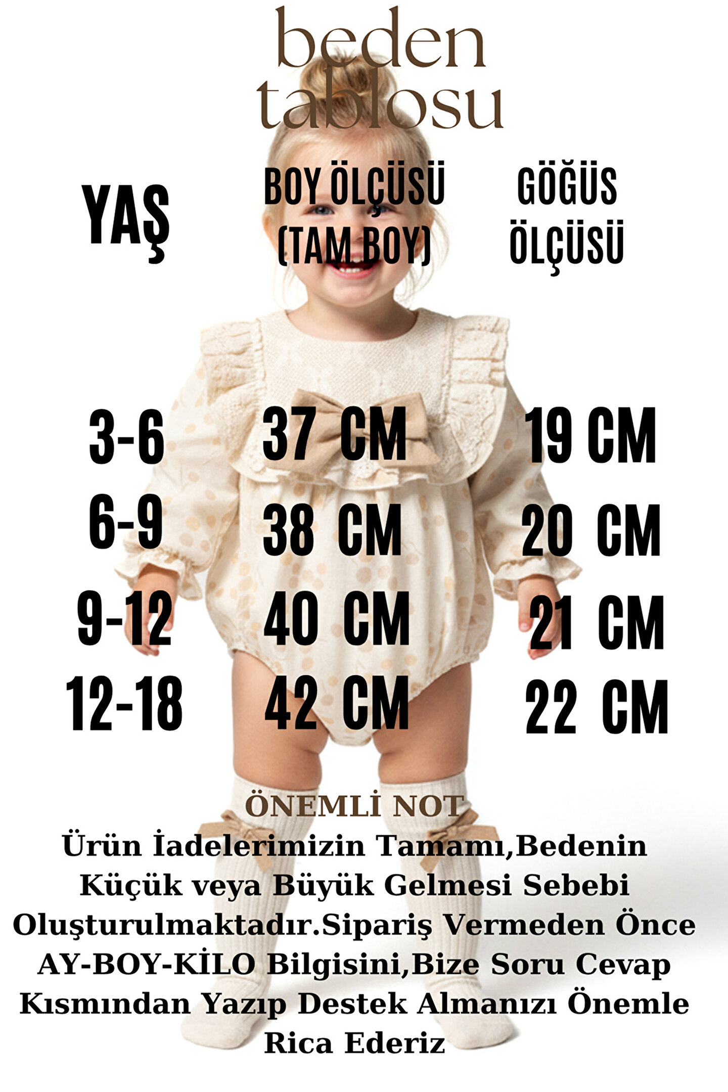 Mevsimlik Uzun Kollu Dantel Detaylı Kız Çocuk Elbise Romper: Küçük prensesinizin yaz mevsiminde özel günlerde zarafetini ve şıklığını ön plana çıkaracak bu elbise Romper, önünde bulunan fiyonk detayı ve dantel işlemeleriyle tasarlanmıştır.; Ayrıca etek kısmında bulunan yırtmaç detayı, hareket özgürlüğü sağlarken bebeğinizin zarif bir görünüm sergilemesini sağlar.; Özellikler: Dantel Detaylar: Elbisenin Romper ön kısmında ve kollarda bulunan dantel detaylar, zarafet ve incelik katarken, küçük prensesinizin görünümünü daha etkileyici hale getirir.; Önünde Fiyonk Detayı: Elbisenin ön kısmında bulunan fiyonk detayı, sevimliliği ve şıklığı artırır.; Küçük prensesinizin görünümüne hoş bir dokunuş ekler.; Yırtmaç Detayı: Etek kısmında bulunan yırtmaç detayı, hareket özgürlüğü sağlarken, elbisenin tasarımına dinamizm katar.; Uzun Kollu Tasarım:Rahatlıkla giyilebilecek Uzun kollu tasarım, bebeğinizin serin kalmasını sağlar ve özgürce hareket etmesine olanak tanır.; Mevsimlik Kullanıma Uygun: Hafif yapısı ve nefes alabilen kumaşıyla rahatlıkla giyilebilir.; Özel Günler İçin Uygun: Özel günlerde tercih edilebilecek şık tasarımıyla bebeğinizin her anında göz kamaştırmasını sağlar.; Bu yırtmaçlı, önü fiyonklu ve dantel detaylı Uzun kollu kız çocuk elbisesi Romper, küçük prensesinizin serin ve şık kalmasını sağlarken, aynı zamanda özel günlerde de zarafetini tamamlar.; Zarif detaylarıyla bezenmiş bu elbise Romper, bebeğinizin tarzını ve güzelliğini ön plana çıkarır.