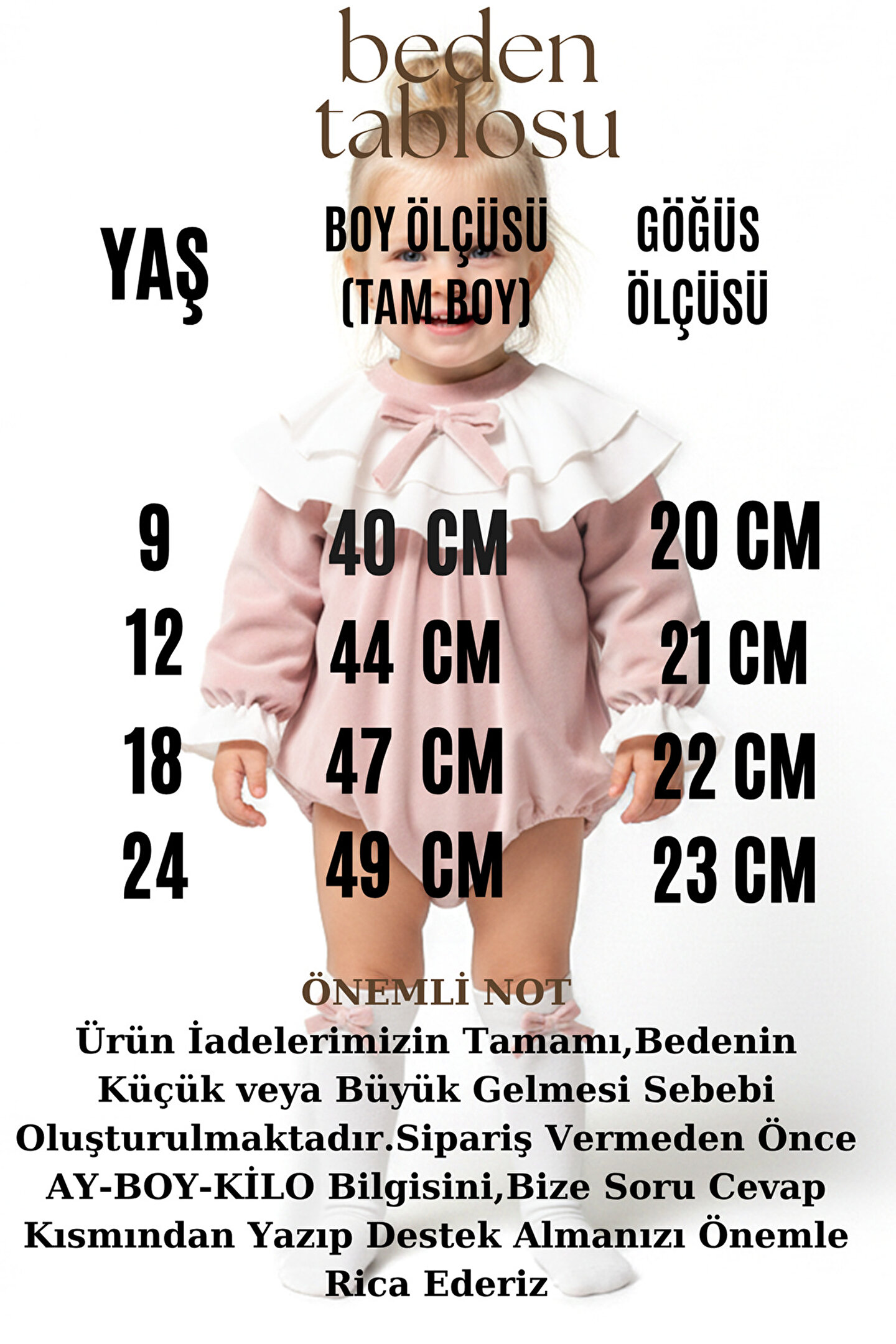 Mevsimlik Uzun Kollu Dantel Detaylı Kız Çocuk Elbise Romper: Küçük prensesinizin yaz mevsiminde özel günlerde zarafetini ve şıklığını ön plana çıkaracak bu elbise Romper, önünde bulunan fiyonk detayı ve dantel işlemeleriyle tasarlanmıştır.; Ayrıca etek kısmında bulunan yırtmaç detayı, hareket özgürlüğü sağlarken bebeğinizin zarif bir görünüm sergilemesini sağlar.; Özellikler: Dantel Detaylar: Elbisenin Romper ön kısmında ve kollarda bulunan dantel detaylar, zarafet ve incelik katarken, küçük prensesinizin görünümünü daha etkileyici hale getirir.; Önünde Fiyonk Detayı: Elbisenin ön kısmında bulunan fiyonk detayı, sevimliliği ve şıklığı artırır.; Küçük prensesinizin görünümüne hoş bir dokunuş ekler.; Yırtmaç Detayı: Etek kısmında bulunan yırtmaç detayı, hareket özgürlüğü sağlarken, elbisenin tasarımına dinamizm katar.; Uzun Kollu Tasarım:Rahatlıkla giyilebilecek Uzun kollu tasarım, bebeğinizin serin kalmasını sağlar ve özgürce hareket etmesine olanak tanır.; Mevsimlik Kullanıma Uygun: Hafif yapısı ve nefes alabilen kumaşıyla rahatlıkla giyilebilir.; Özel Günler İçin Uygun: Özel günlerde tercih edilebilecek şık tasarımıyla bebeğinizin her anında göz kamaştırmasını sağlar.; Bu yırtmaçlı, önü fiyonklu ve dantel detaylı Uzun kollu kız çocuk elbisesi Romper, küçük prensesinizin serin ve şık kalmasını sağlarken, aynı zamanda özel günlerde de zarafetini tamamlar.; Zarif detaylarıyla bezenmiş bu elbise Romper, bebeğinizin tarzını ve güzelliğini ön plana çıkarır.