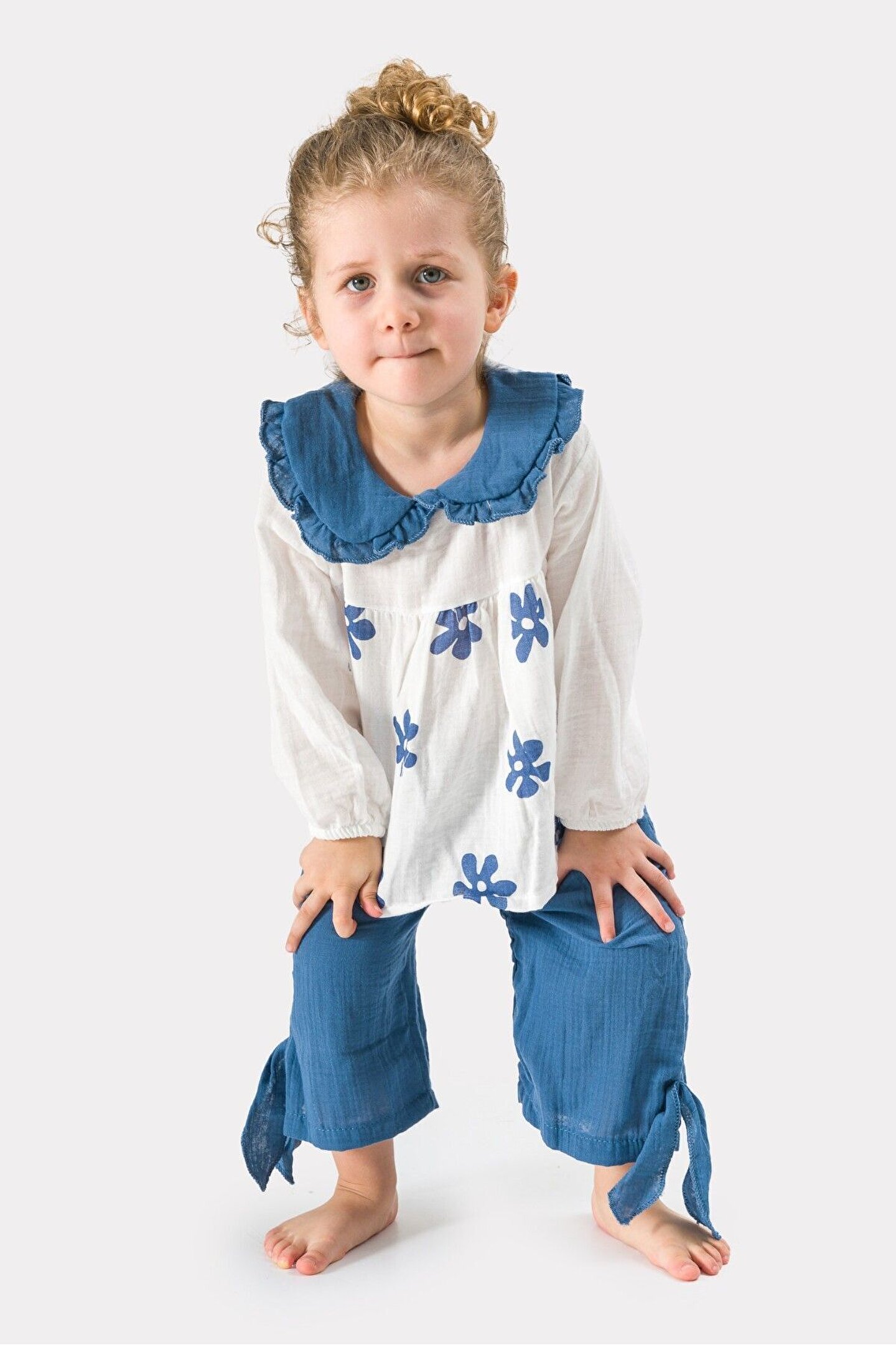Kız Çocuk Uzun Kollu Müslin Kumaş Çiçek Baskılı Müslin Alt Üst Bebek Takımı