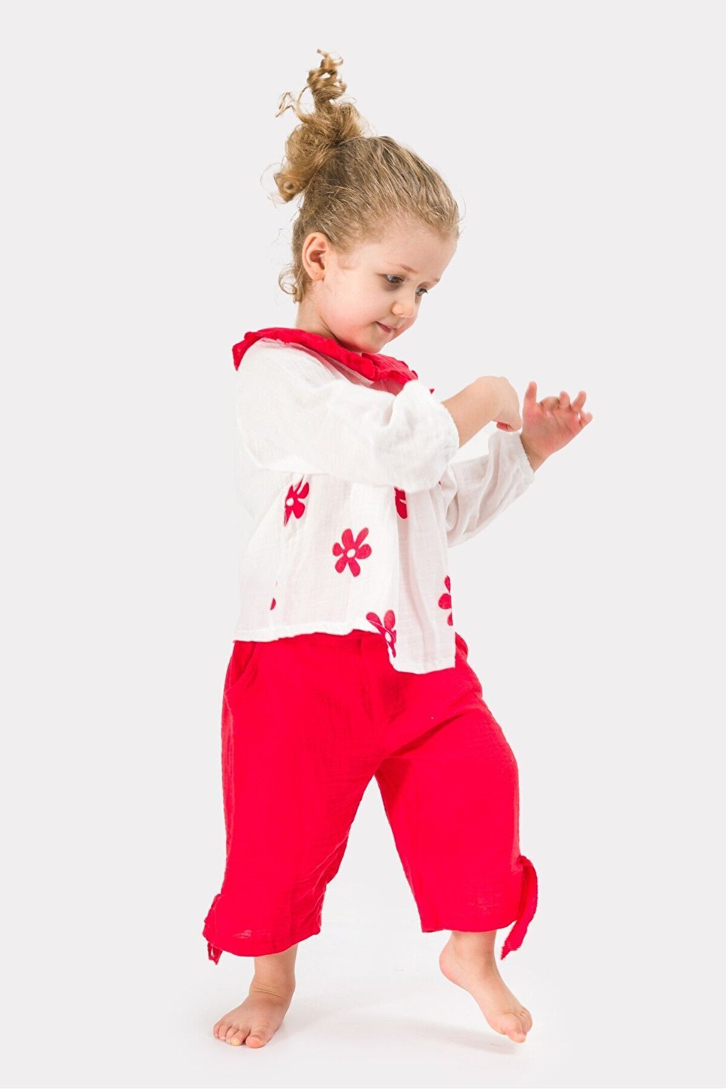 Baharın canlılığını ve neşesini yansıtan çiçek desenli kız çocuk takımı, kızınızın gardırobunu renklendiriyor! Müslin kumaştan üretilmiş bu takım, kızınızın hassas cildine yumuşak bir dokunuş sunar ve gün boyu rahatlık sağlar. ; Takımın zarif çiçek deseni, kızınıza şıklık katarken onun doğayla iç içe hissetmesini sağlar. ; Kızınızın aktif yaşam tarzına uygun olarak tasarlanan bu takım, rahatlığıyla ön plana çıkıyor ve hareket etmesini kısıtlamıyor. ; Üst ve alt kombinasyonuyla pratik bir giyim seçeneği sunan bu takım, kızınızın günlük aktivitelerinde özgürce hareket etmesine imkan tanırken, onu şık ve zarif gösterir. ; Bu bahar, kızınızın tarzını ve konforunu ön planda tutun. ; Çiçek desenli kız çocuk takımıyla, onun neşesine neşe katın ve baharın keyfini birlikte çıkarın.;