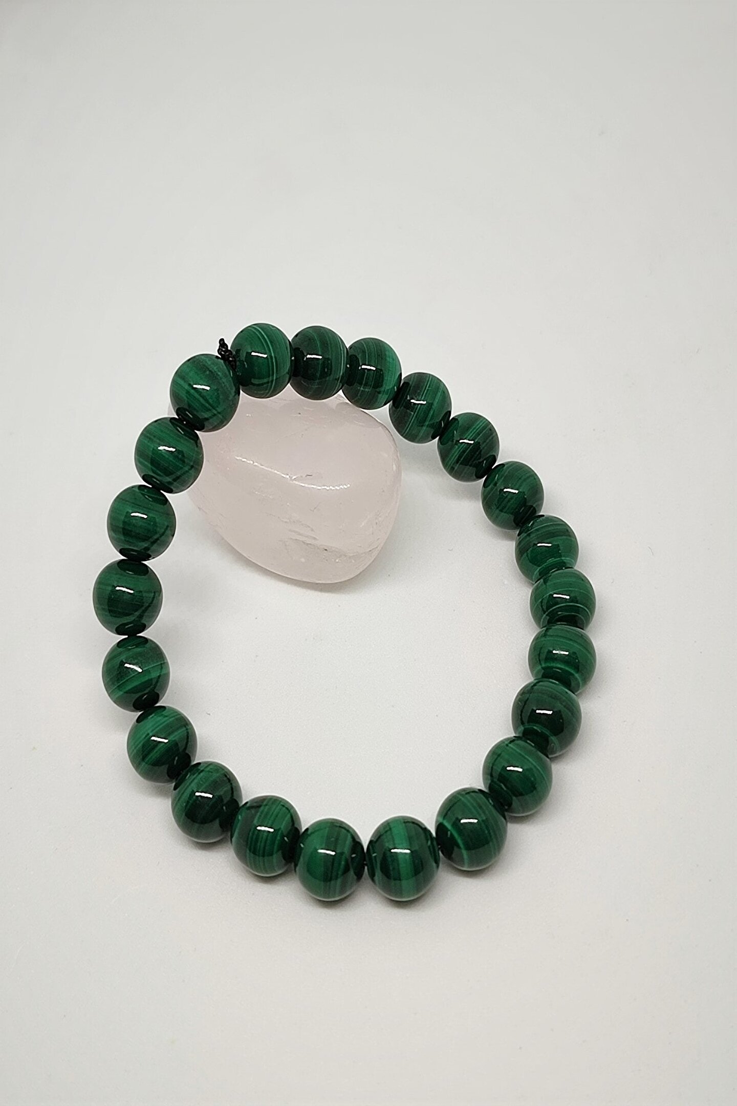 Doğal malahit taşı kullanılarak üretilmiş, şıklığı ve doğallığı bir arada sunan bileklik; Sertifikalı malahit taşı ile kalite ve güvenilirlik garantisi; 8 mm boyutundaki taşlar, zarif ve modern bir görünüm sağlar; Her bilek boyutuna uyum sağlayacak esnek tasarım;