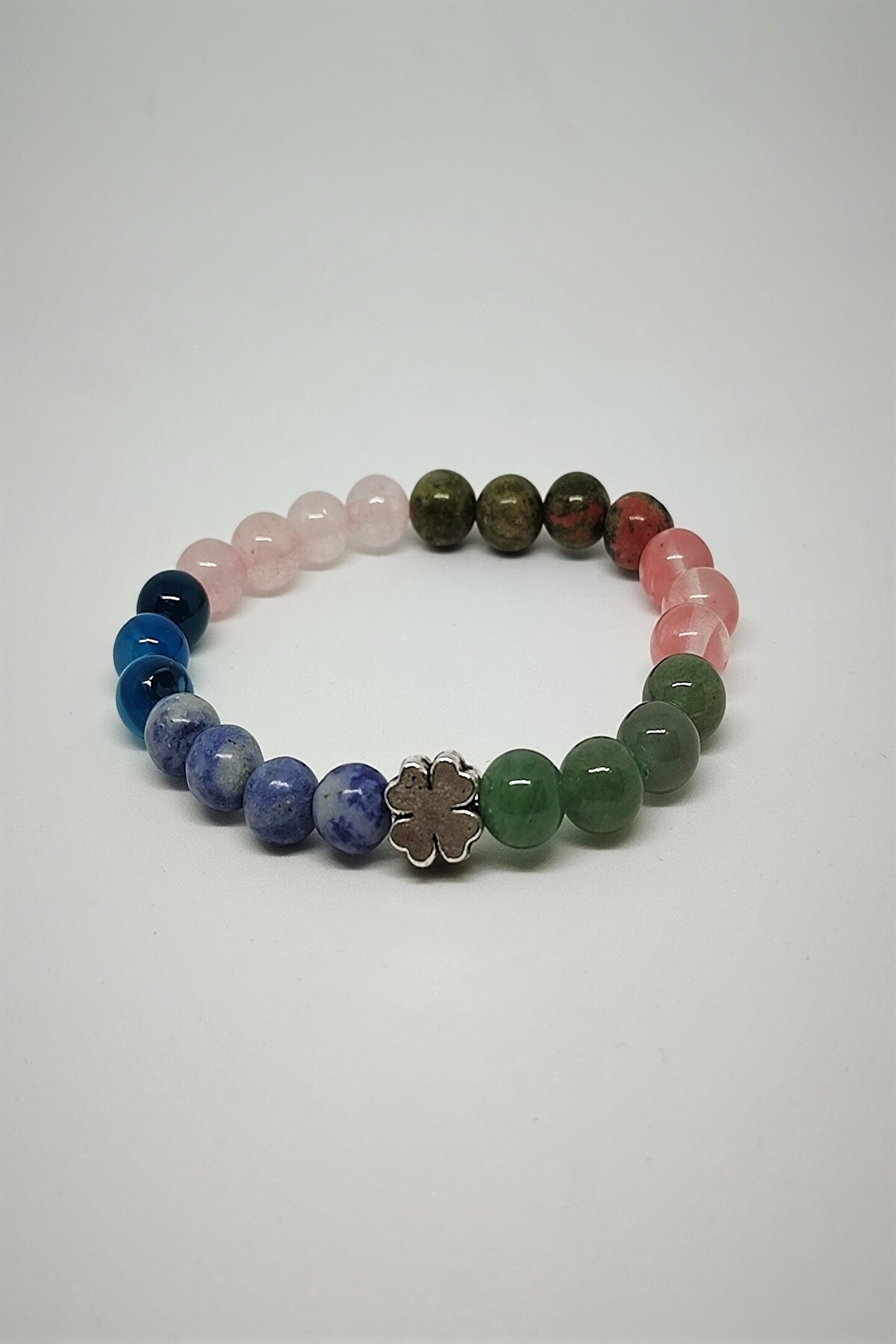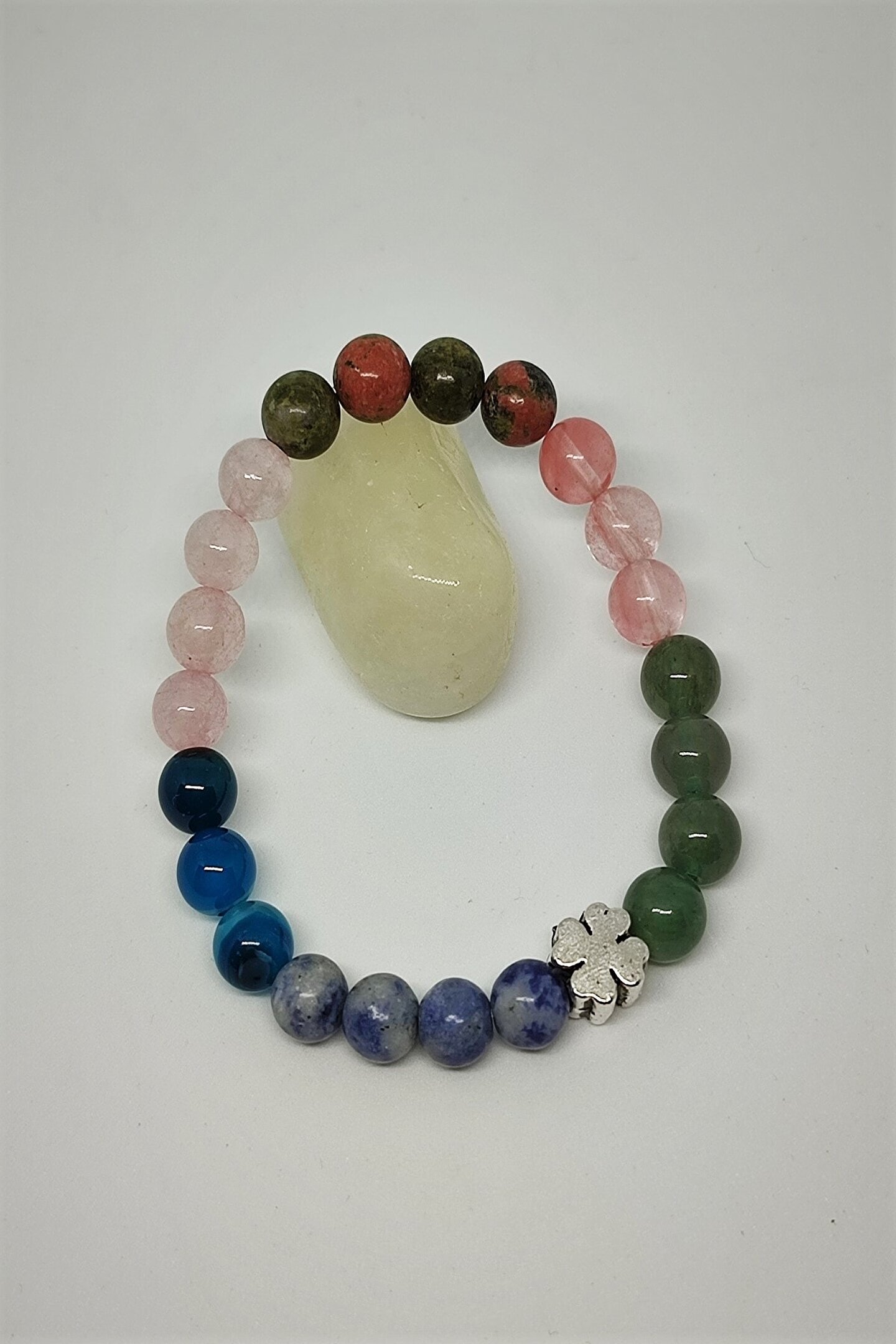 Aventurin, gül kuvars, unakit, pembe kuvars ve akik gibi doğal taşlardan oluşan bu bileklik, şıklığınızı tamamlayacak zarif bir aksesuardır; Sertifikalı doğaltaş kullanımı, bilekliğin hem estetik hem de kalite açısından güvenilir bir tercih olmasını sağlar; Doğal taşların benzersiz desenleri ve renkleri, her kıyafetle uyum sağlayarak kişisel tarzınıza özgün bir dokunuş katar; Bu bileklik, günlük kullanım için idealdir ve her ortamda rahatlıkla takılabilir;