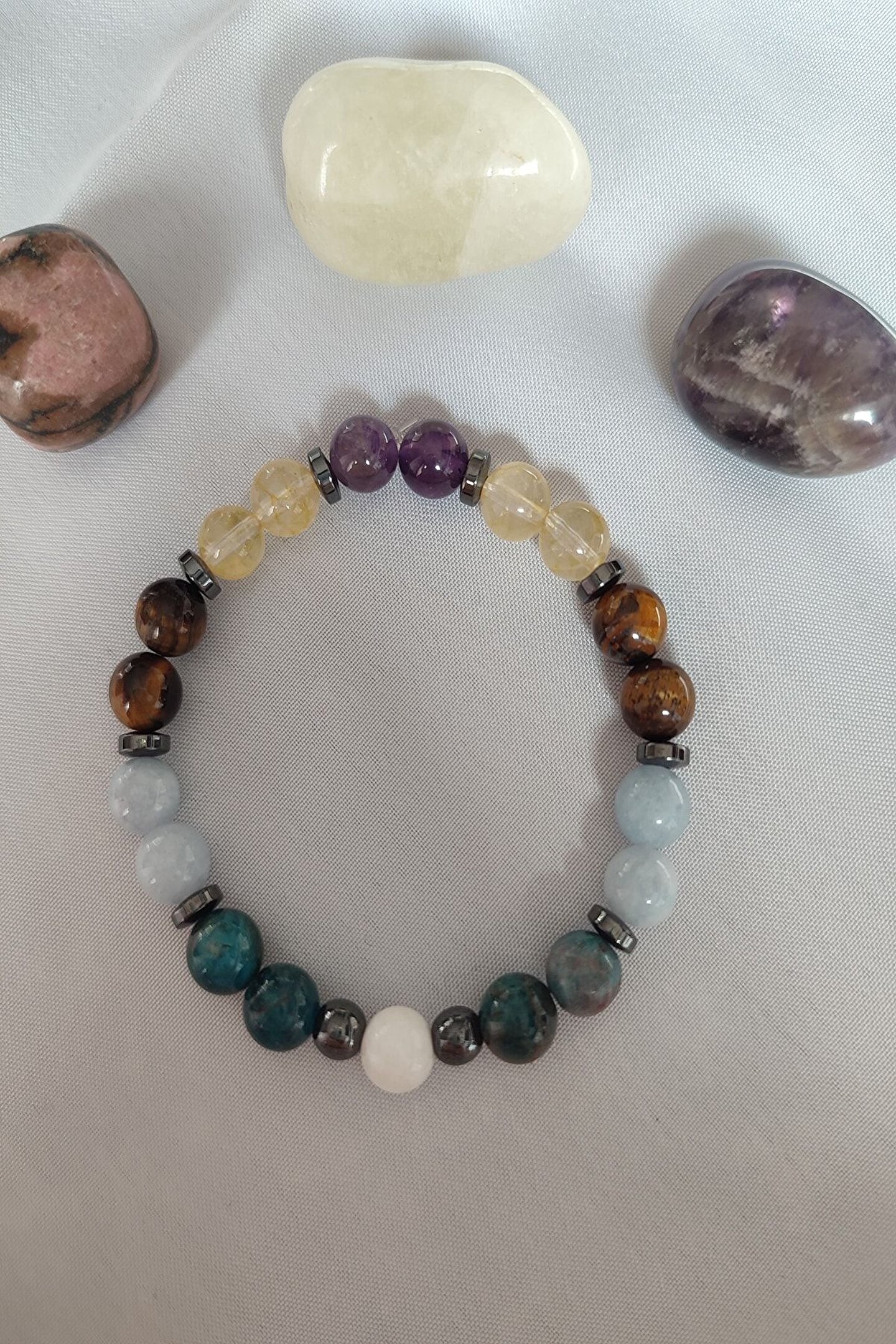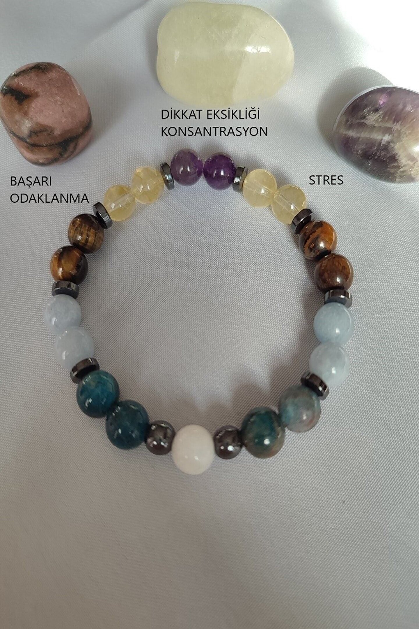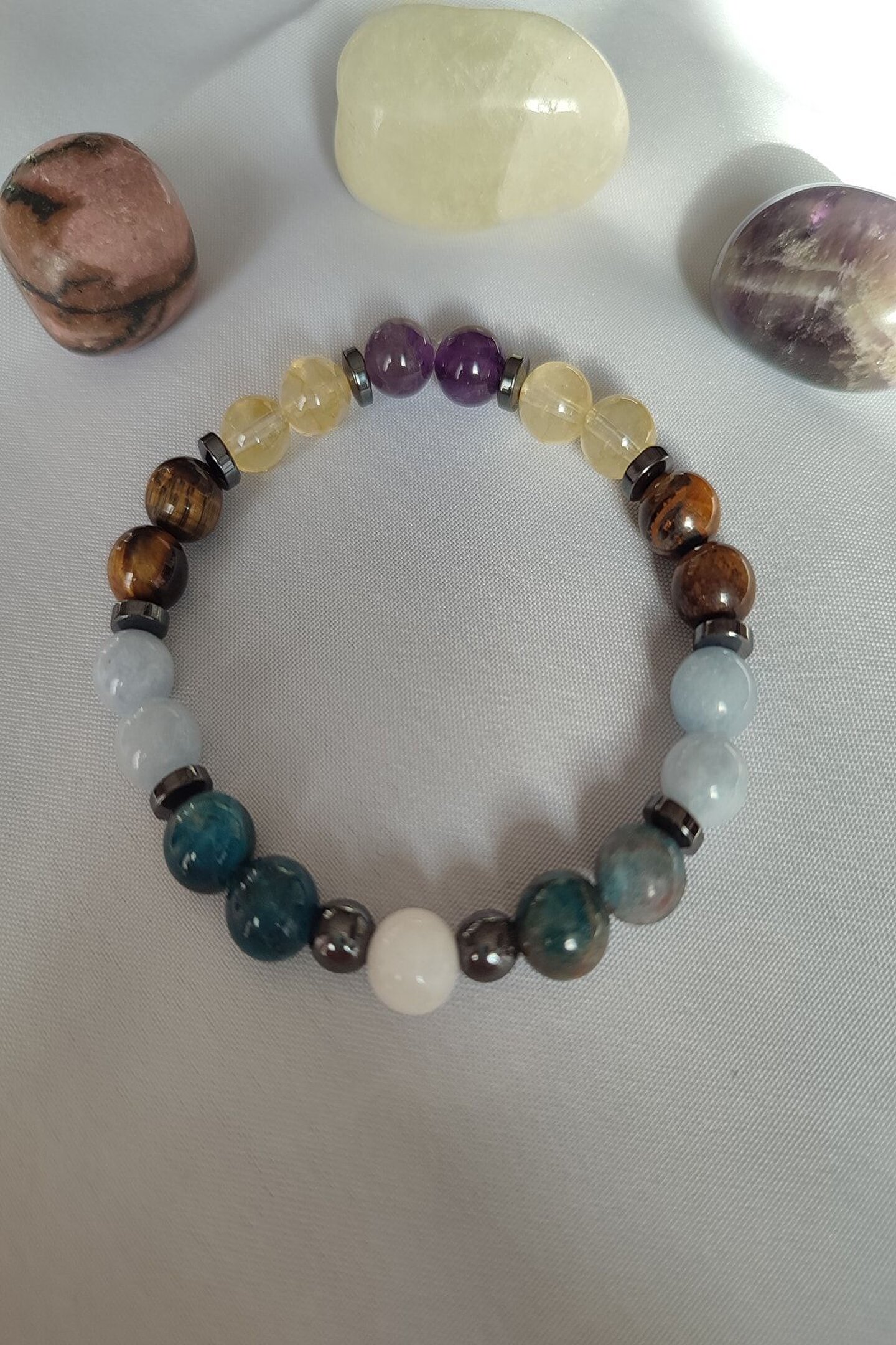 Doğal taş bileklik, şıklığınızı tamamlayacak zarif bir aksesuardır; Sertifikalı ay taşı, apatit, akuamarin, kaplan gözü, sitrin, ametist ve hematit gibi değerli taşlarla süslenmiştir; Her bir bileklik, benzersiz ve otantik bir görünüm sunar, günlük kullanım için idealdir; Doğal taşların eşsiz renk ve desenleri, her kıyafetle uyum sağlayarak stilinizi öne çıkarır; Bileklik, hem günlük kullanım hem de özel günler için mükemmel bir hediye seçeneğidir;