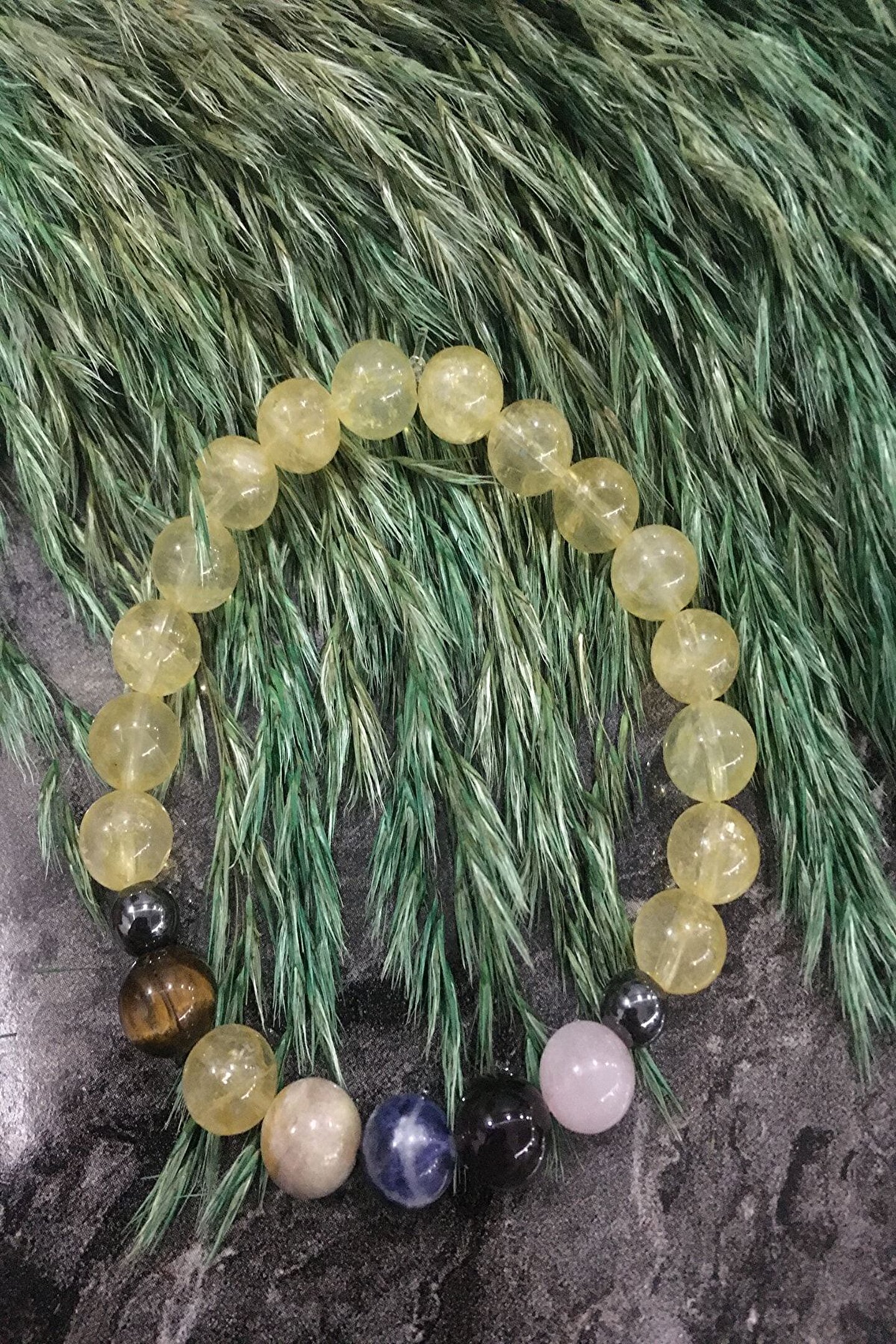 - Doğal taş bileklik, şıklığı ve doğallığı bir arada sunar; her biri farklı enerjilere sahip olan sitrin, ametist, pembe kuvars, amazonit, sodalit ve kaplan gözü taşlarından oluşur; - Çakra dengeleme özelliği sayesinde, her bir bileklik parçasının kendine özgü enerjisi ile vücudunuzdaki enerji dengesini destekler ve genel refahınızı artırır; - Bijuteri bileklik, günlük kullanım için idealdir; hem işlevsel hem de estetik bir aksesuar olarak stilinizi tamamlar;