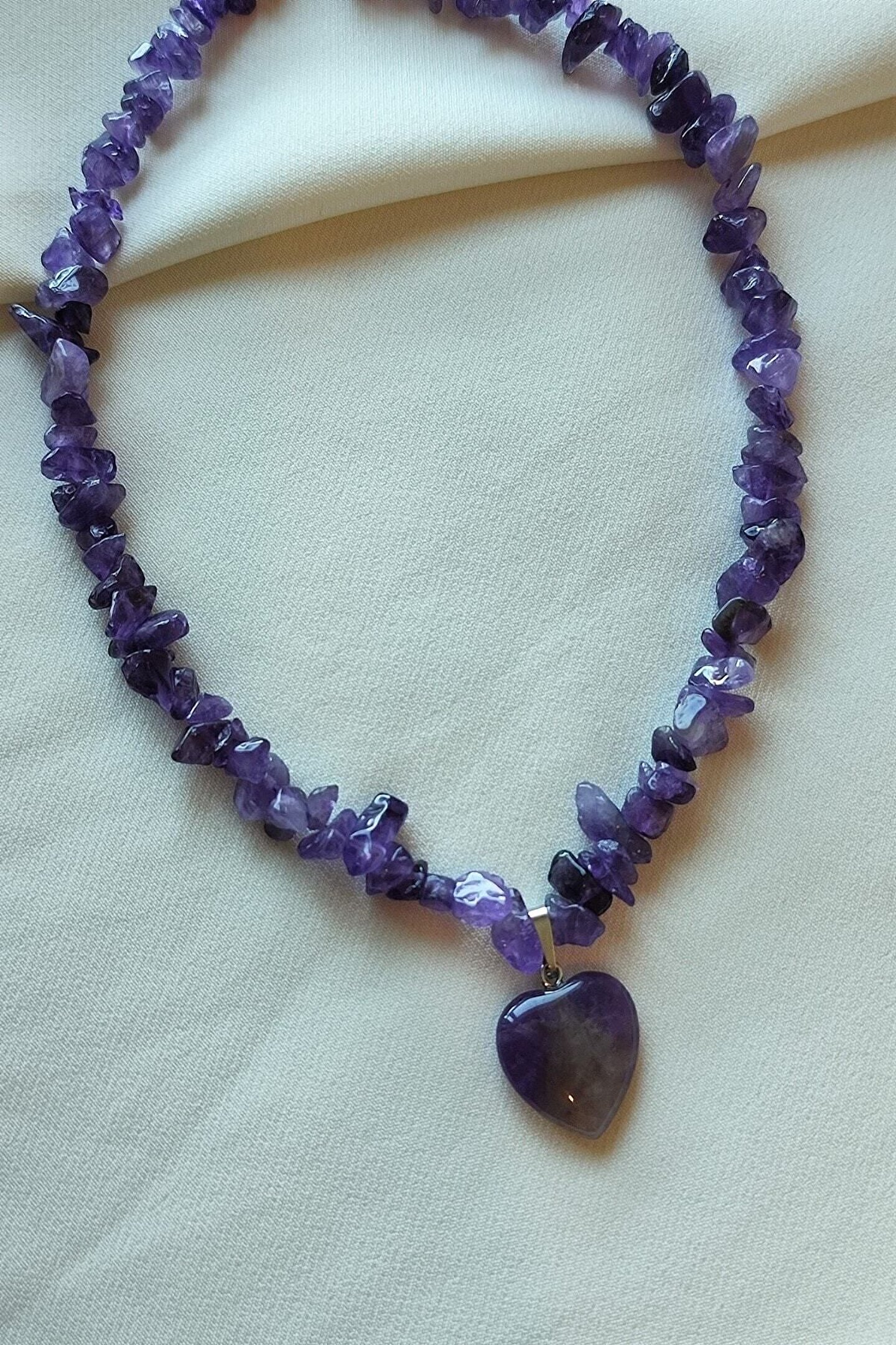 - Doğal taş kullanımı sayesinde her kolye benzersiz ve otantik bir görünüm sunar; - Koyu ametist taşı, şıklığı ve zarafeti bir arada barındırarak her kıyafetle uyum sağlar; - Kalp kırıktaş doğaltaş, hem estetik hem de sembolik bir anlam taşır; sevgiyi ve kırılganlığı temsil eder;