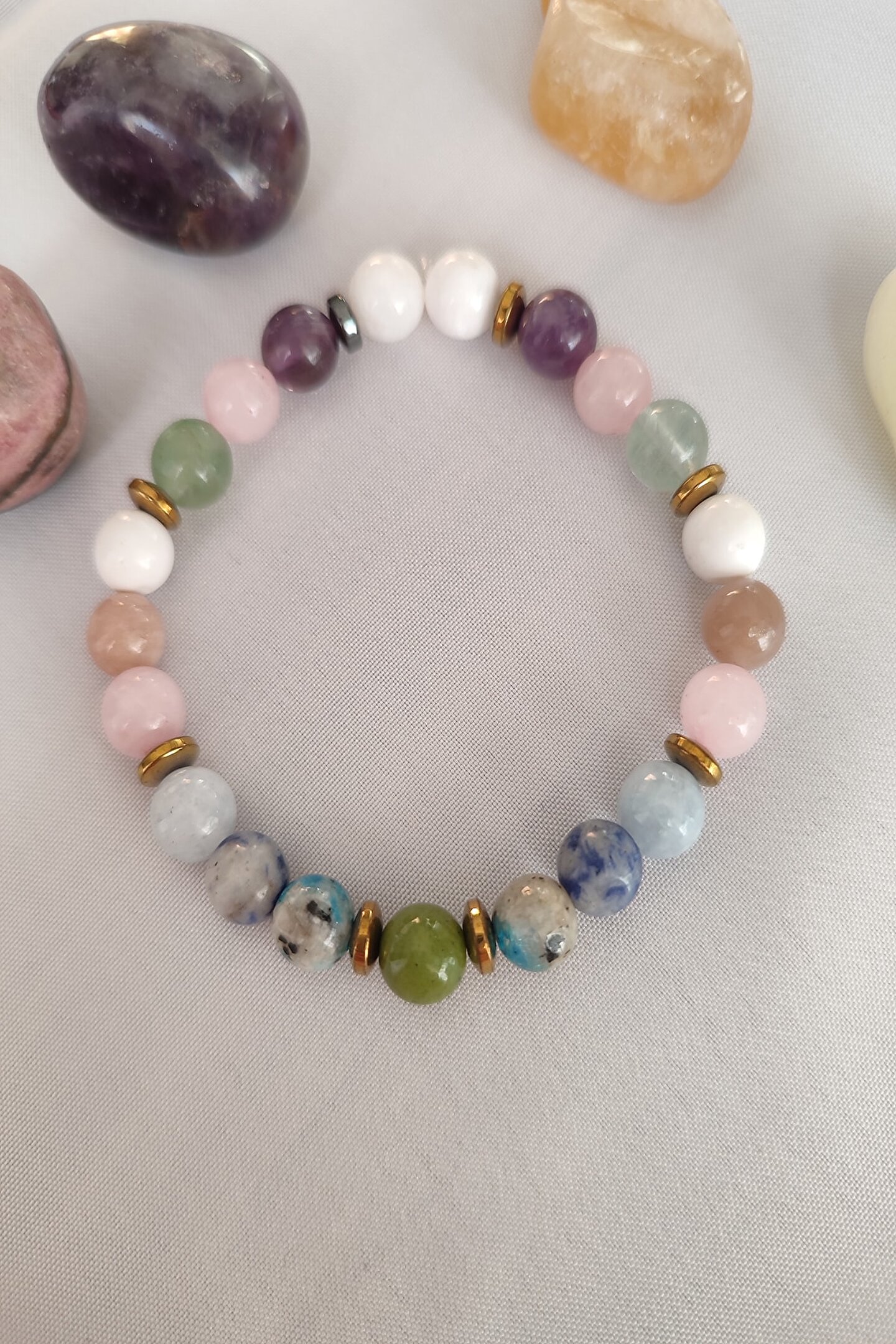 - Doğal taşların eşsiz güzelliğini bileğinizde hissedin: Yeşim, dumortireit, sodalit, akvaryum, güneş taşı, ay taşı, ametist, florit ve havlit gibi farklı türlerdeki doğal taşlarla tasarlanmış bu bileklik, her parça benzersiz bir dokunuş sunar; - Her bir bileklik, doğanın saf enerjisini ve zarafetini yansıtır: Bu bileklik, sadece şıklığınızı tamamlamakla kalmaz, aynı zamanda doğanın gücünü ve güzelliğini bileğinizde taşımanızı sağlar; - El yapımı ve özgün tasarım: Her bir bileklik, ustalıkla işlenmiş ve özenle seçilmiş taşlarla özenle hazırlanmıştır. Bu sayede her bir parça, hem kaliteyi hem de estetiği ön planda tutar; - Her bileklik, kişisel tarzınıza uyum sağlar: Farklı renk ve desenlerdeki taşlarla tasarlanan bu bileklikler, her türlü kıyafetle kolayca uyum sağlayarak stilinizi tamamlar; - Doğal taşların faydaları: Doğal taşlar;