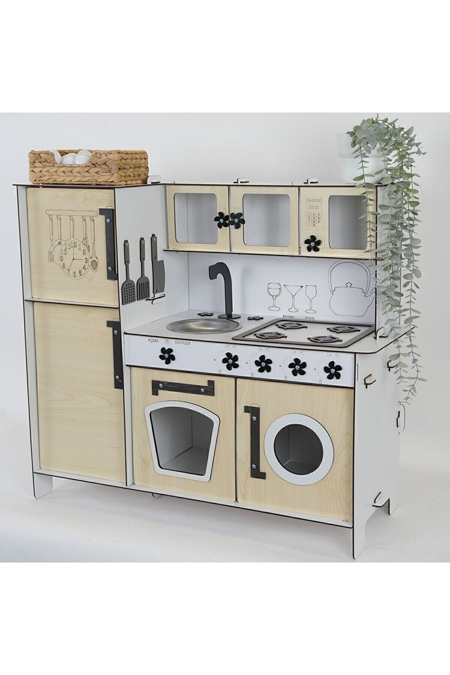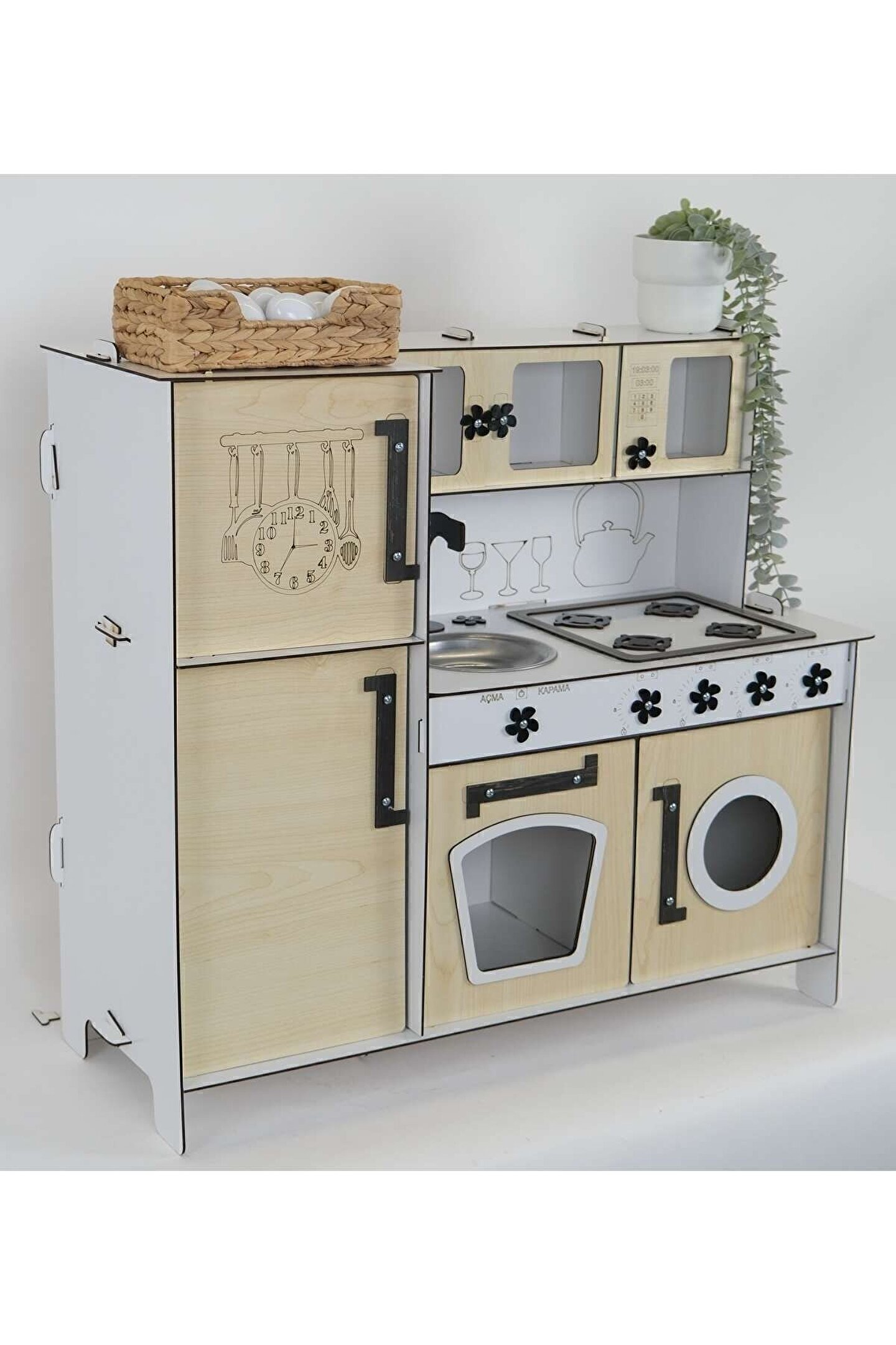 Yükseklik 70 cm. Genişlik 80 cm. ; Malzemesi 1. Sınıf 3 mm ÇİFT YÜZ MDF'dir. ; Doğum günü hediyesi olarak tercih edilen ürünler arasındadır. Evcilik oyuncakları , oyuncak mutfak setleri, eğitici oyuncaklar , kız çocuk oyuncakları alanında tercih edildiği gibi erkek çocuklar içinde oldukça talep gören bir oyuncaktır. ; Montessori etkinlikleri ne uygun olarak tasarlanmıştır, çocuklarının hayal gücünü ve motor becerilerini geliştirir. ; Bu ürün 3mm'dir. 6mm ürün için "Ahşap Oyuncak Mutfak 6mm olarak inceleyebilirsiniz, inceymiş açıklaması ile iade kabul edilmemektedir, 3 mm olarak binlerce kişi memnun kullanmaktadır. Paket içerisinde kurulum kılavuzu vardır yine de kurulum esnasında sorularınız olursa kılavuzun arkasındaki numaradan ulaşabilirsiniz. ; Kargoda hasar görmemesi için özenle paketlenmektedir, olası bir hasar durumunda parçalar ücretsiz olarak kargo edilir. Boyalı olduğundan boya için ayrıca uğraşma gerektirmez sadece kurulum yaparak kullanıma başlayabilirsiniz. 9 renk alternatifi vardır tercih ettiğiniz renk üzerinden sipariş verebilirsiniz.