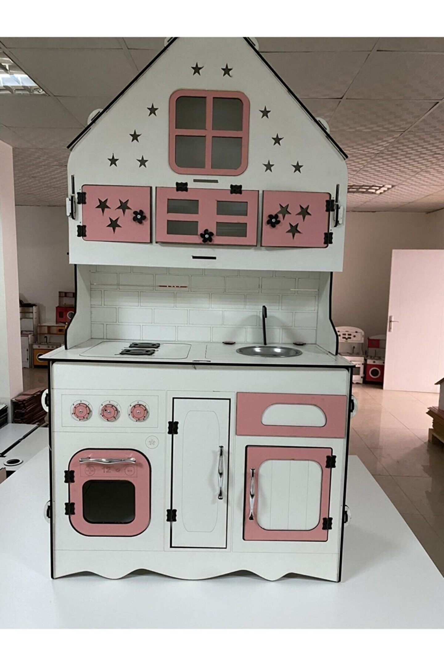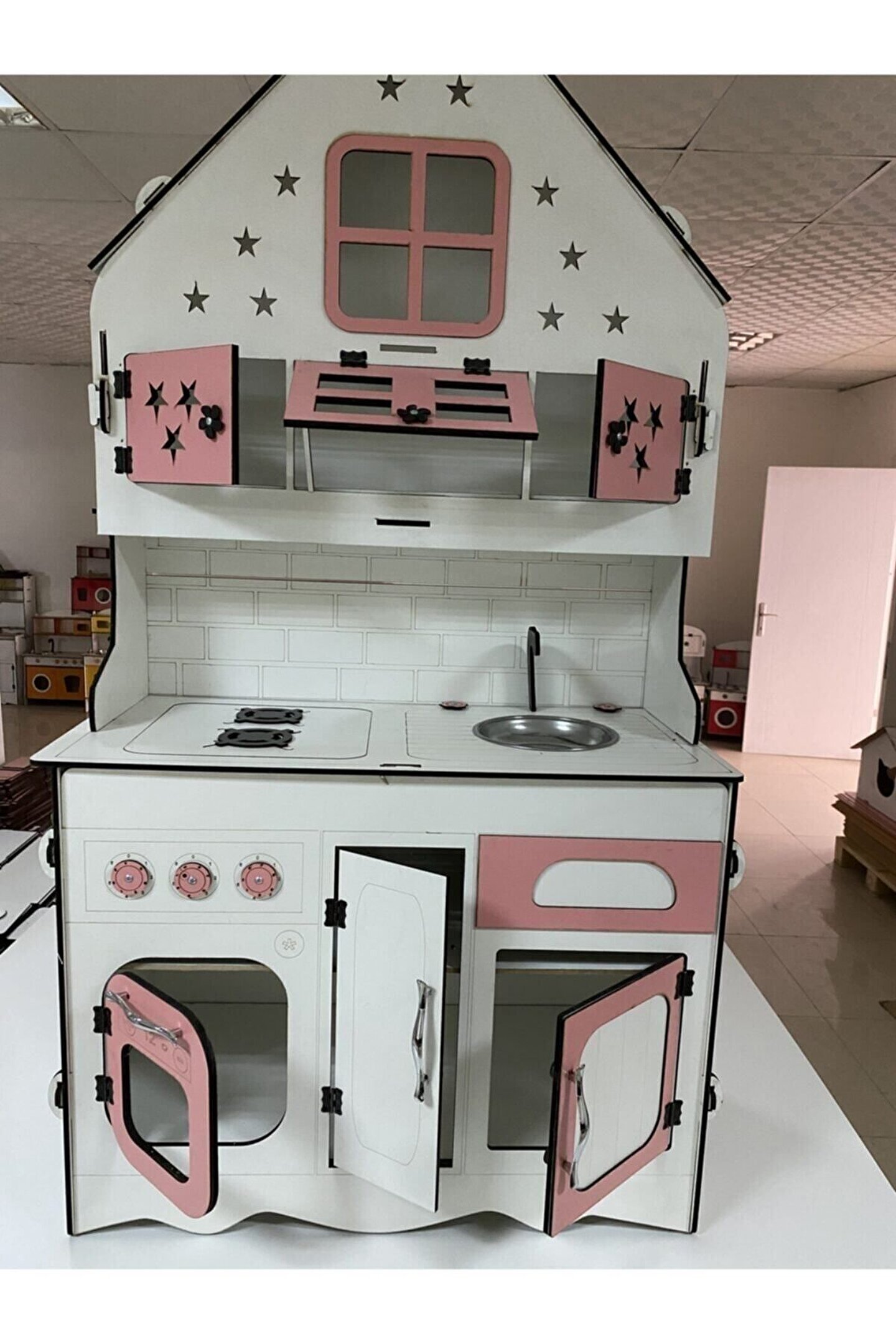 Ürün kendi tasarım ve kendi imalatımızdır piyasada eşi benzeri yoktur yüksekliği 145 cm eni 77 cm dir. ; Çocukların rahatlıkla ayakta oynayabileceği boyuttadır. ; Ürün 6.4 mm orijinal MDF'den üretilmektedir sağlam ve dayanıklıdır. ; İsteğe göre ışık takılabilir, çatı katındaki pencere ve yıldızlardan ışık çıkıyor ışıklı model fiyatı +125 TL'dir. Ürünümüzde kargoda veya kurulum sırasında kırılma olursa parça firmamız tarafından ücretsiz gönderilmektedir. ; Çocukların motor becerileri ve hayal güçleri gelişimini destekleyen harika tasarım gelişim oyuncağıdır ; Ürünümüzü sipariş verdikten sonra msj ile renk belirtebilirsiniz, renk belirtilmezse görseldeki ürünün aynısı gönderilir. ; Doğum günü hediyesi olarak tercih edilen ürünler arasındadır. Evcilik oyuncakları , oyuncak mutfak setleri, eğitici oyuncaklar , kız çocuk oyuncakları alanında tercih edildiği gibi erkek çocuklar içinde oldukça talep gören bir oyuncaktır. ; Not; ürün özellikleri, ölçüler ve kullanılan malzemeler açıkça belirtilmiştir. Ürün iadesi kabul edilmemektedir buna göre sipariş verilmesini rica ederiz ;