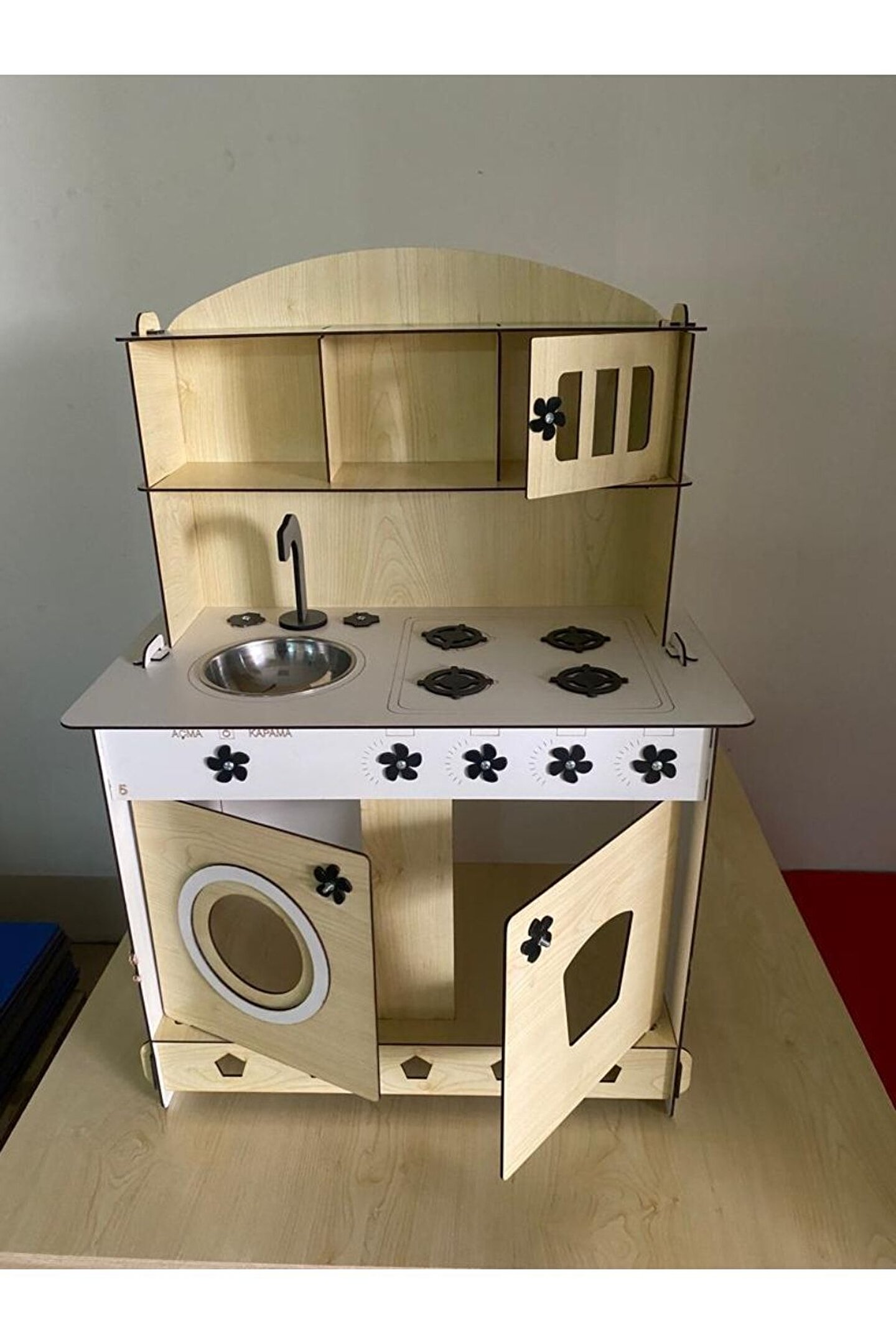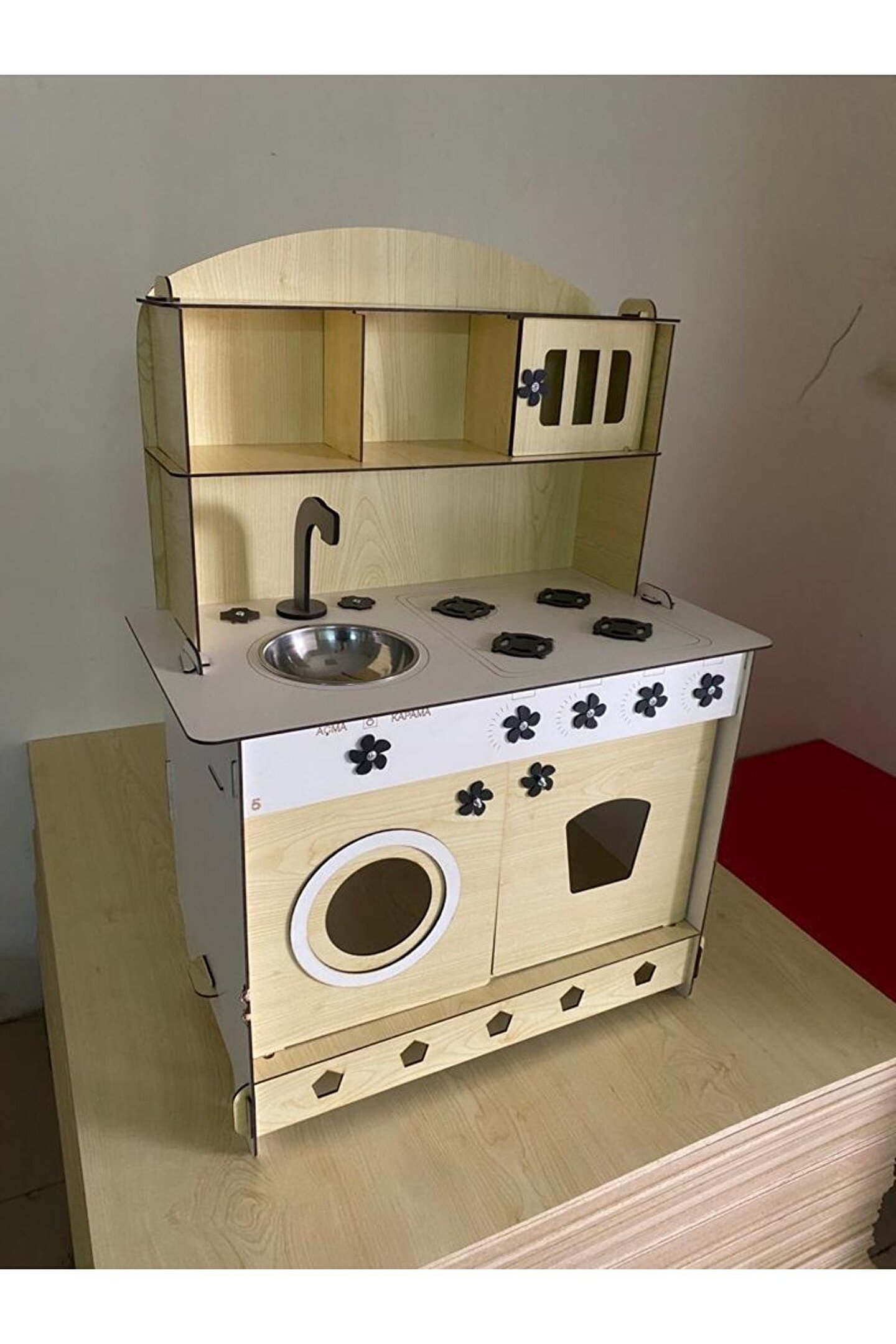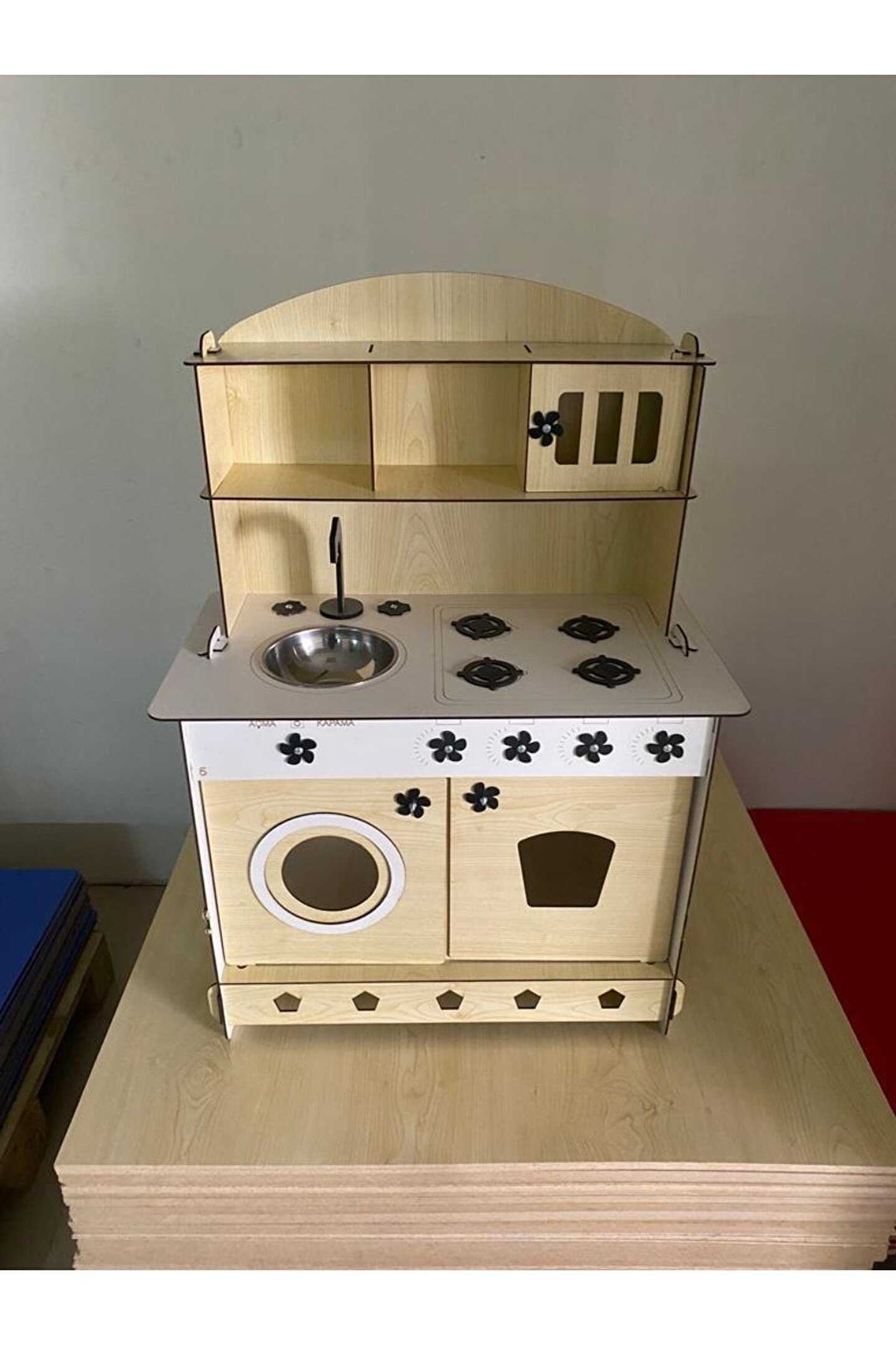 Ürün kendi imalatımız olup 3mm 1. sınıf MDF'den üretilmiştir. ; Genişlik 60cm, Yükseklik 84cm, Derinlik 40cm'dir. ; Paket içerisinde kullanım kılavuzu vardır yine de kurulum esnasında sorularınız olursa kılavuzun arkasındaki numaradan ulaşabilirsiniz. ; Bu ürün 3mm'dir. 6mm ürün için "Ahşap Oyuncak Mutfak 6mm" olarak inceleyebilirsiniz. Her iki üründe aynı ölçü ve özelliklerdedir sadece kalınlık farklıdır çok inceymiş açıklaması ile iade kabul edilmemektedir, 3 mm olarak binlerce kişi memnun kullanmaktadır. ; Kargoda hasar görmemesi için özenle paketlenmektedir, olası bir hasar durumunda parçalar ücretsiz olarak kargo edilir. ; MDFLAM olduğundan ürün boyalı gönderilmektedir boya için ayrıca uğraşma gerektirmez sadece kurulum yaparak kullanıma başlayabilirsiniz. ; 12 renk alternatifi vardır tercih ettiğiniz renk üzerinden sipariş verebilirsiniz. ;