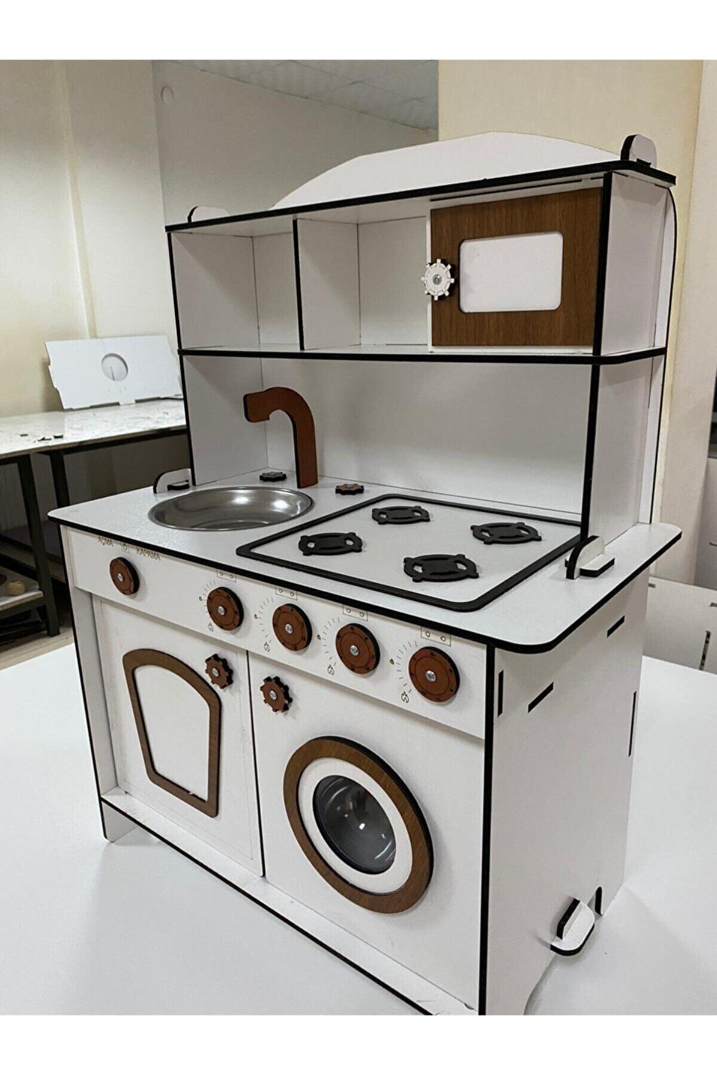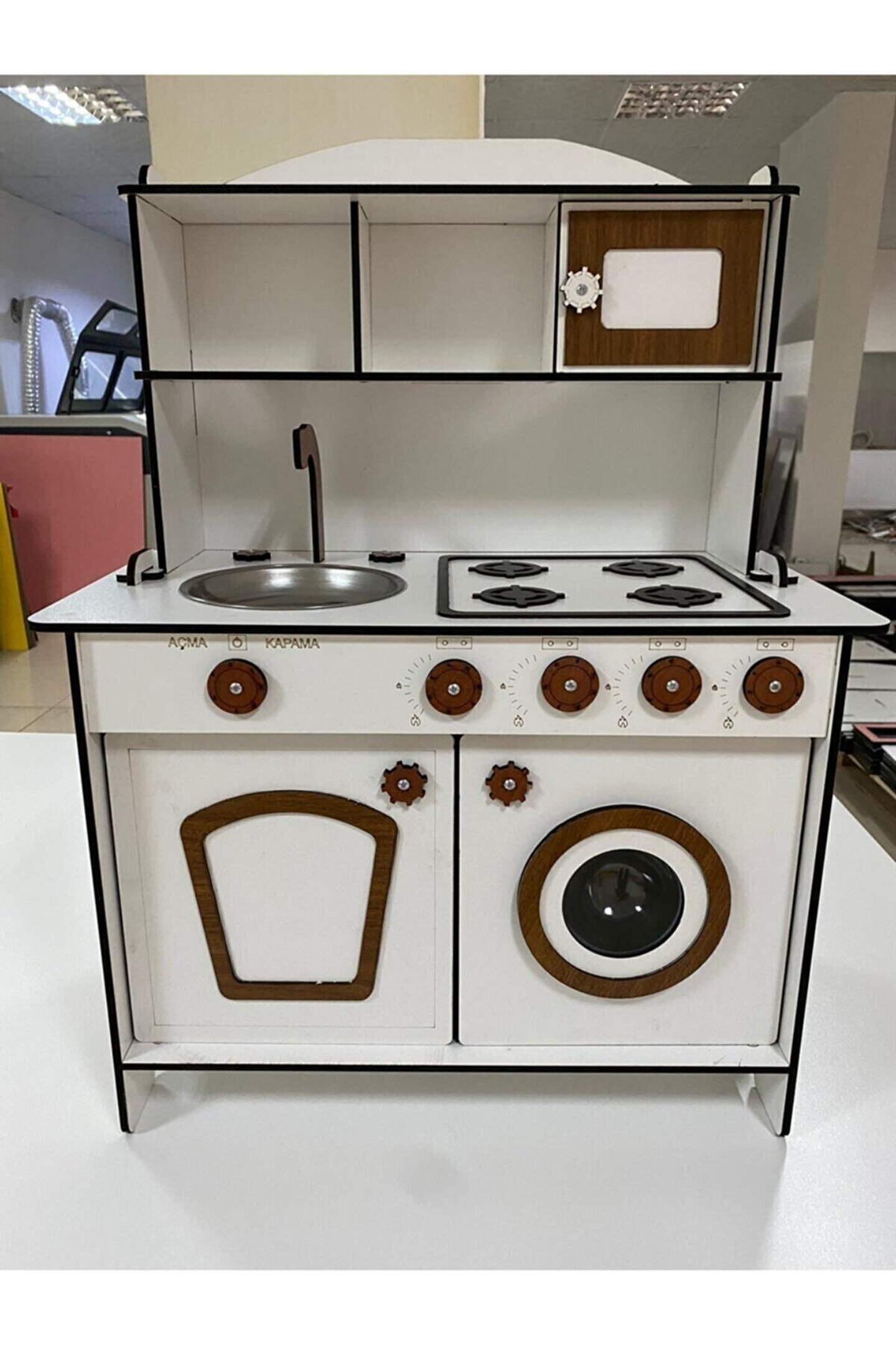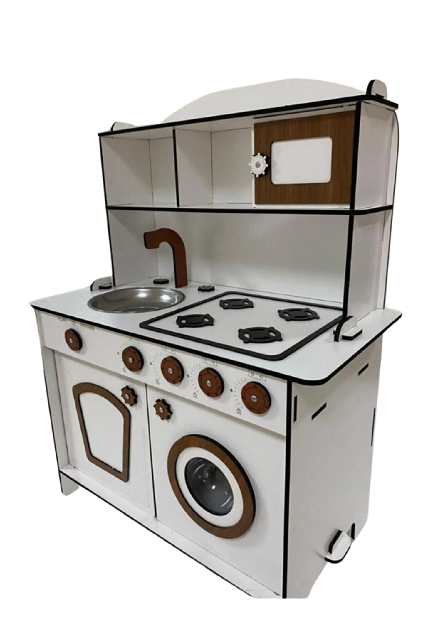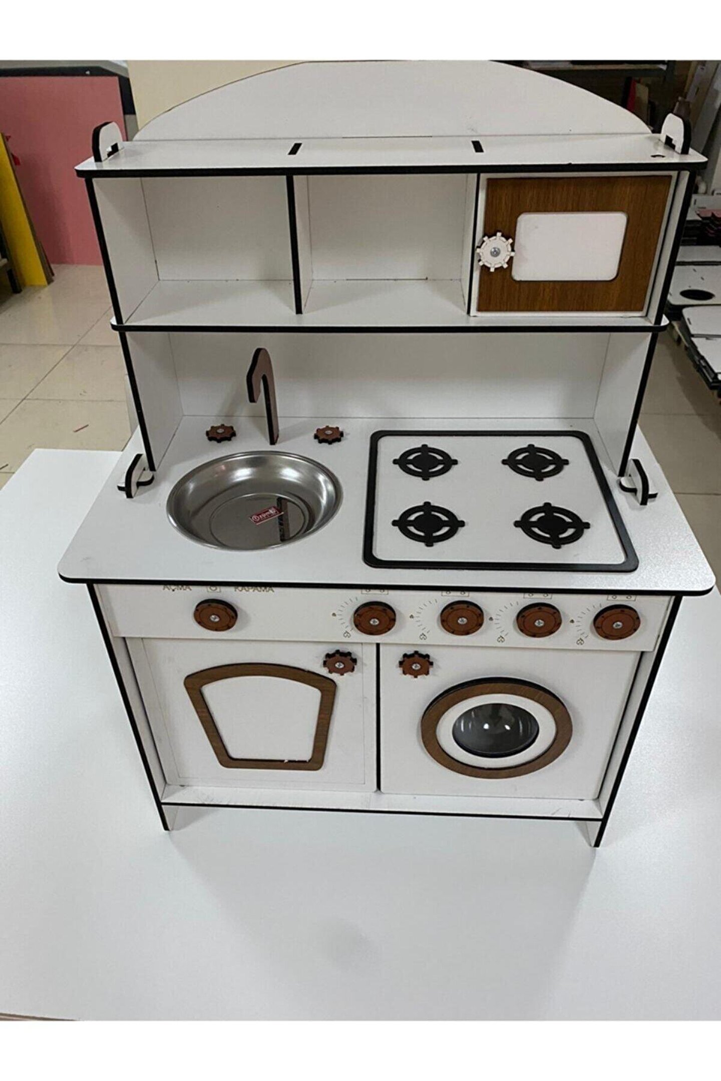 ? Pembe kaplamalı 6mm MDFLAMmalzemeden el yapımı. ?Yükseklik 80cm, genişlik 60cm. 3 yaş ve üstü çocuklar için saatlerce yaratıcı oyun sağlamak üzere tasarlanmıştır. ; Ocak, lavabo, musluk, çamaşır makinesi ve kapılı depo rafları ile birlikte gelir. ; Gerekli tüm parçaları içerir: Vidalar, mandallar ve kulplar. ; Dayanıklı yapısı uzun ömürlü kullanım sağlar. ; Düğmeler, kadranlar ve musluklar gibi gerçekçi detaylar. ; Gerçekçi pişirme deneyimi için set üstü ocakta dört brülör vardır. ; Çamaşır makinası menteşelidir ve gerçek bir makina gibi açılabilir. ; Tüm donanımlarıyla interaktif bir ortam yaratır. ; Güvenlik standartlarına uygun, toksik olmayan malzemelerden üretilmiştir. ; Oyuncak mutfak yaratıcılığı teşvik eder ve motor becerilerini geliştirir. ; Herhangi bir odaya veya köşeye sığacak mükemmel boyut. ; Çocuğunuz yemek pişiriyor, bulaşık yıkıyor, yemek hazırlıyor ve misafirlere servis yapıyormuş gibi davranarak saatlerce eğlenecek. ; Herhangi bir kreş veya oyun odasına mükemmel bir katkı ve doğum günleri, noel veya diğer özel günler için harika bir hediye fikridir. ; Doğum günü hediyesi olarak tercih edilen ürünler arasındadır. Evcilik oyuncakları, oyuncak mutfak setleri, eğitici oyuncaklar, kız çocuk oyuncakları alanında tercih edildiği gibi erkek çocuklar içinde oldukça talep gören bir oyuncaktır. ; ;