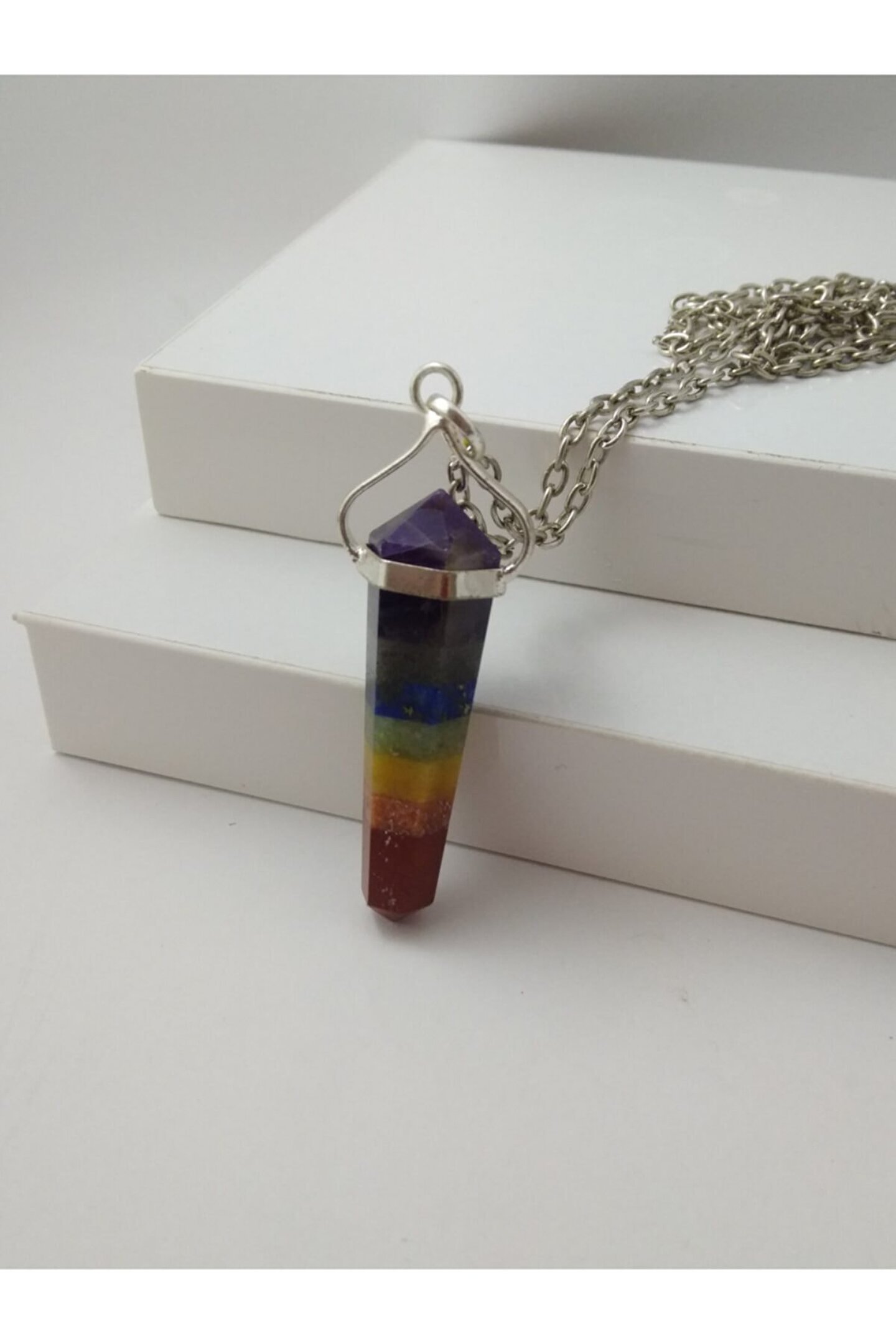 Çakra taşı kolye/ pandül şeklinde doğaltaş kolye Çakralar, bedenimizde bulunan enerji merkezleridir. Çakra sistemindeki temel amaç bedenin enerji merkezlerini harekete geçirerek sağlıklı çalışmasını sağlamak, ruhsal ve bedensel bütünlüğü oluşturmaktır. Ürünün özellikler I; Ürünlerimiz gerçek doğal taş olup pandül şekli ile tasarlanmıştır. Gövde kısmındaki metal gümüş olup, zincir gümüş değildir. Çakra kolyeleri, değişik 7 renkten oluşur. Her bir renk bir çakra katmanını simgeler. Ürünümüzde kullanılan çarka taşları; ametist, oniks, lapis lazuli,aventurin, sitsin, akik, jasper Ürünümüz size hediye kutusu içinde gönderilecektir. Parfüm, alkol v.B. Gibi maddeler ile temasından kaçınılmalıdır. Boyutu yaklaşık 3,5 cm'dir. 50-55 cm uzun zincir ile gönderim yapılır. Paket içeriği: 1 adet