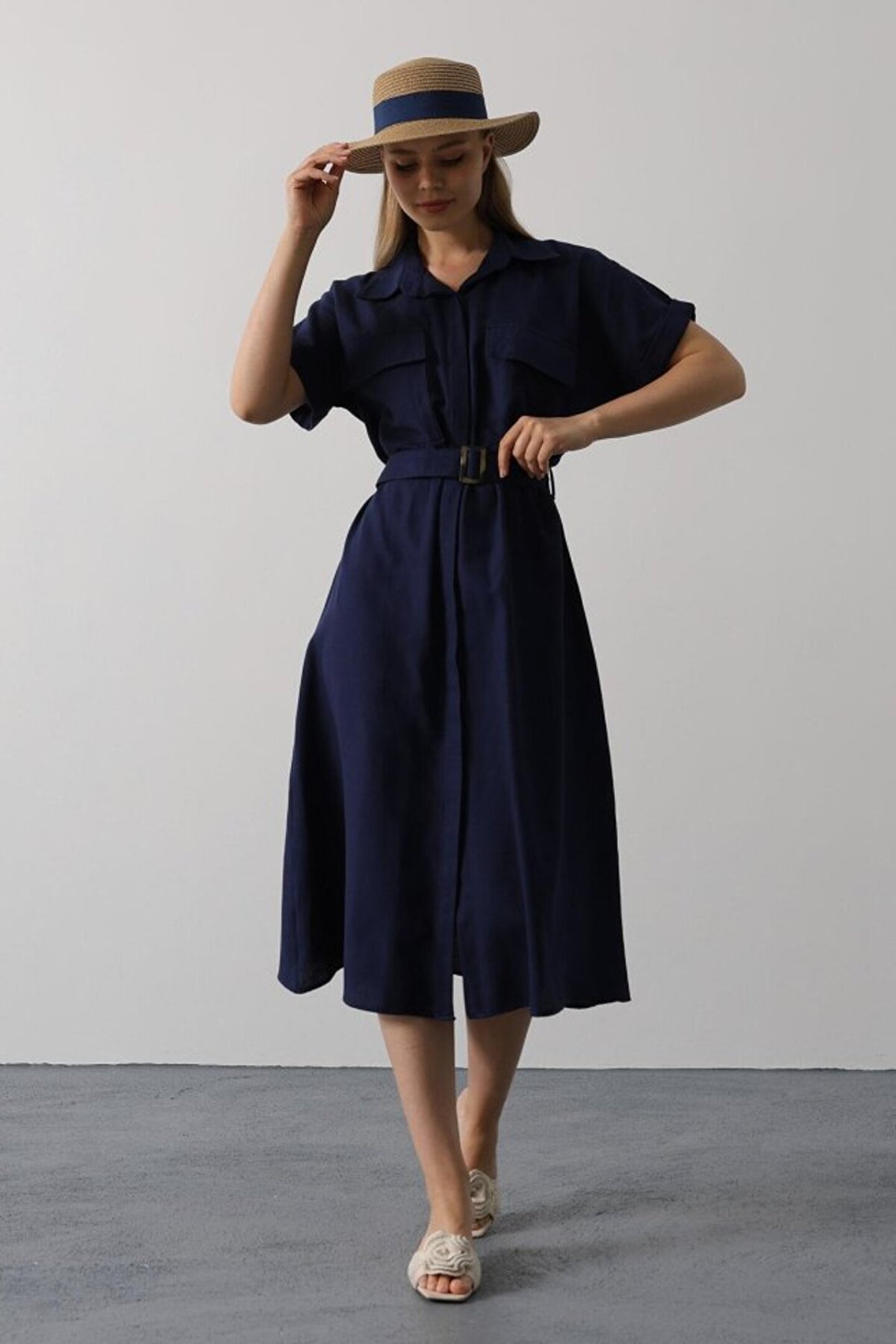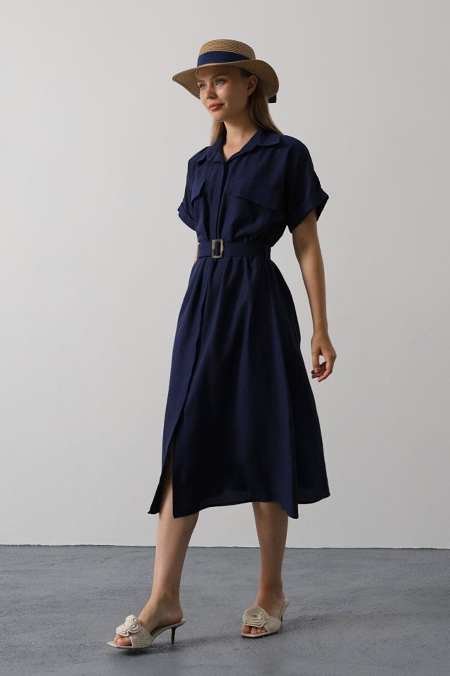 Barış Beauty EQURİ Kuşaklı Cep Detaylı Yarım Kol Elbise - Lacivert