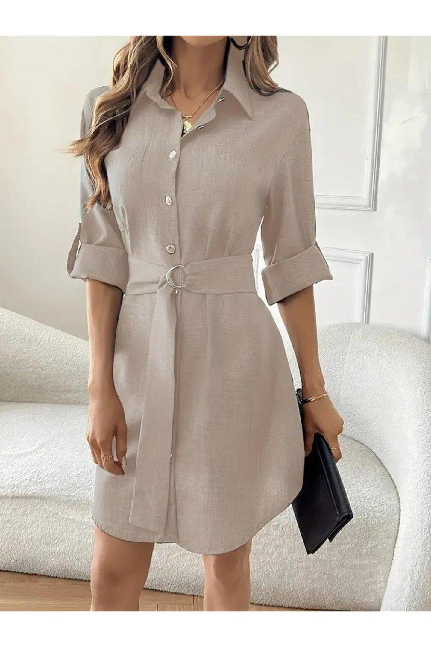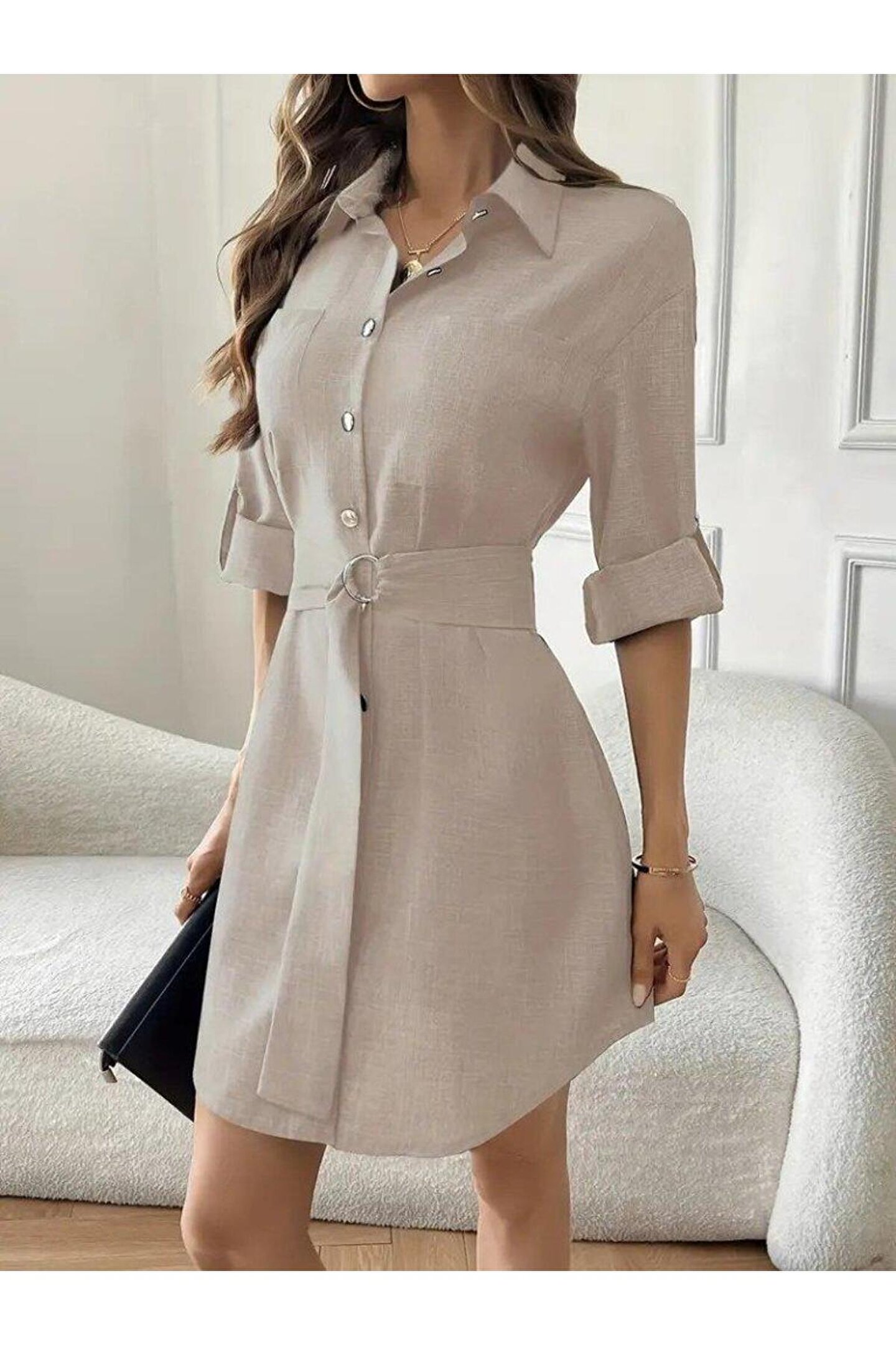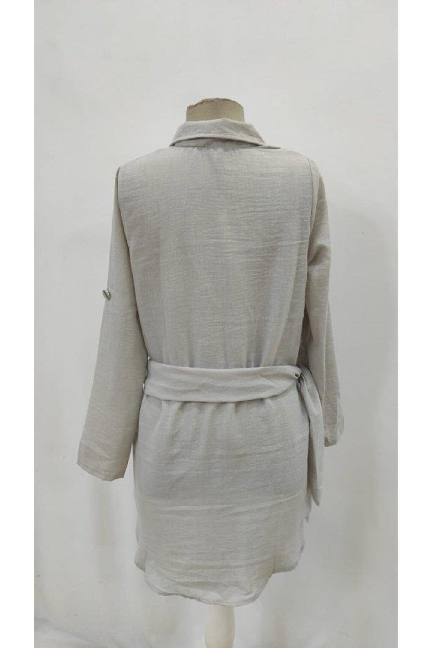 Barış Beauty Kadın Uzun Kollu Yakalı önden Düğmeli Beli Kuşaklı Mini Ithal Keten Elbise