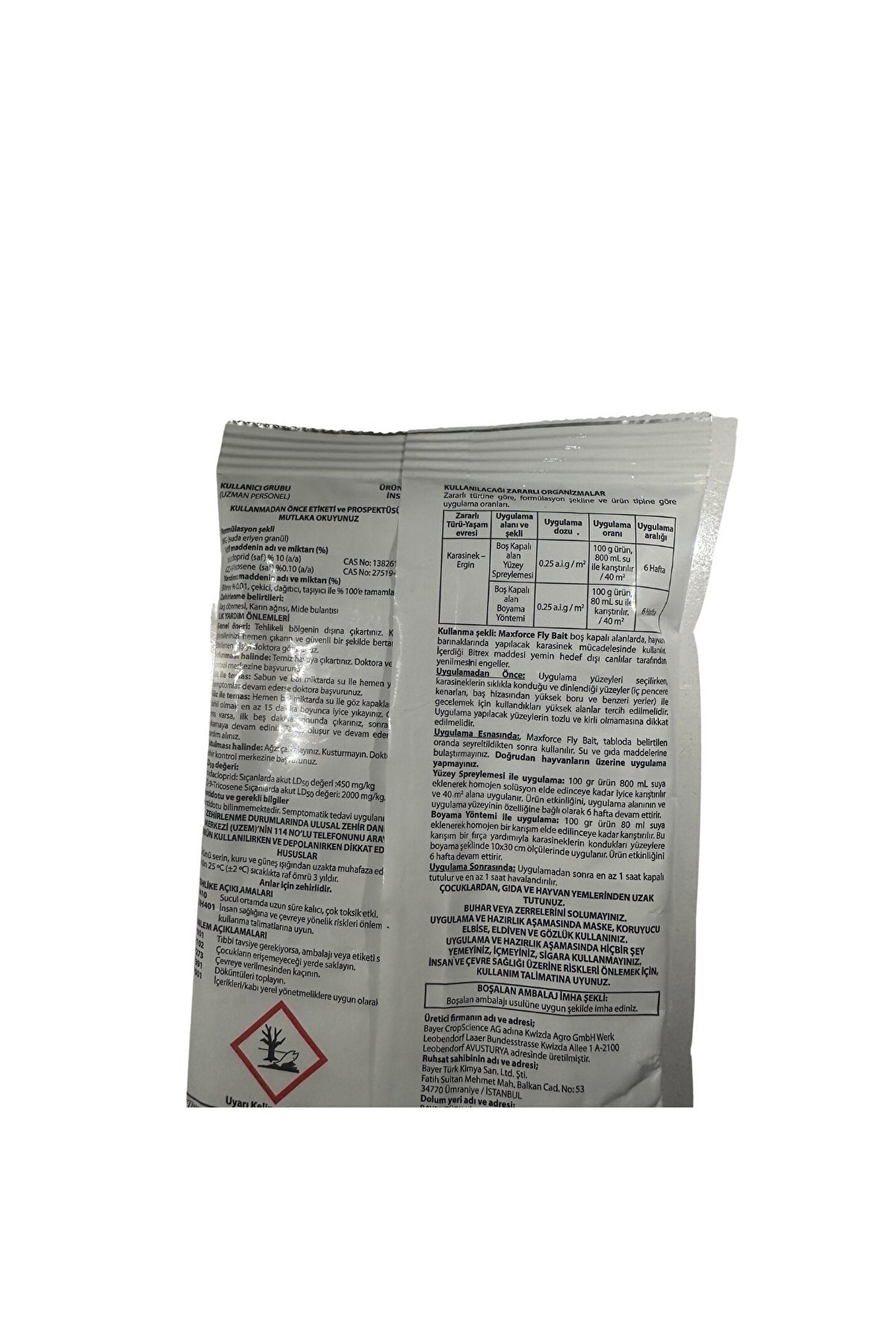 - Karasineklerle mücadelede etkin çözüm sunan Maxforce Fly Bait Karasinek Granülü, evinizin güvenliğini sağlar.; - 100 gram ağırlığındaki bu granül, kolay uygulama imkanı sunarak karasineklerin yaşam alanlarını hızla yok eder.; - Almanya menşeli olan bu ürün, yüksek kalite standartlarına uygun olarak üretilmiştir.; - Pratik sprey formu sayesinde hızlı ve eşit dağılım sağlanır; böylece karasinekler üzerinde maksimum etki elde edilir.; ; Boyama yöntemi: ; 100gr.; MAXFORCE FLY BAİT KARASİNEK İLACI 80 ml’lik suyla boyanabilir bir kıvam elde edinceye kadar karıştırılır.; Hazırlanan bu karışımla 40 m2’lik bir taban alan yada 100 m2’lik duvar yüzeyi ilaçlanabilir.; 10x30cm boyutlarında şeritler halinde 7-8 noktada uygulama yapılır.; Bozuk yüzeylerde ise karışım tavana asılan karton veya polietilen parçalara sürülebilir.; 6-8 hafta etkisini devam ettirir.; ; Sprey yöntemi: ; 1 kg MAXFORCE FLY BAİT KARASİNEK İLACI, 32 lt su ile karıştırılır.; Bu karışım pompa ile 40 mlt / m2 şeklinde uygulanır.; Bu şekilde uygulanan ilaçlamanın etkisi ilaçlanan bölgenin yıkanmaması halinde 4-6 hafta devam eder.; İlaçlanan bölge yıkanırsa kalıcılık giderek azalır.