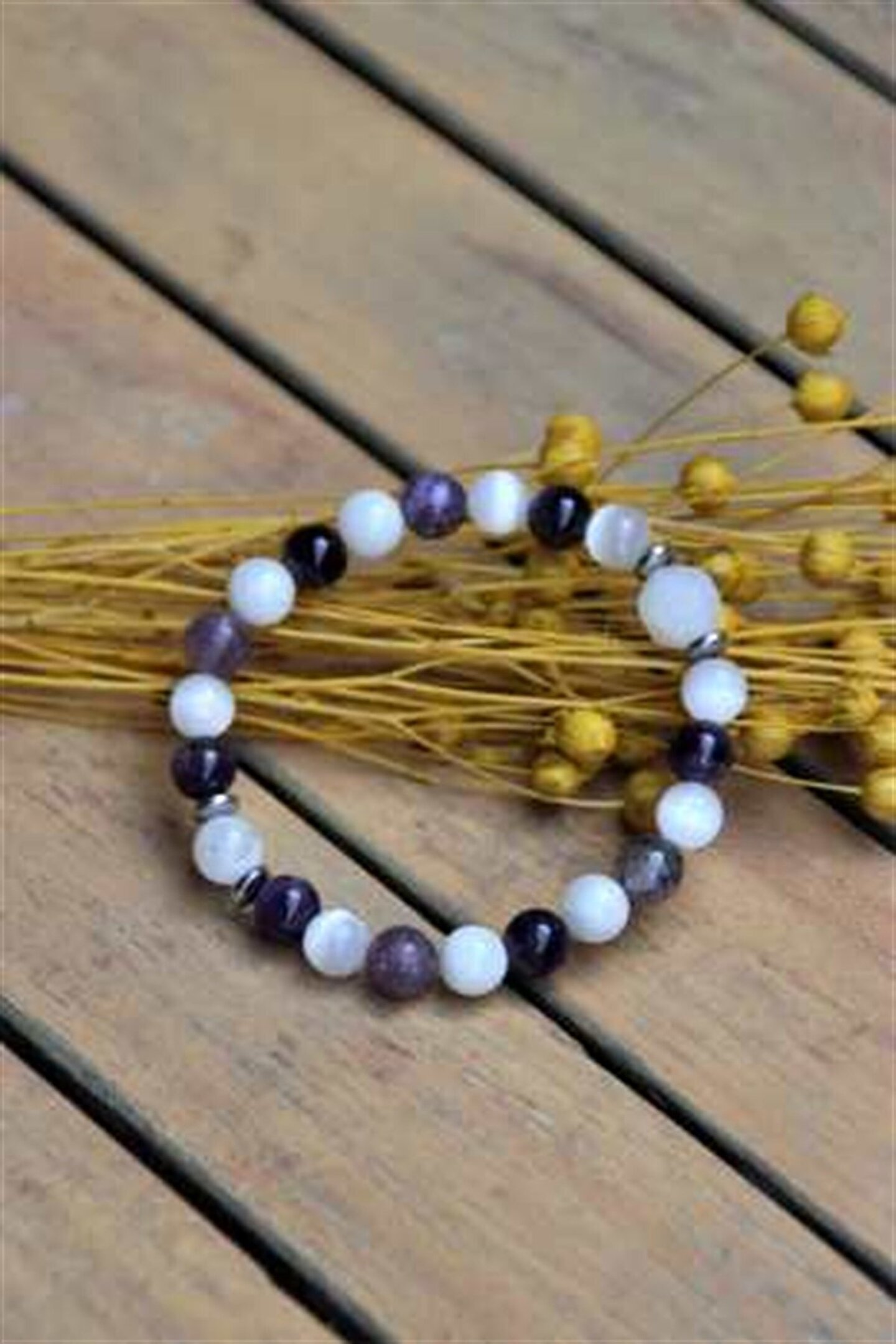 Doğal taş bileklik, şıklığınızı tamamlayacak zarif bir aksesuardır; Ay taşı, ametist ve selenit gibi nadir bulunan doğal taşlardan üretilmiştir; 8 mm boyutundaki bu bileklik, bileğinizde rahat bir kullanım sunar; Doğal taş materyali ile her parça benzersiz ve özgün bir görünüm kazandırır;