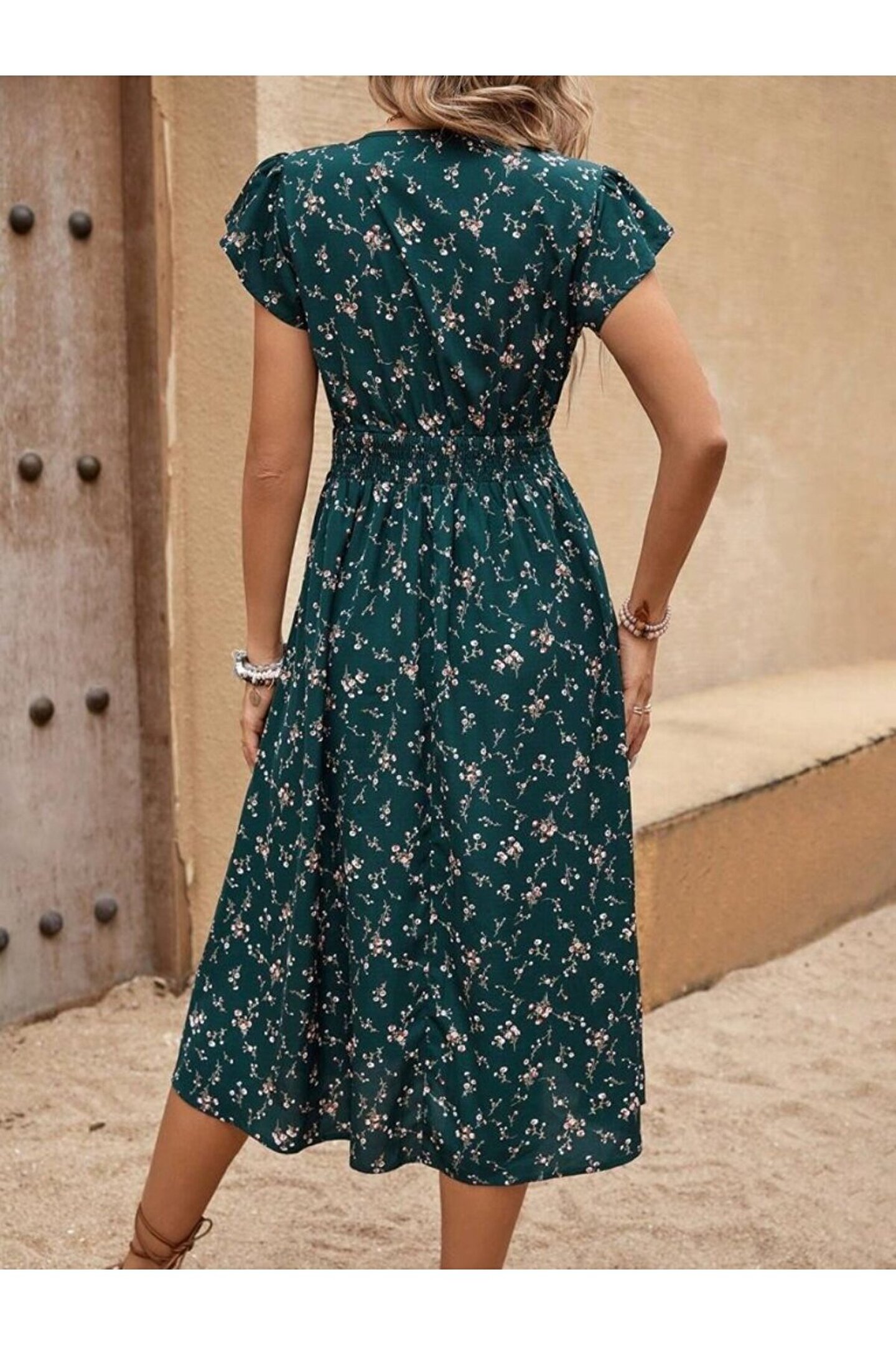 BEFAON EQURİ Kadın Kısa Kollu V Yakalı Beli Lastikli çiçek Desenli Süprem Elbise